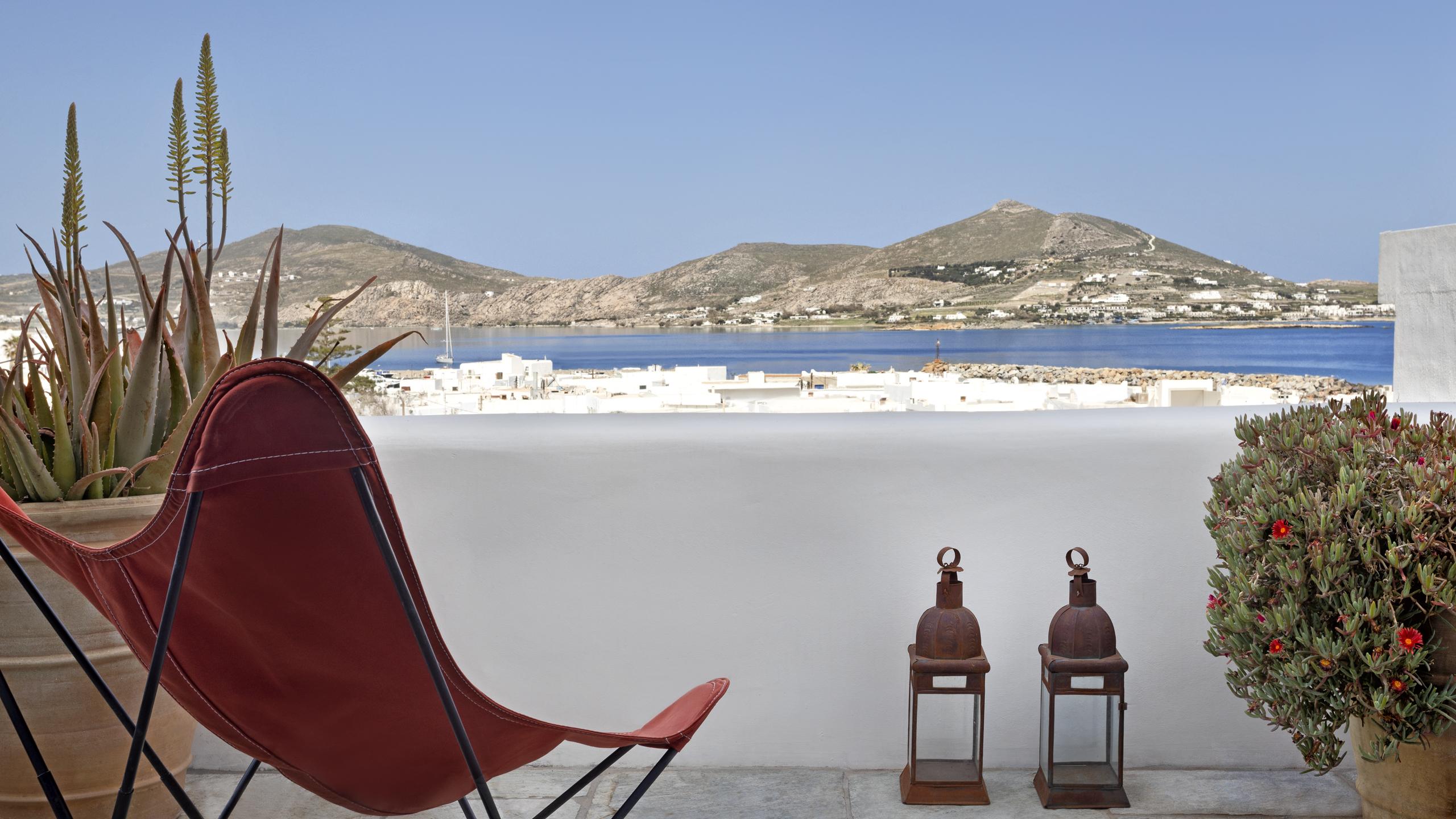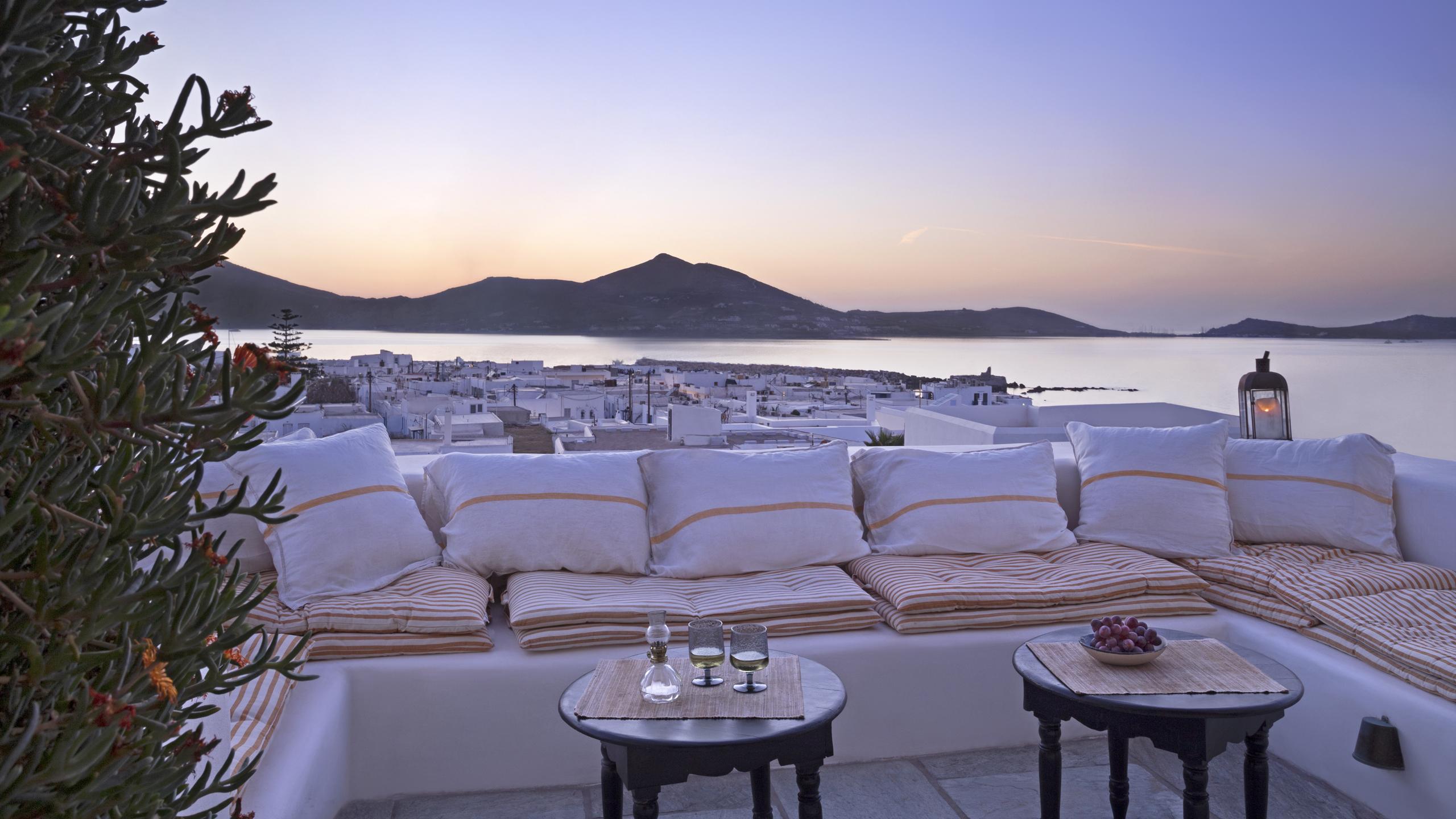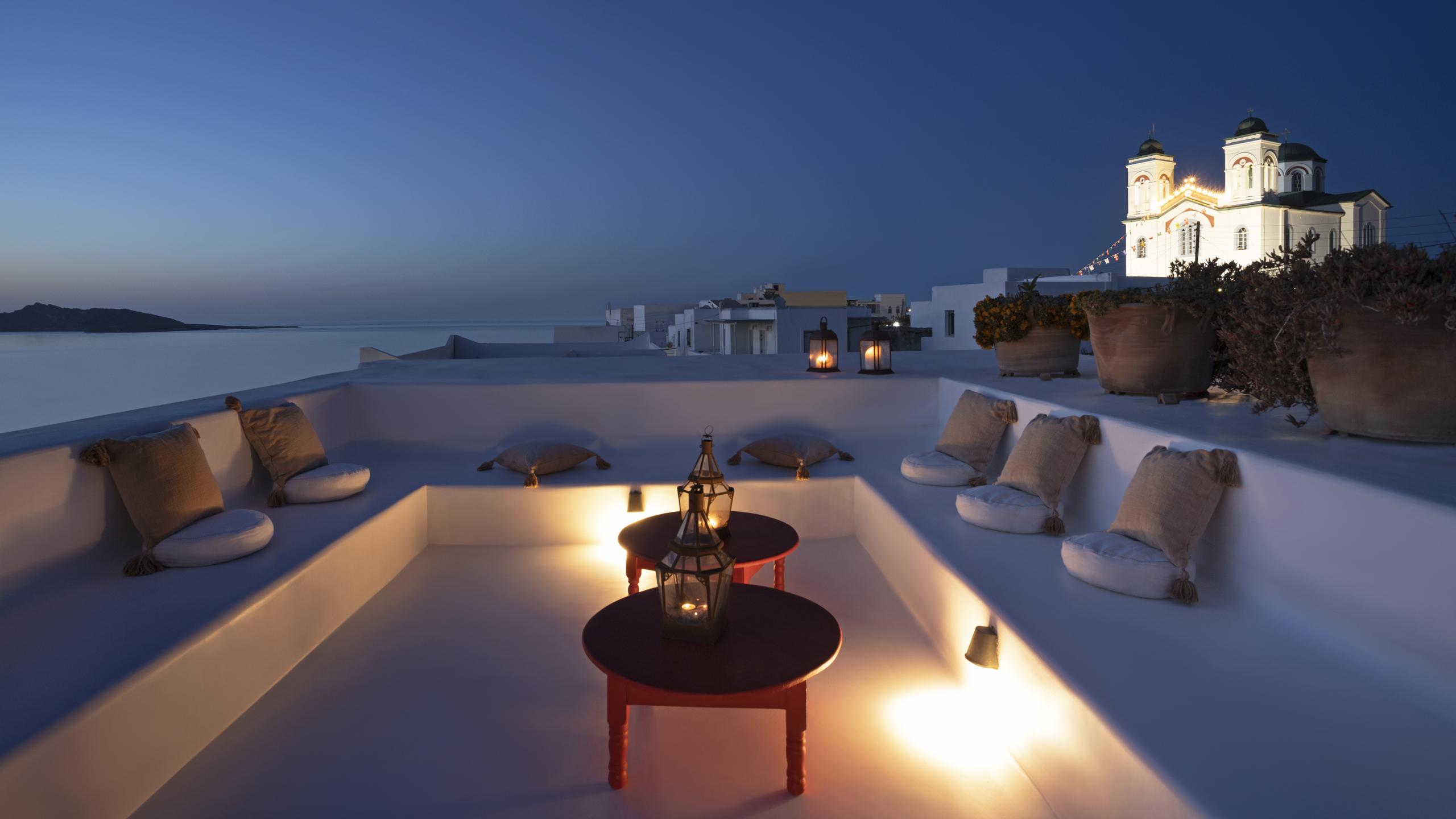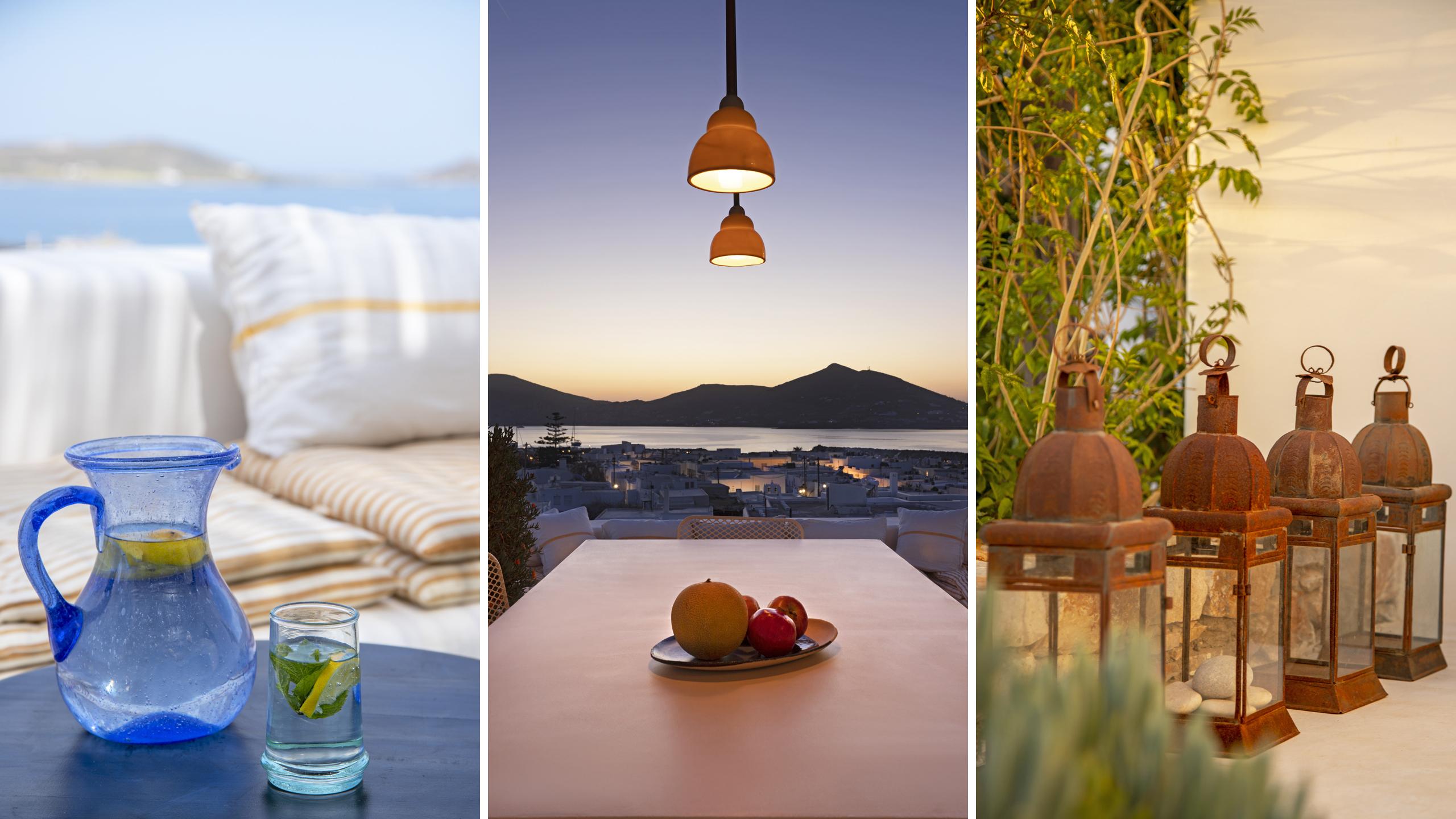 Al calar del sole, la terrazza panoramica sul tetto regala una vista impareggiabile sulla Baia di Naoussa, lo scenario perfetto per ammirare il tramonto, magari accompagnato da una cena privata preparata da uno chef dedicato.