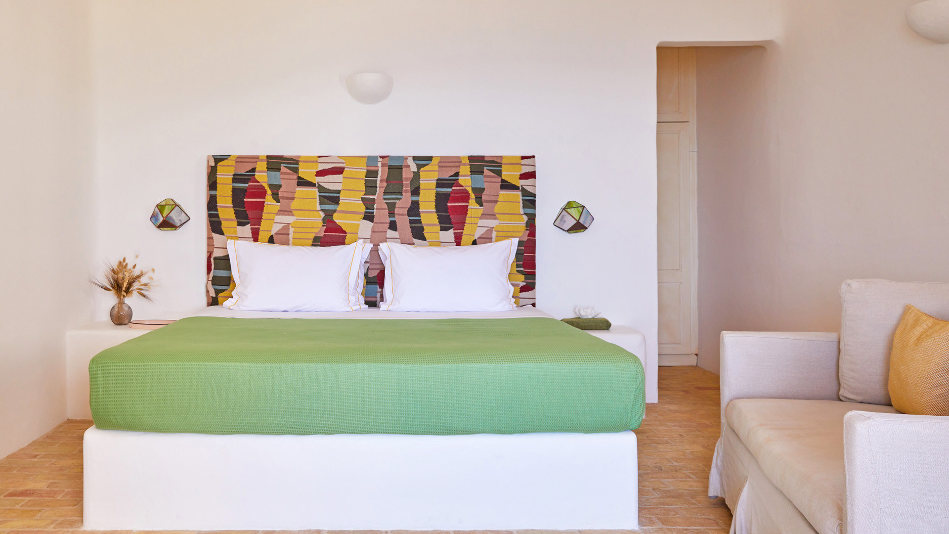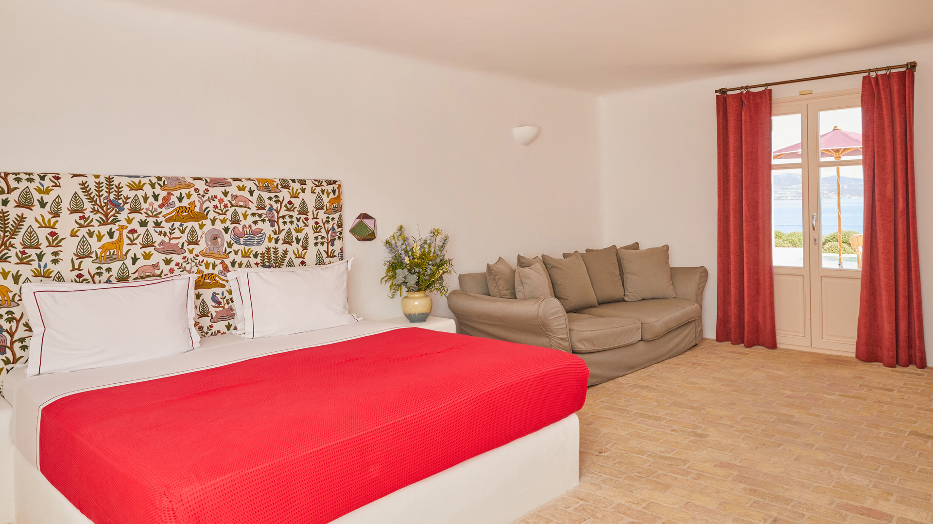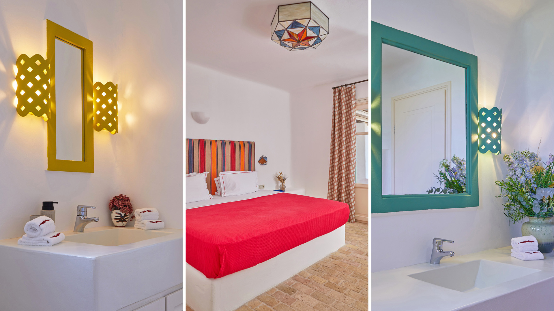L’abitazione si sviluppa in due corpi indipendenti uniti virtualmente da un’ampia terrazza esterna, che garantisce una piacevole area ombreggiata per pranzi e cene immersi nella natura; l’accesso nell’edificio principale conduce ad un grande ambiente aperto che incorpora salotto, sala da pranzo e cucina, l’atmosfera risulta fresca e informale, con elementi d'arredo d'ispirazione etnica e dalle forti tonalità. Una scala interna conduce sul livello piscina dove trovano spazio tre camere da letto, tra cui quella padronale di dimensioni particolarmente generose, ognuna con proprio bagno di pertinenza realizzato con la tecnica della cimentogonia; due delle sistemazione hanno vista mare e accesso indipendente dall’esterno, mentre la terza risulta più piccola e posizionata sul retro. Il corpo distaccato ospita ulteriori quattro camere da letto simili tra loro e disposte in maniera speculare, sono caratterizzate dallo stesso gusto che accomuna tutti gli ambienti della villa, ognuna con proprio bagno, vista mare e ingresso indipendente dall’esterno.