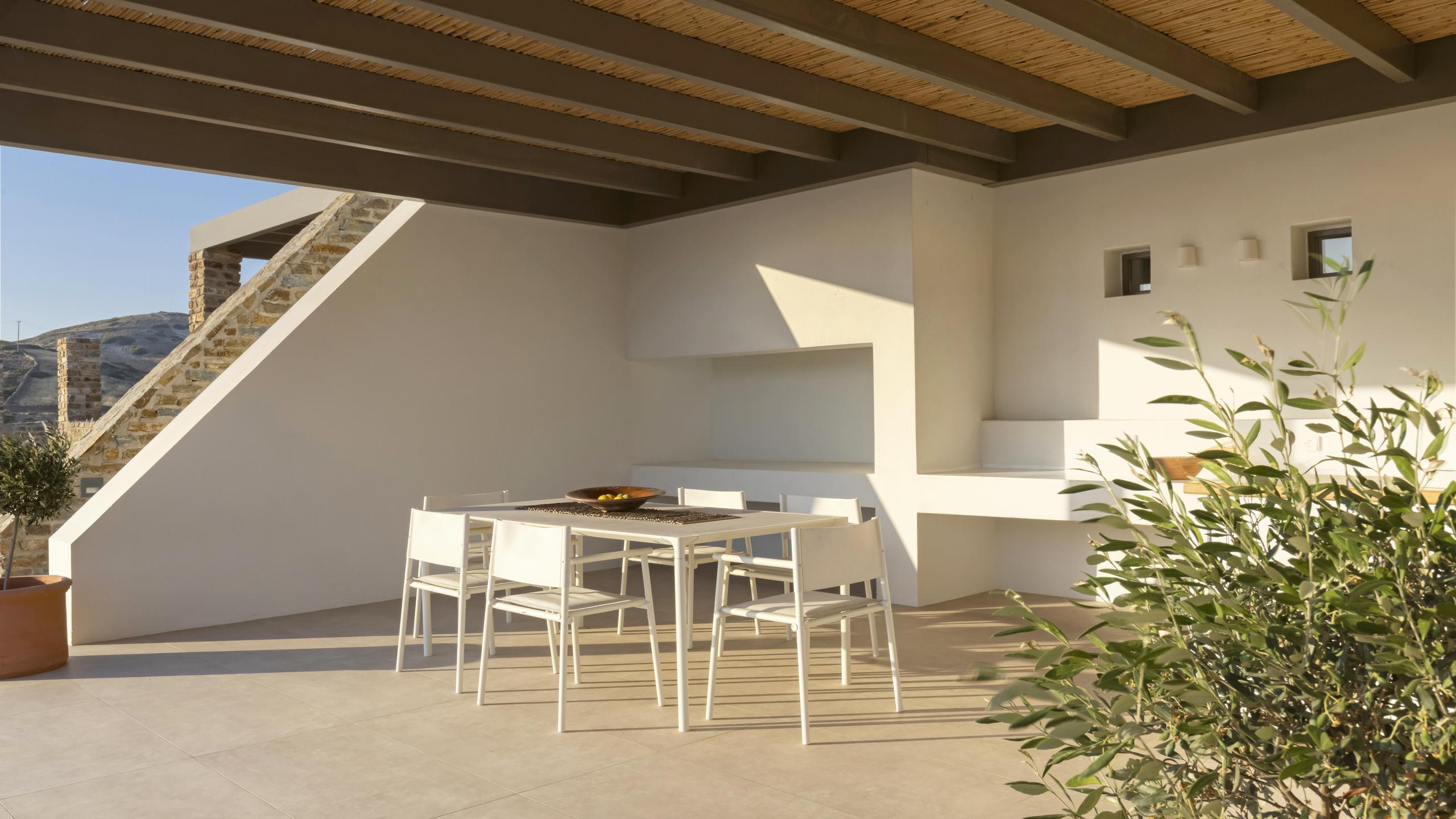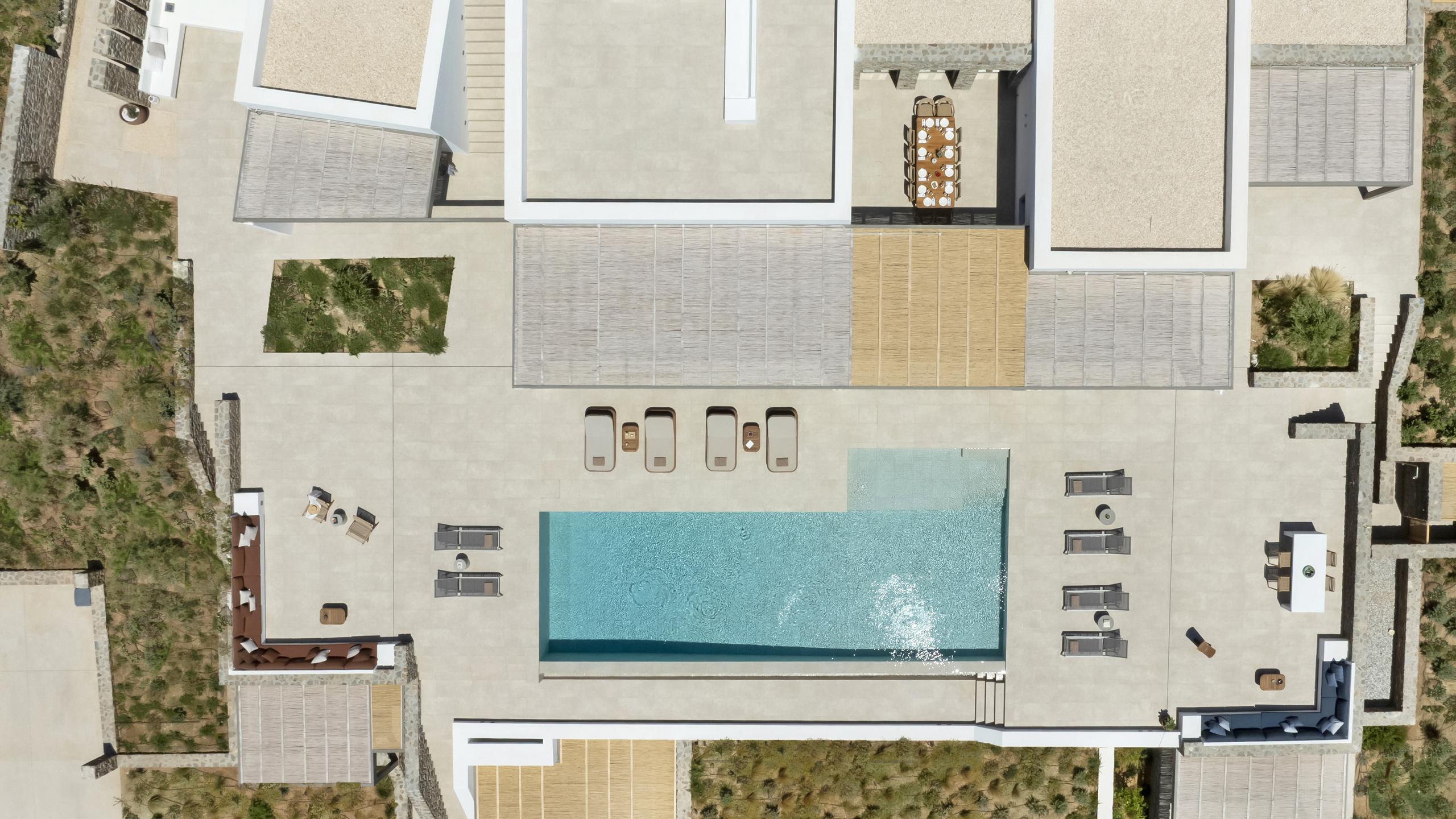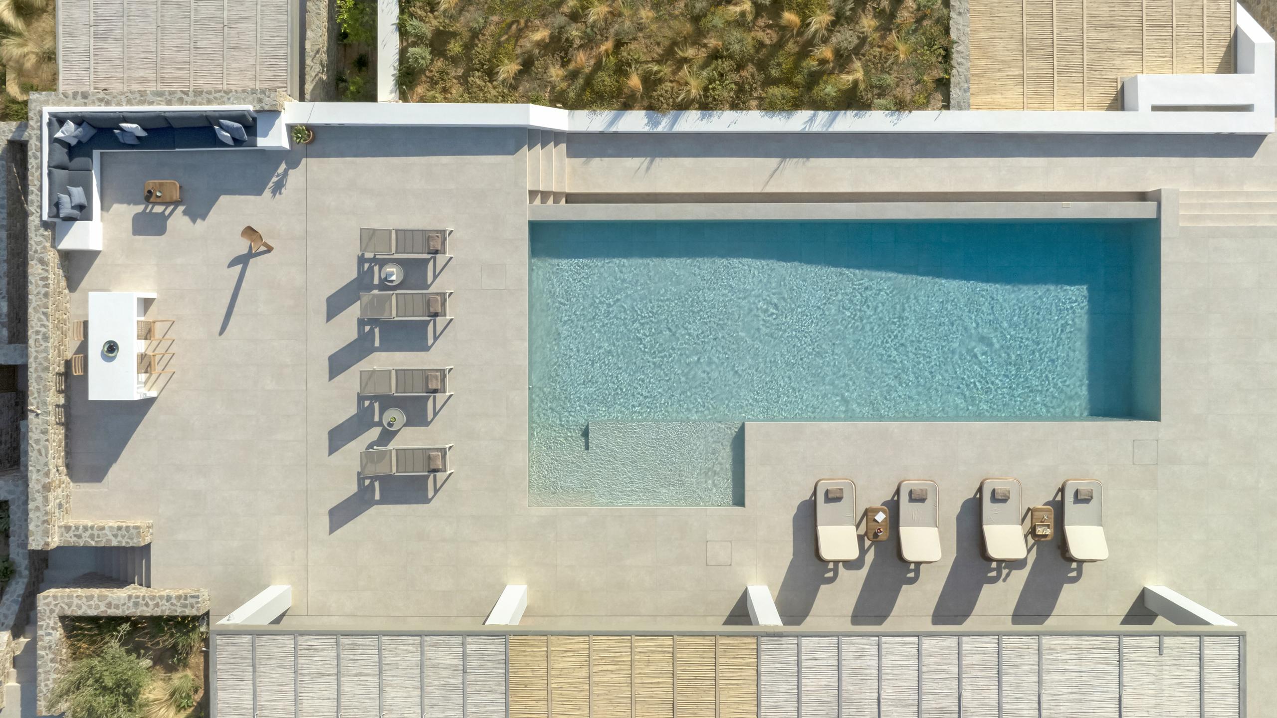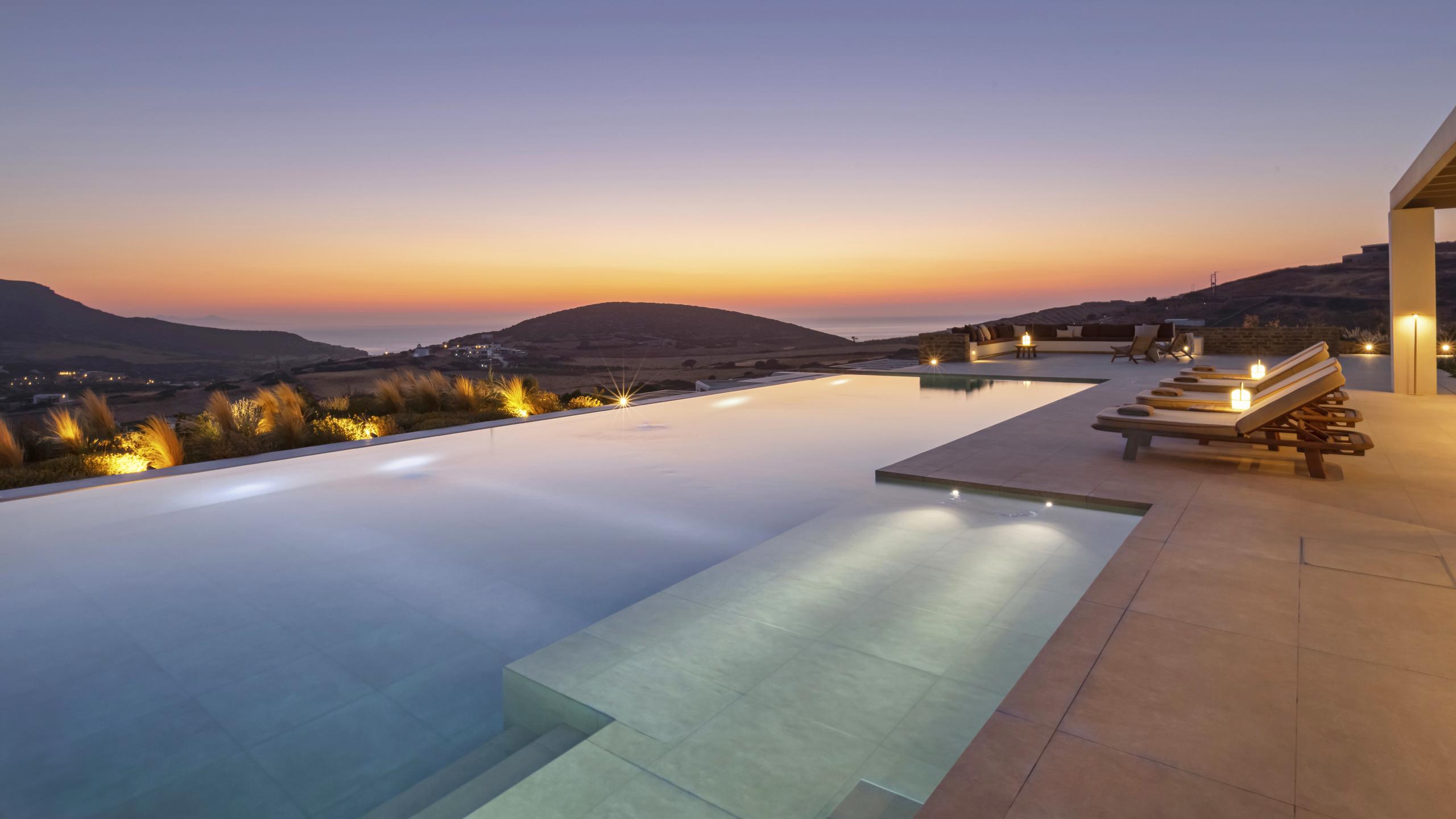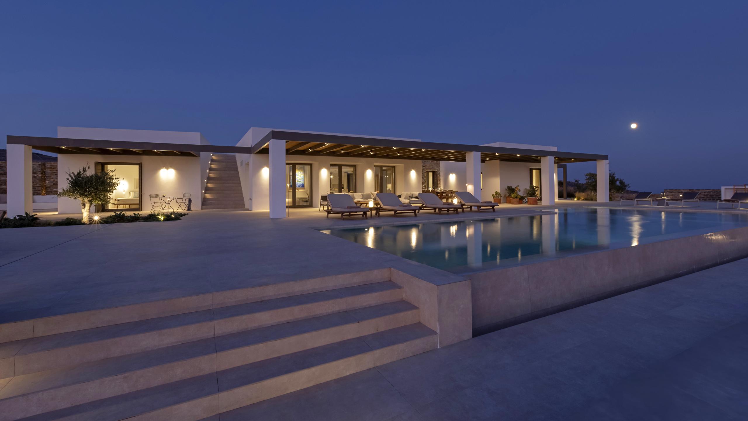 L'architettura dell'edificio è quella Cicladica moderna, con rispetto della tradizione chiaramente rivisitata in modo contemporaneo, con particolare attenzione all'utilizzo dei materiali della migliore qualità e alle dotazioni tecnologiche più moderne. La grande piscina infinity ruba senza dubbio la scena, posizionata sulla terrazza principale dove potersi gustare nel migliore dei modi un magnifico tramonto facendo il bagno.