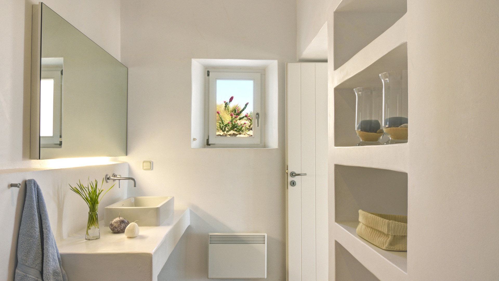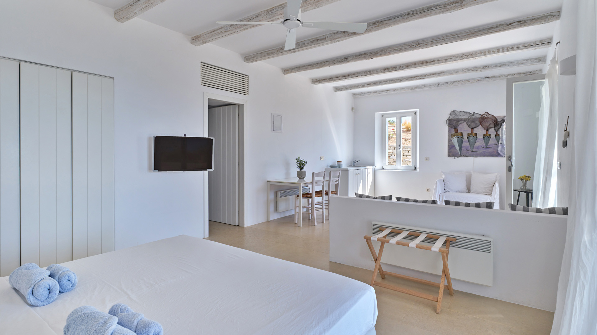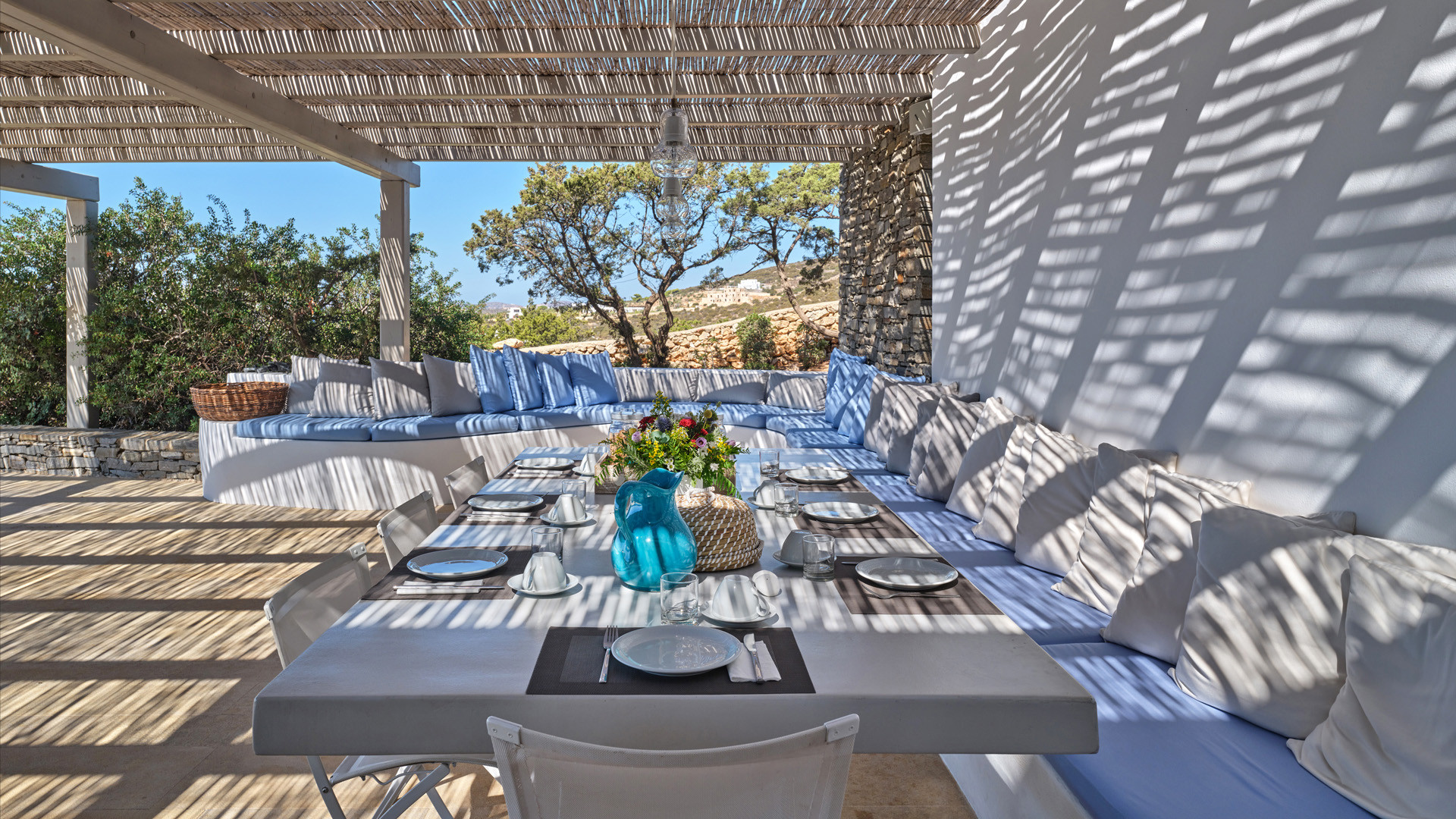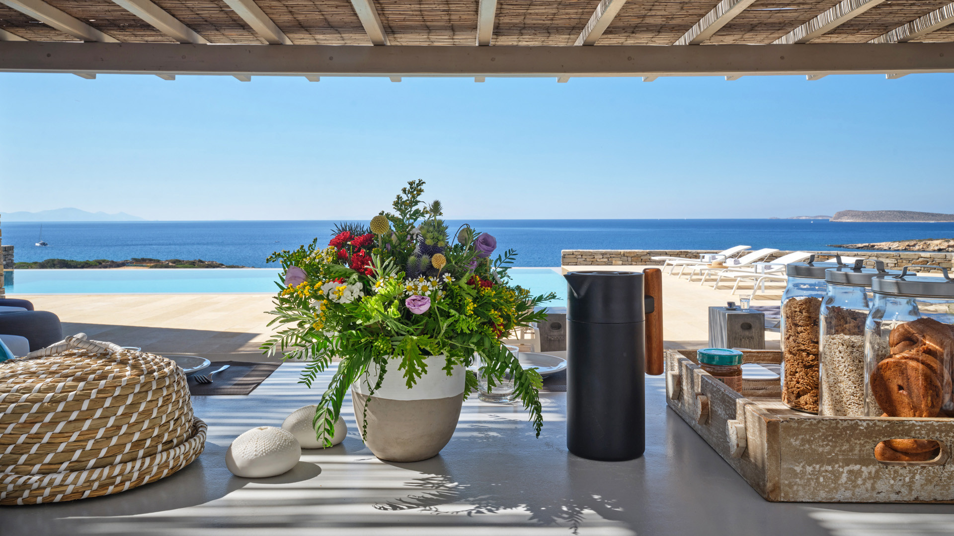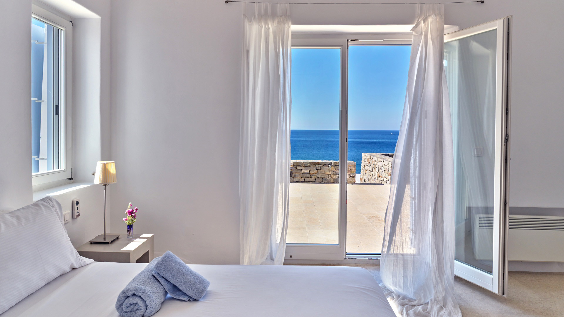 Grandi spazi, architettura Cicladica tradizionale e interni dal forte carattere minimalista si combinano perfettamente in un ambiente fresco e arioso, garantendo un ottimo grado di comfort ai fortunati ospiti sia internamente che esternamente, dalla spaziosa terrazza esterna che ospita la grande piscina infinity e una moltitudine di intriganti aree relax, ai voluminosi ambienti interni come salotto, sala da pranzo e camere da letto.