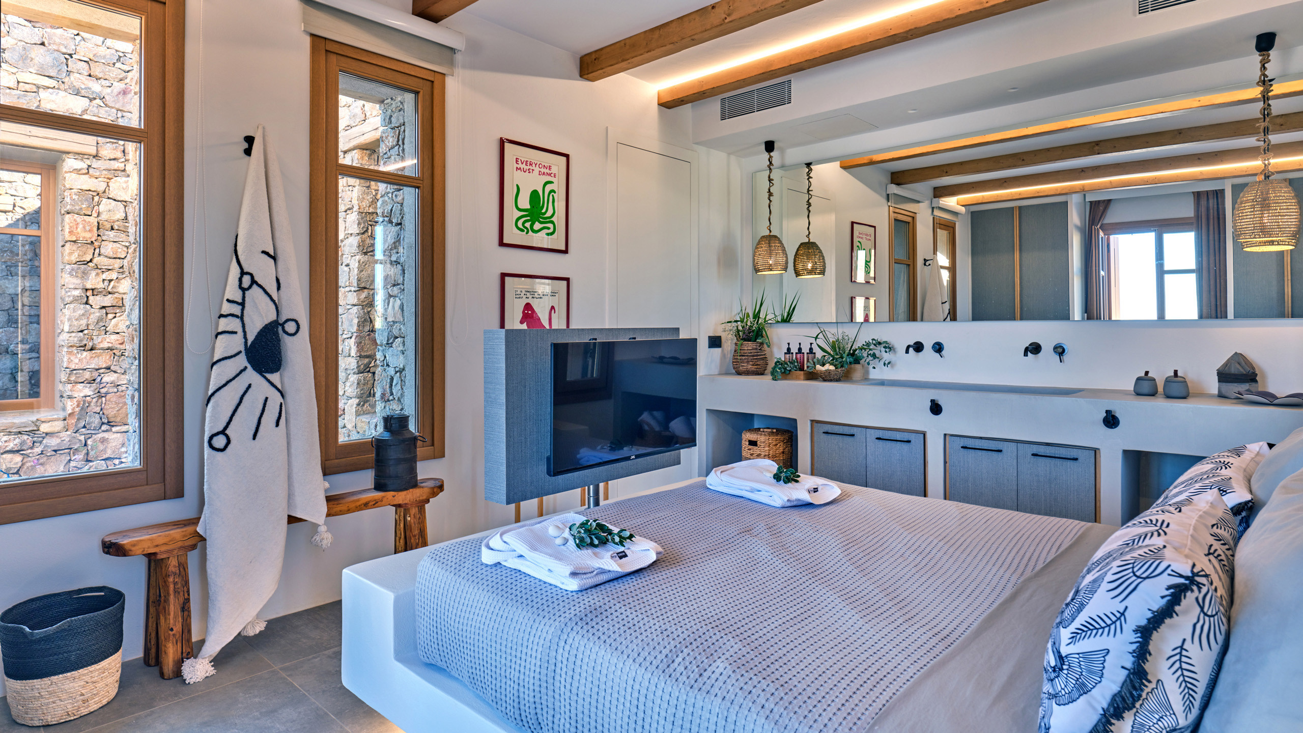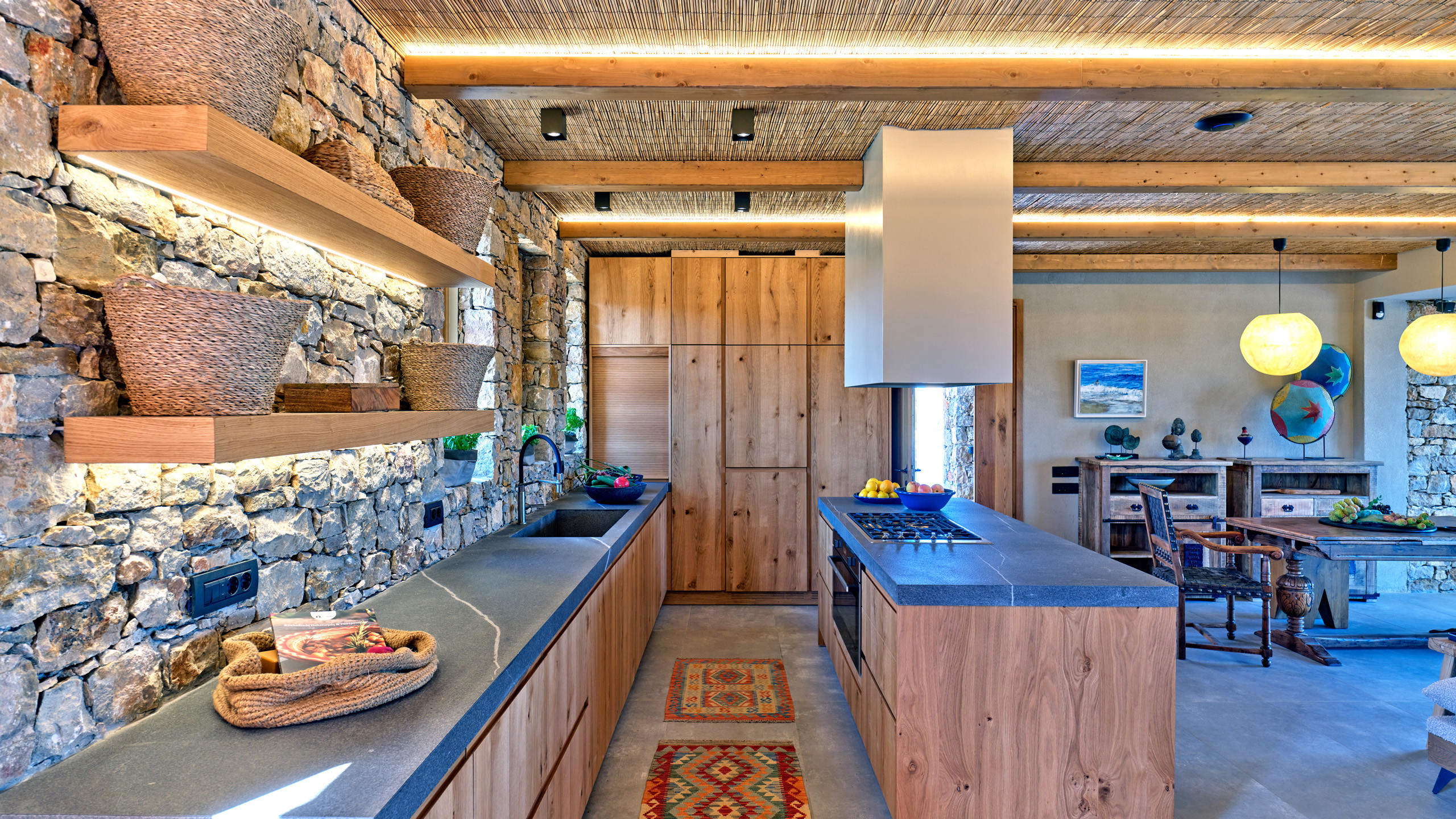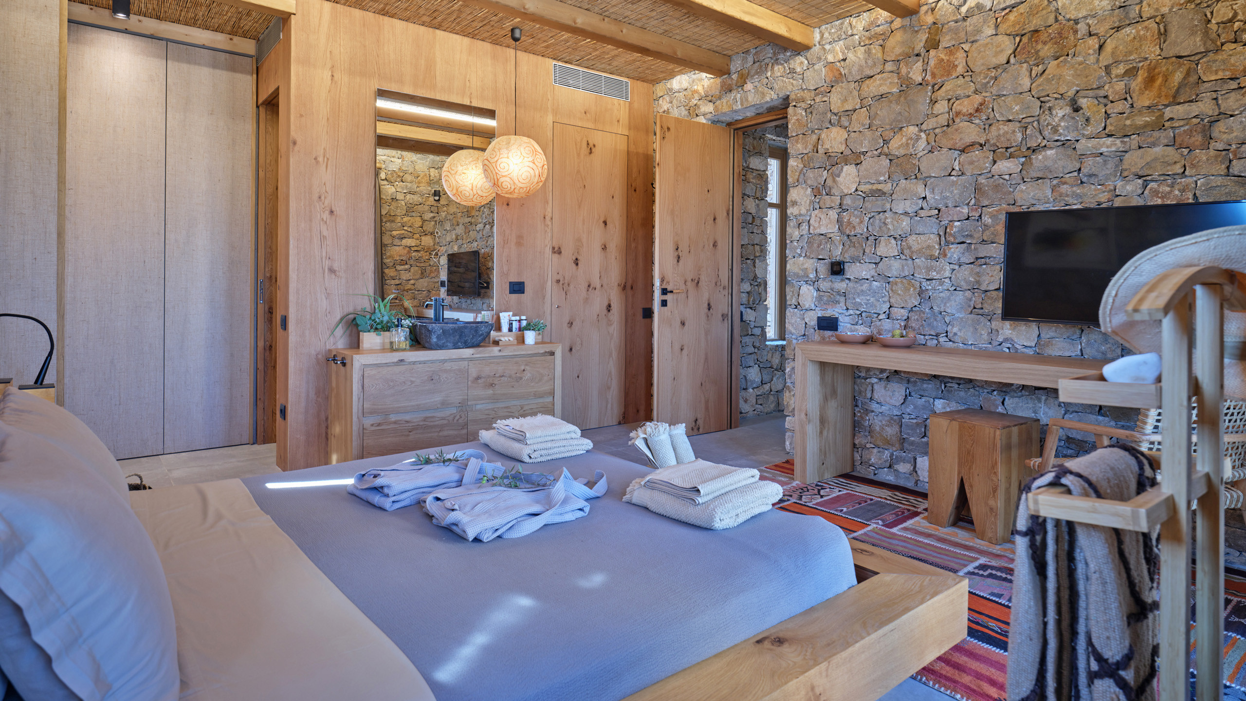 Gli interni dell'abitazione sono caldi, accoglienti e ricchi di dettagli, ancora una volta i materiali sono della migliore qualità, con tutte le dotazioni più moderne a disposizione degli ospiti e insoliti accorgimenti ed elementi di arredo che personalizzano ogni ambiente.