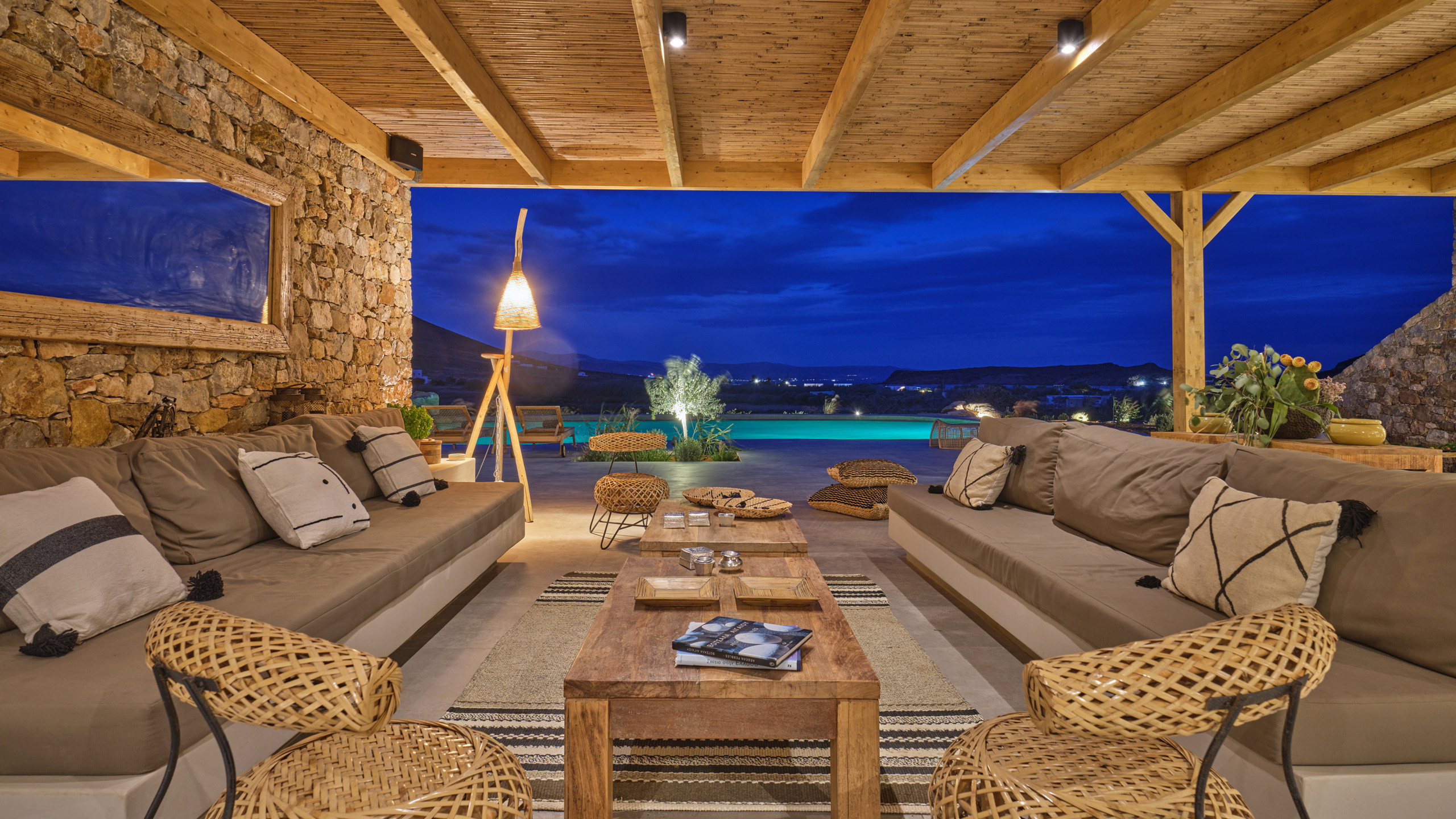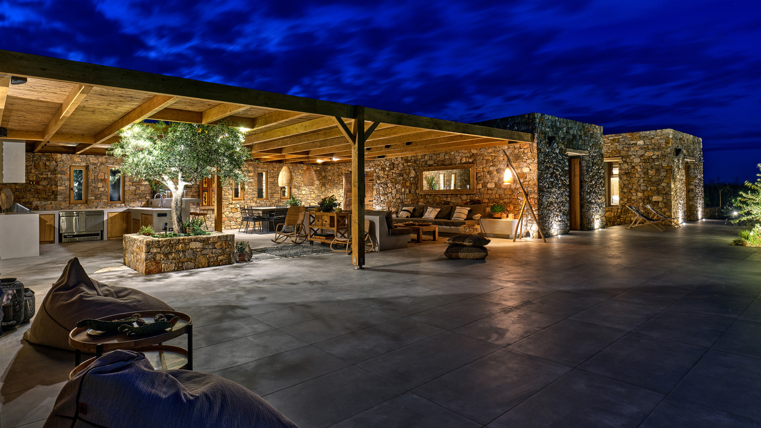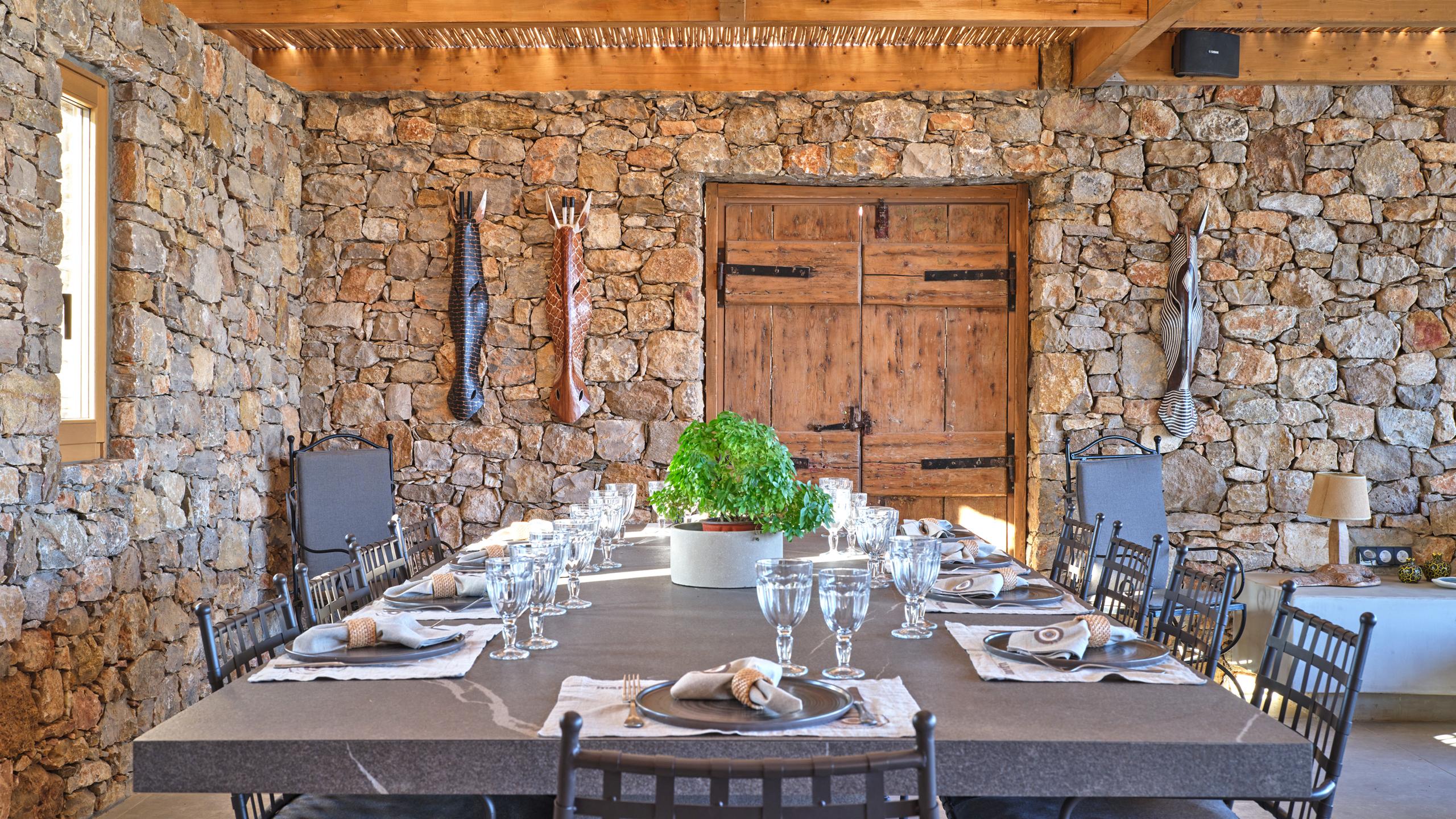 Gli esterni sono molto curati, dominati dalla grande piscina di forma irregolare che si fonde perfettamente con il paesaggio brullo della zona. L'architettura è in stile tradizionale, con le pareti in pietra vista e i materiali naturali utilizzati che regalano un fascino unico all'ambiente; un'ampia pergola garantisce la copertura ad una godibile area pranzo esterna, con BBQ, angolo bar, e salotto all'aperto, vero punto focale della proprietà.