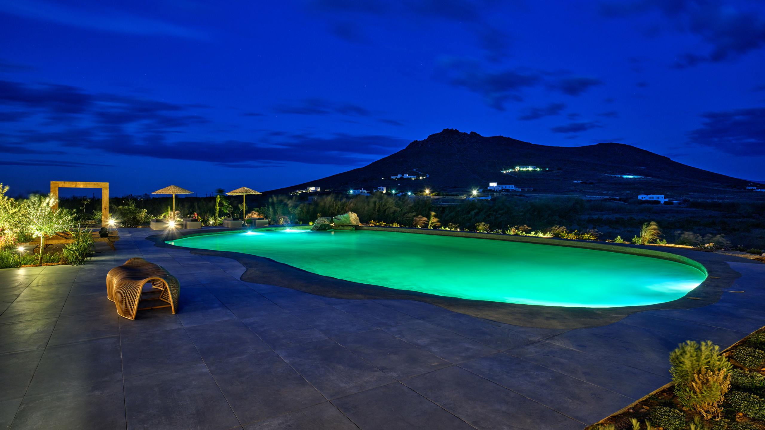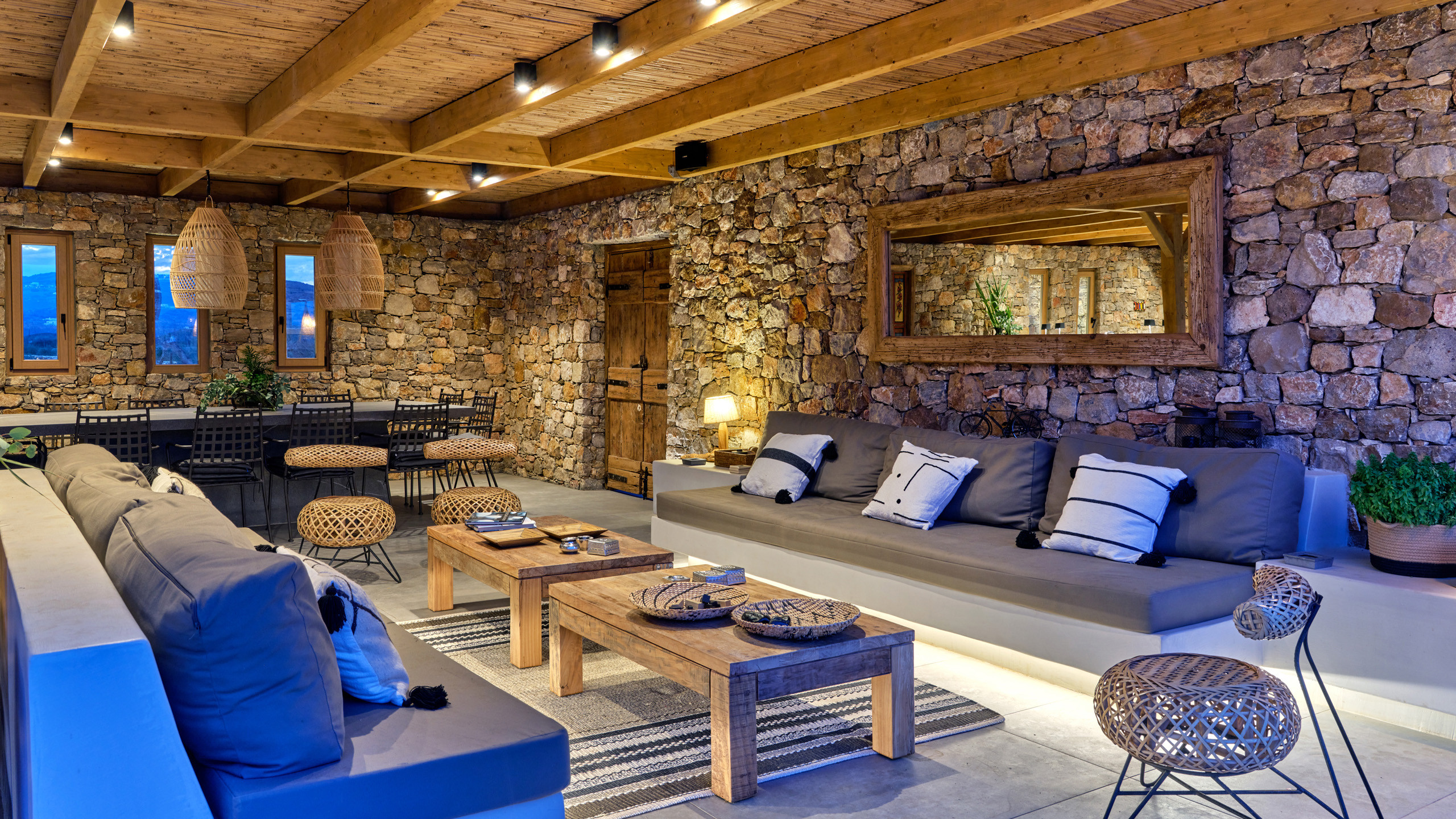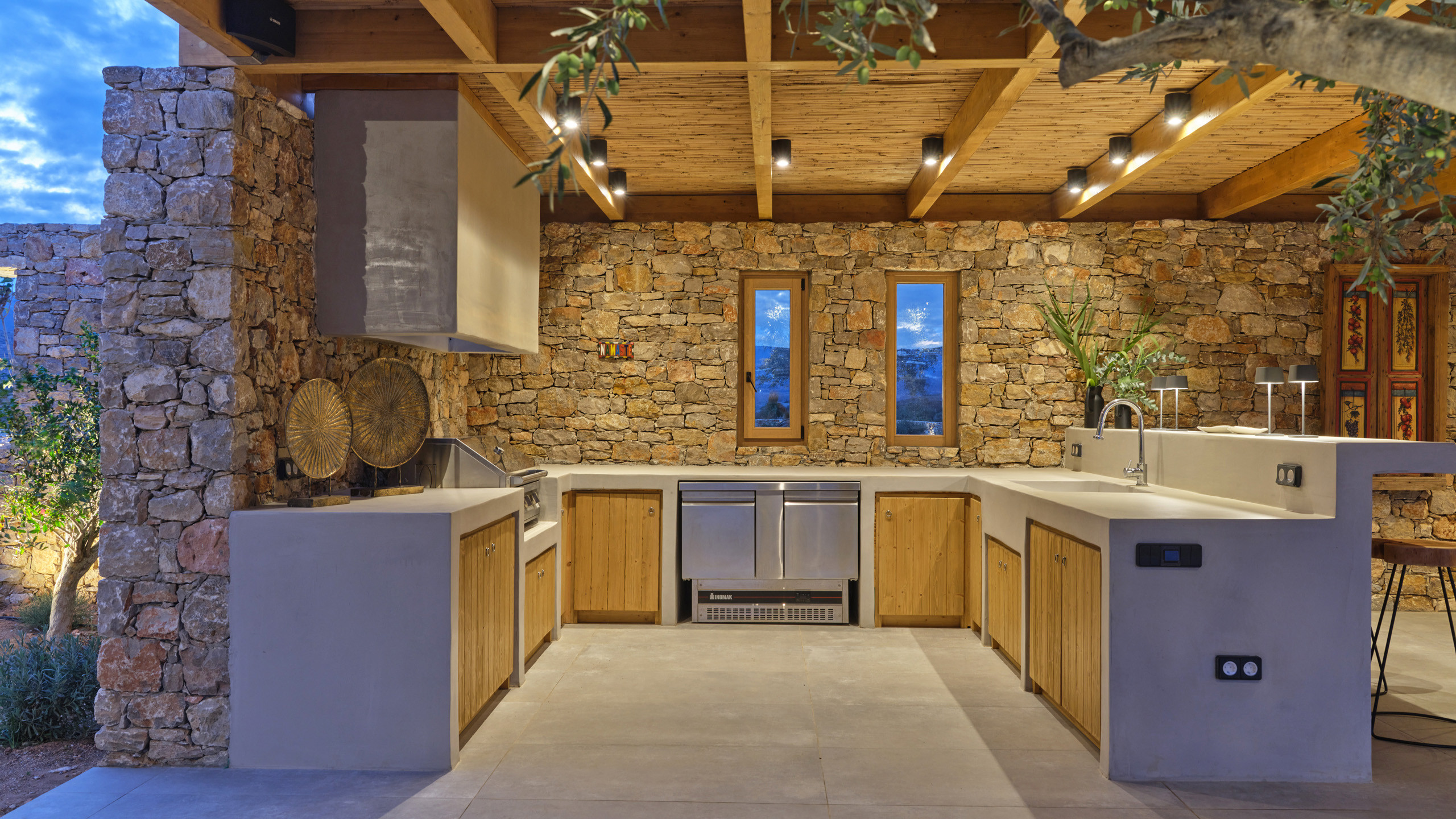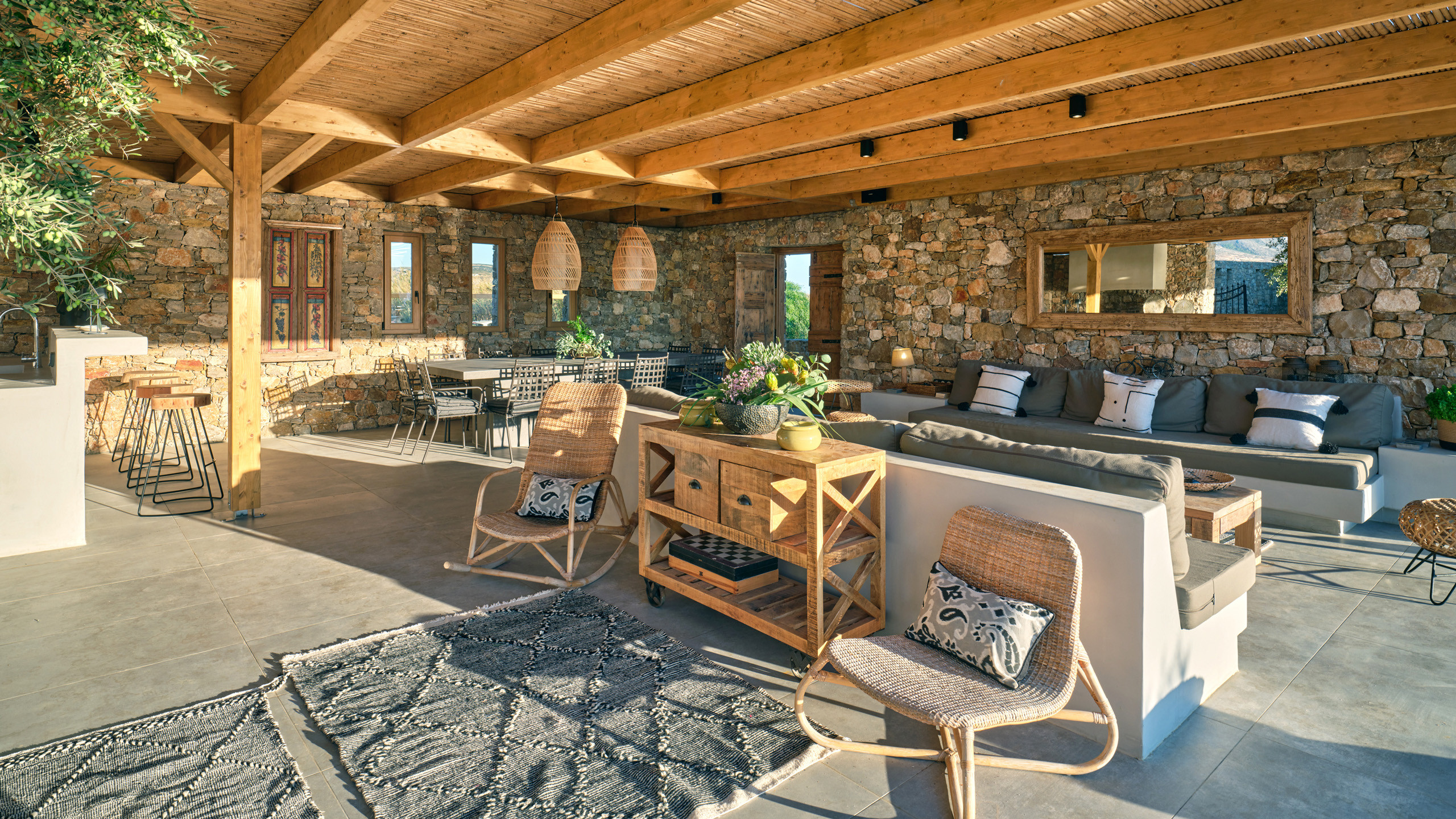 Gli esterni sono molto curati, dominati dalla grande piscina di forma irregolare che si fonde perfettamente con il paesaggio brullo della zona. L'architettura è in stile tradizionale, con le pareti in pietra vista e i materiali naturali utilizzati che regalano un fascino unico all'ambiente; un'ampia pergola garantisce la copertura ad una godibile area pranzo esterna, con BBQ, angolo bar, e salotto all'aperto, vero punto focale della proprietà.