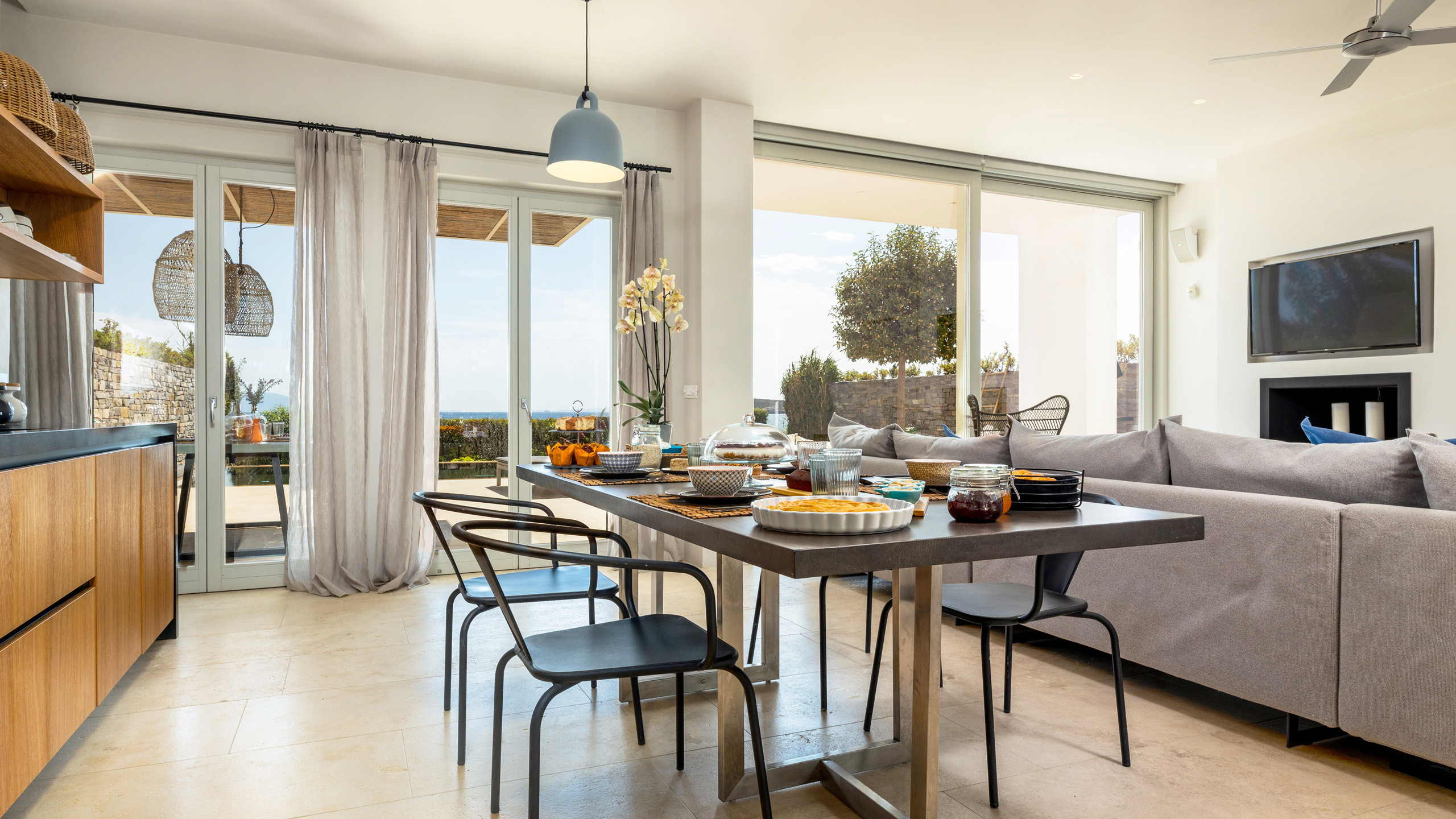 A breve distanza si trova anche il tradizionale villaggio di Dryos, con il tipico porticciolo e le taverne che servono pesce fresco. Gli esterni della proprietà si sviluppano frontalmente, dove la terrazza principale vede la presenza dell’attraente piscina infinity, zona pranzo e zona relax, il tutto accompagnato dall’onnipresente vista sul mare poco distante.