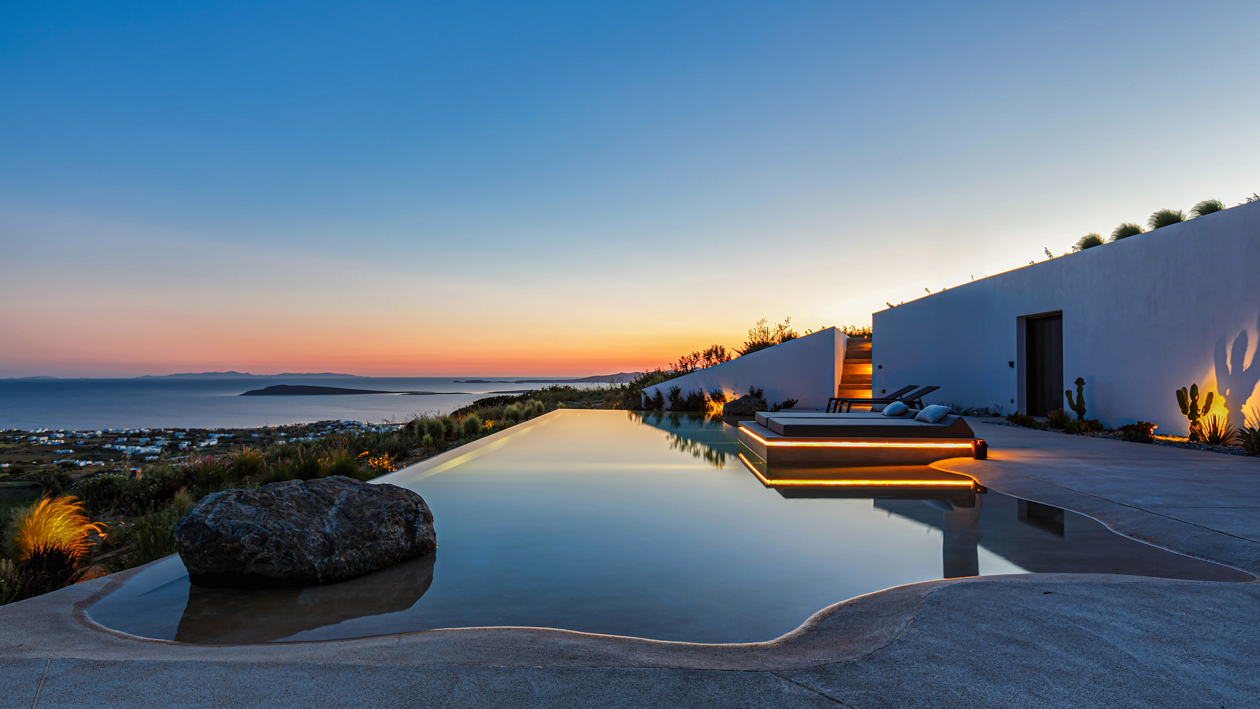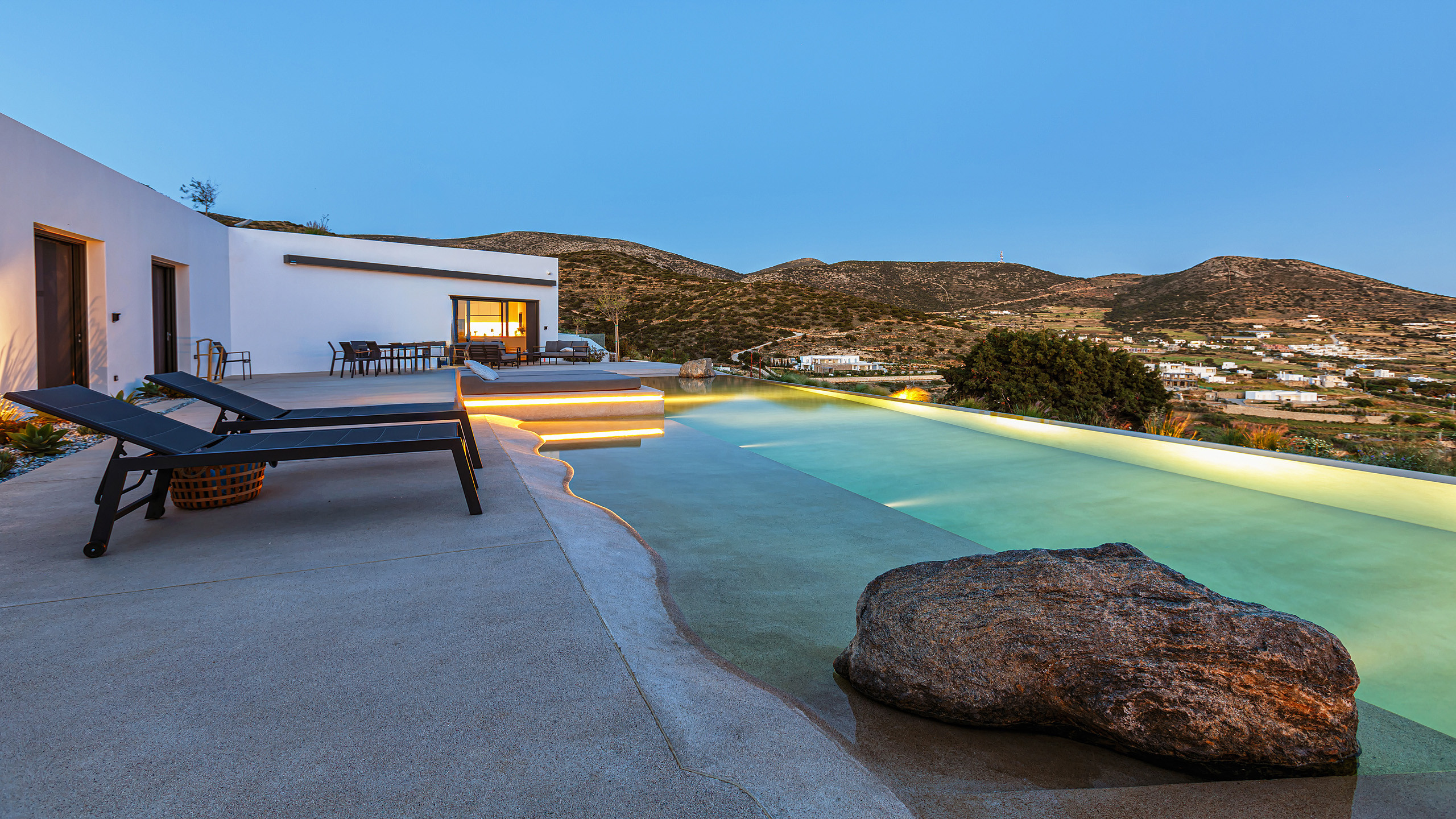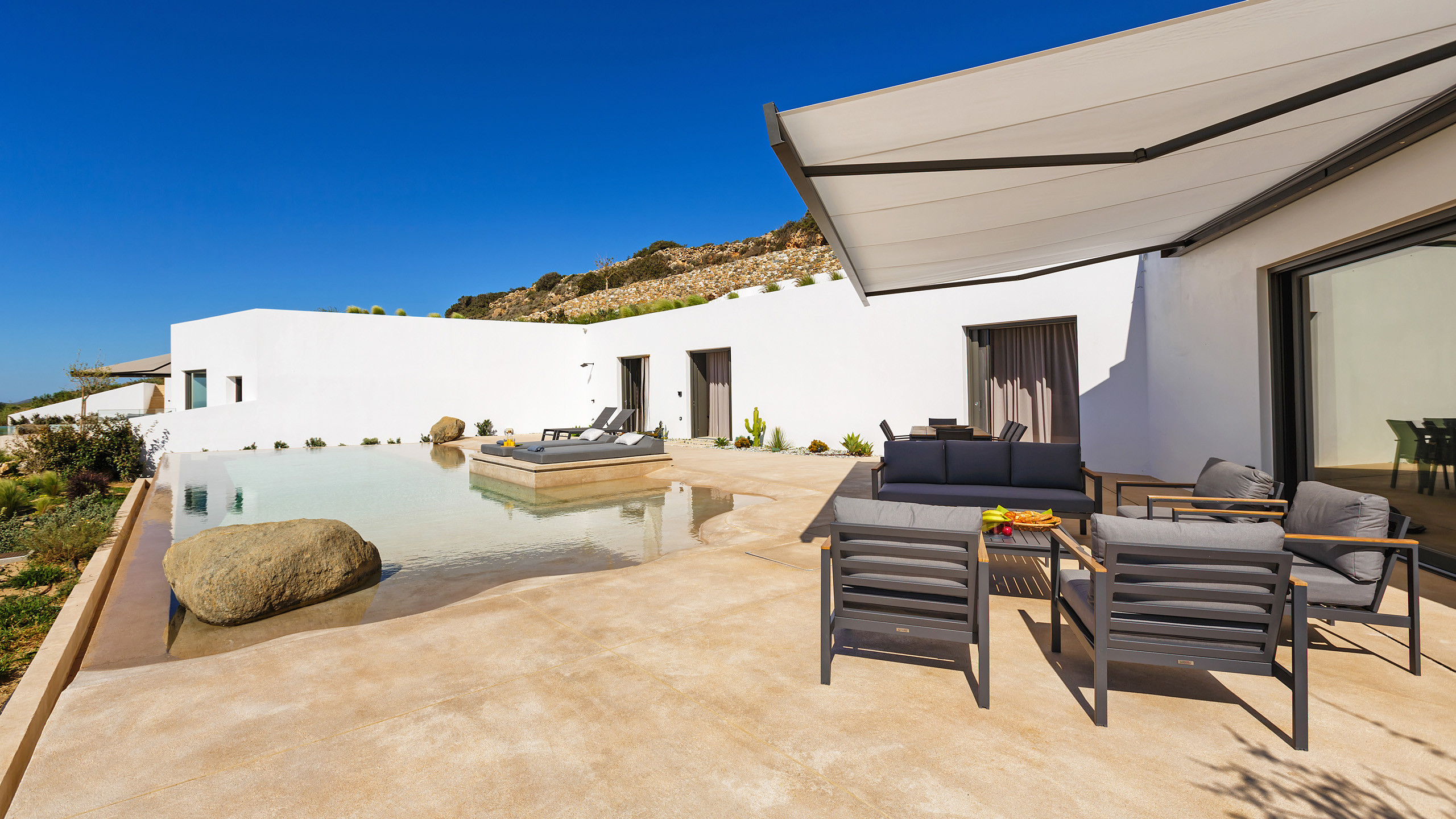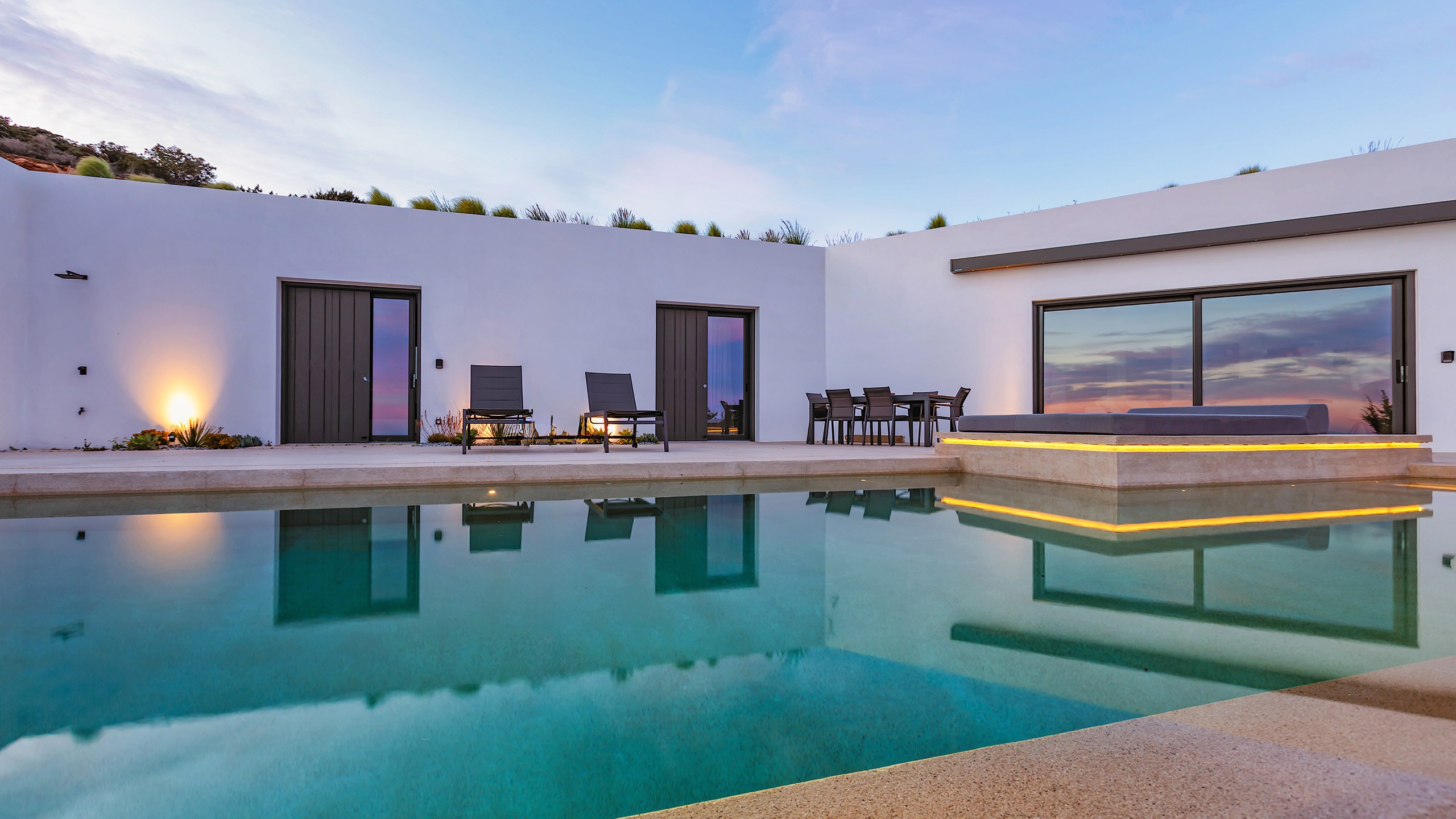 Un noto studio di architettura locale ha seguito l'interno progetto, con uno stile contemporaneo che segue il filone che sta ricevendo attualmente un grande successo, realizzando l'abitazione scavandola direttamente nella roccia. A disposizione degli ospiti troviamo tre attraenti piscine infinity, fiancheggiate da rispettive zone pranzo esterne, ombreggiate all'occorrenza da una tenda comandata elettricamente che si ritrae nella parete a piacimento.