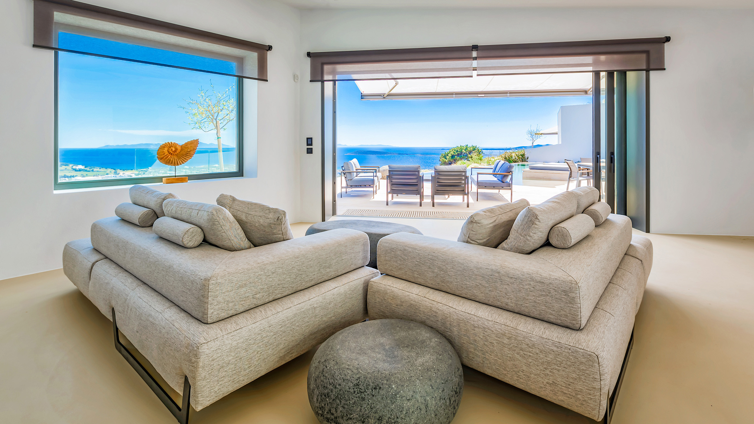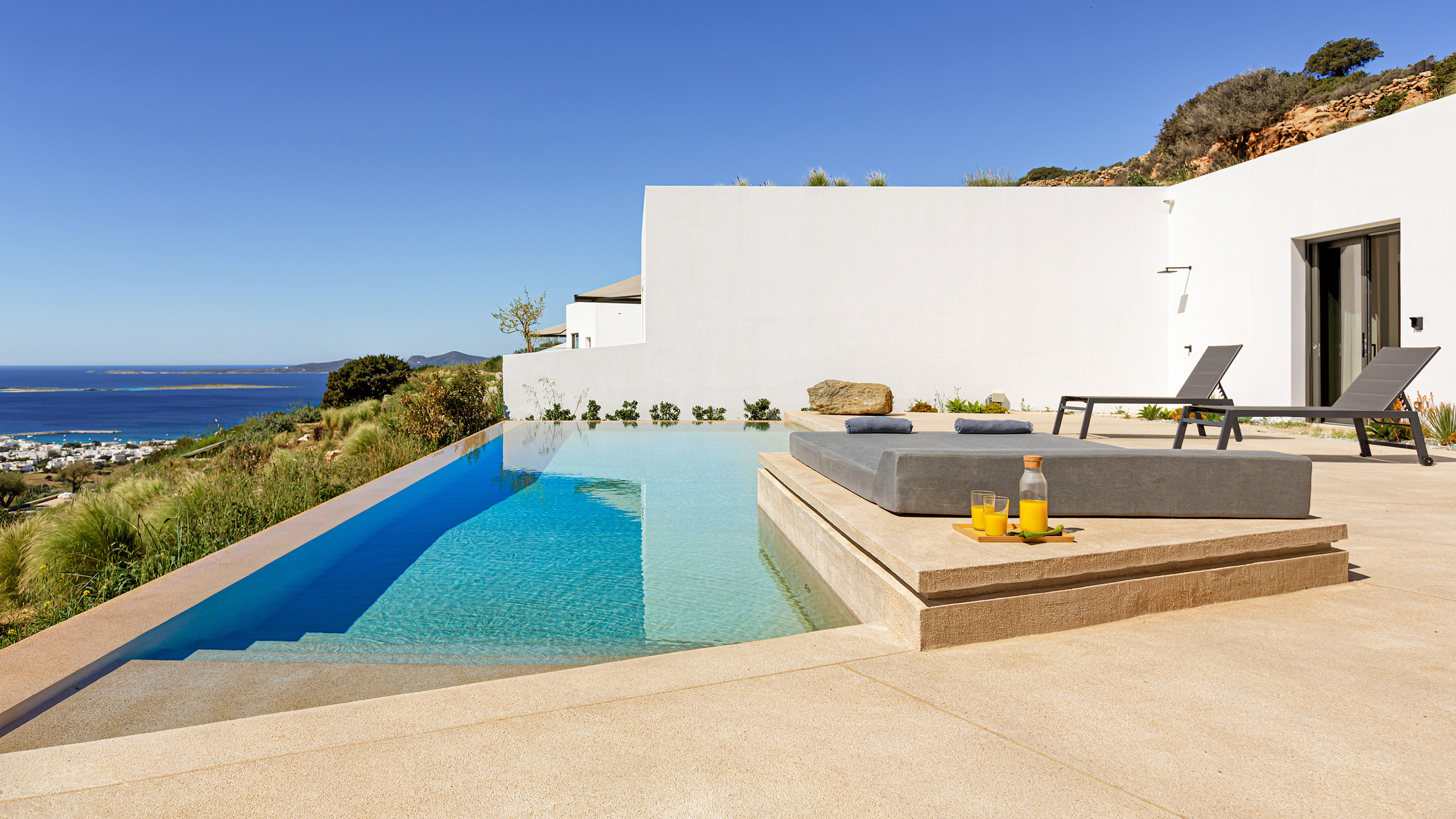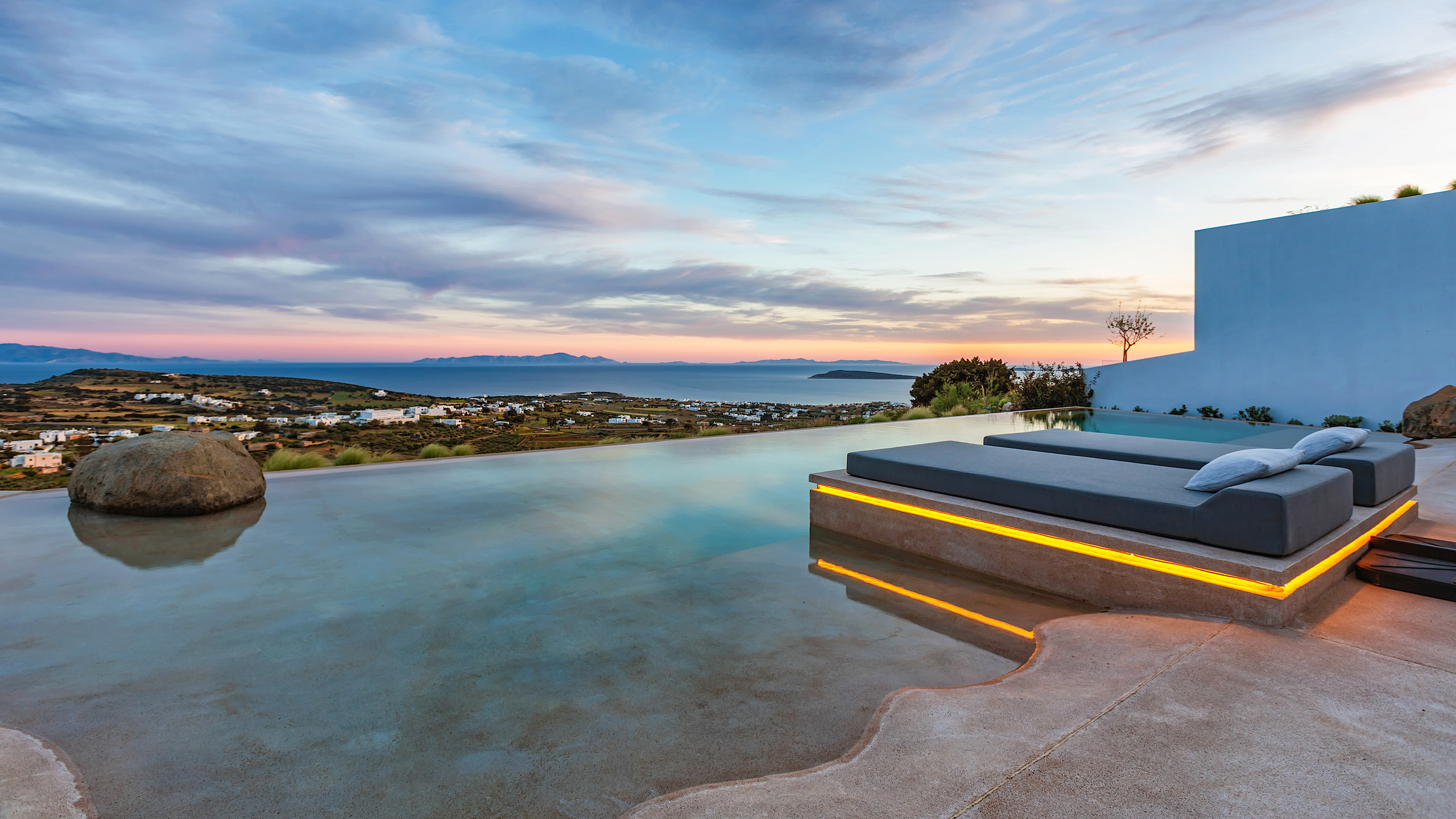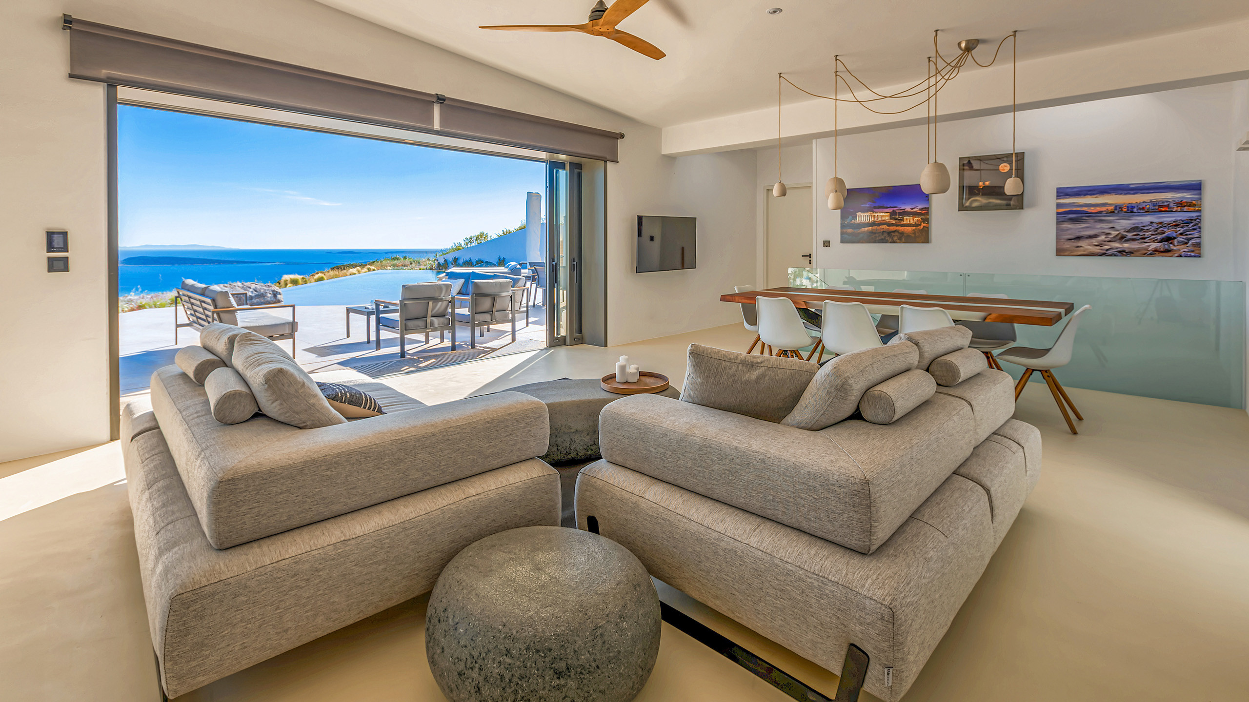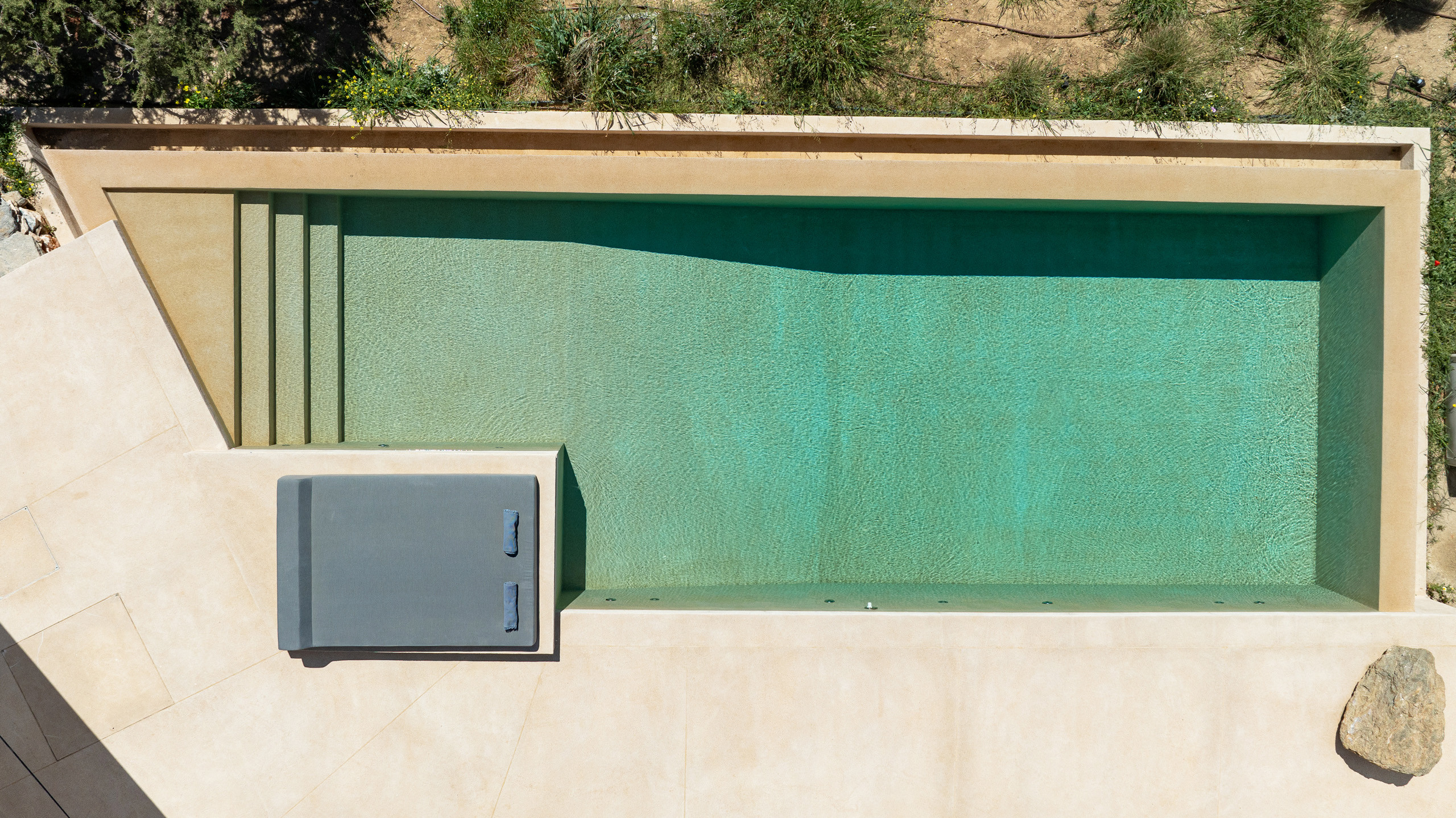 Un noto studio di architettura locale ha seguito l'interno progetto, con uno stile contemporaneo che segue il filone che sta ricevendo attualmente un grande successo, realizzando l'abitazione scavandola direttamente nella roccia. A disposizione degli ospiti troviamo tre attraenti piscine infinity, fiancheggiate da rispettive zone pranzo esterne, ombreggiate all'occorrenza da una tenda comandata elettricamente che si ritrae nella parete a piacimento.