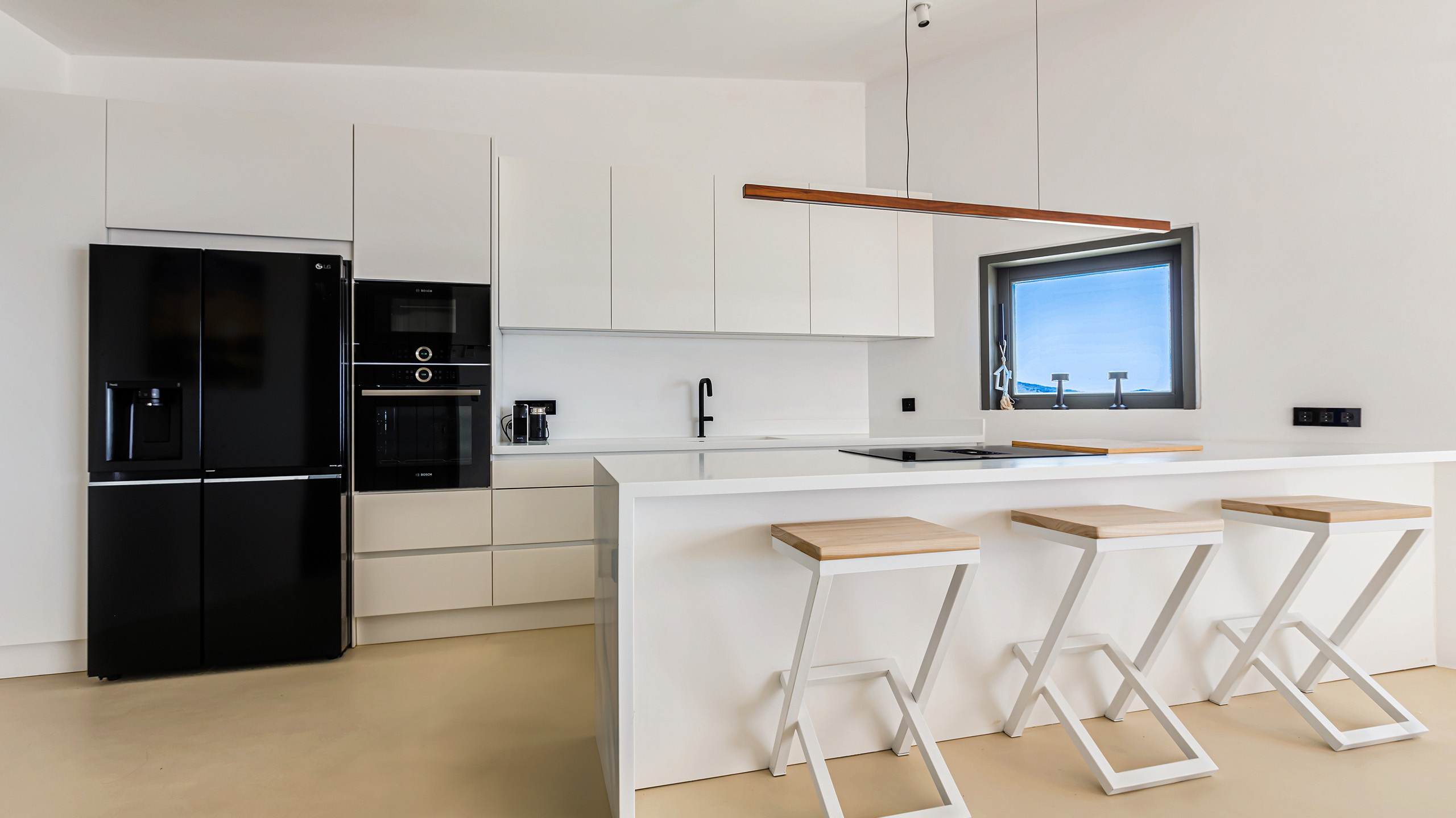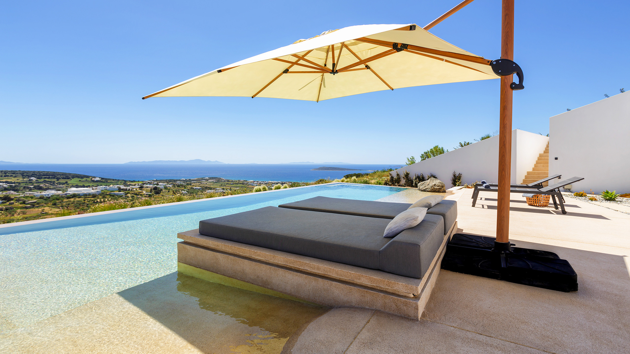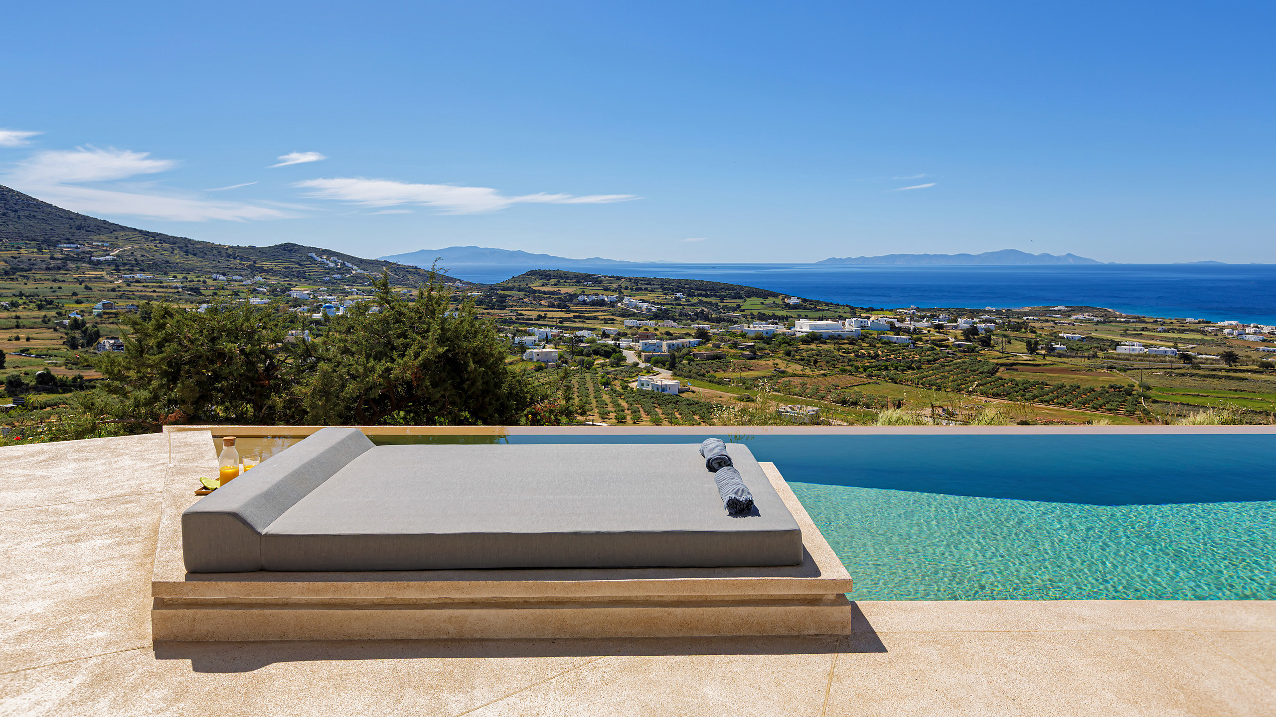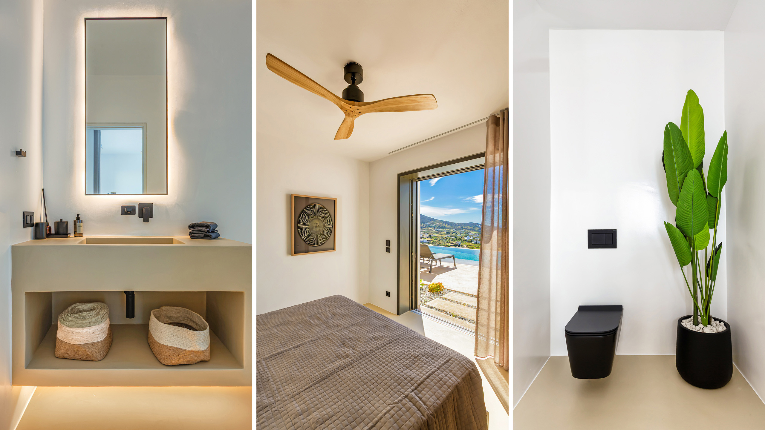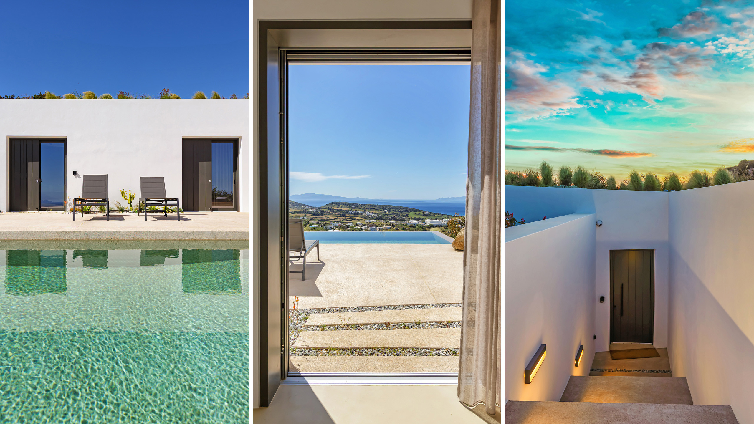 Un noto studio di architettura locale ha seguito l'interno progetto, con uno stile contemporaneo che segue il filone che sta ricevendo attualmente un grande successo, realizzando l'abitazione scavandola direttamente nella roccia. A disposizione degli ospiti troviamo tre attraenti piscine infinity, fiancheggiate da rispettive zone pranzo esterne, ombreggiate all'occorrenza da una tenda comandata elettricamente che si ritrae nella parete a piacimento.