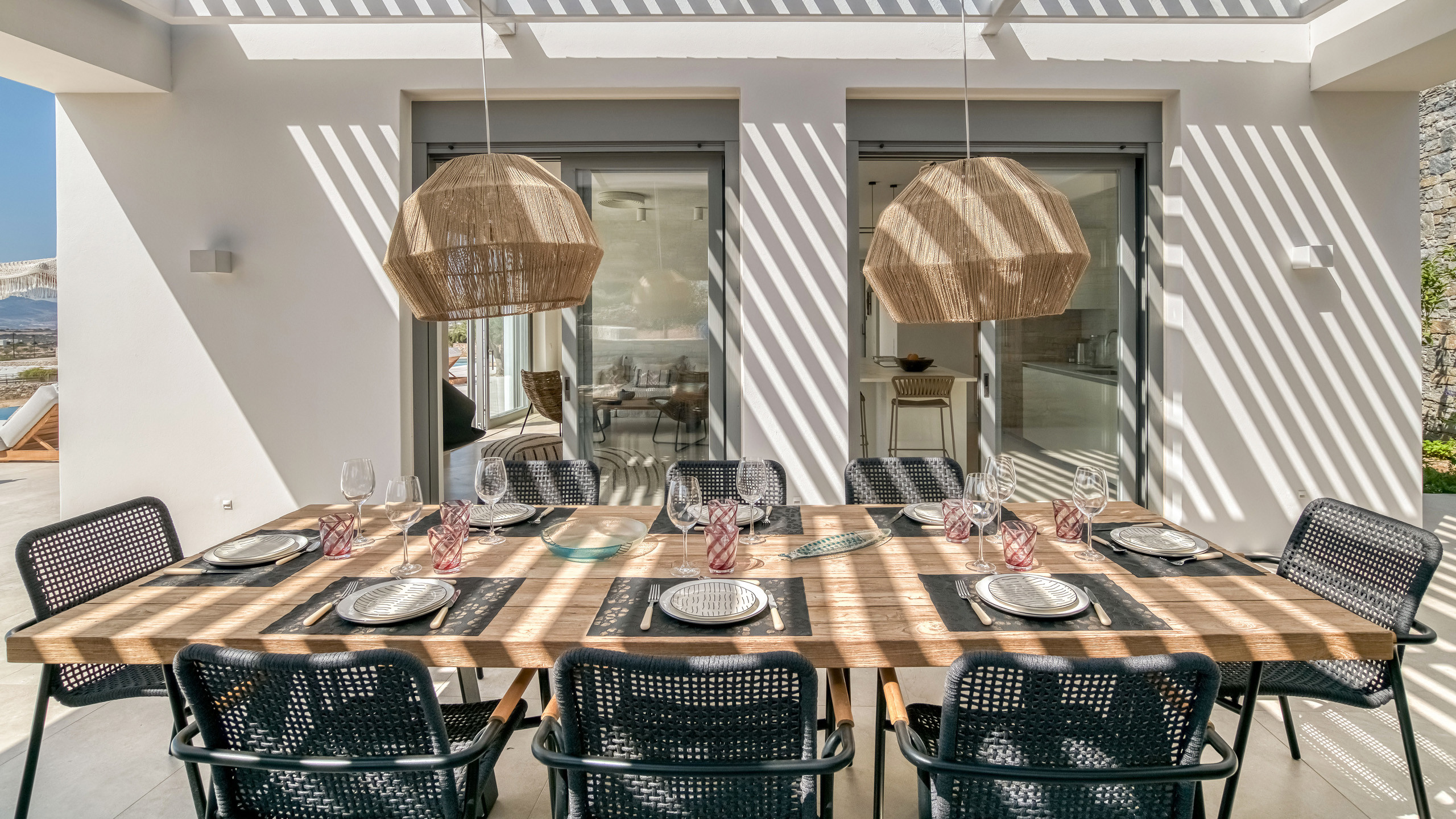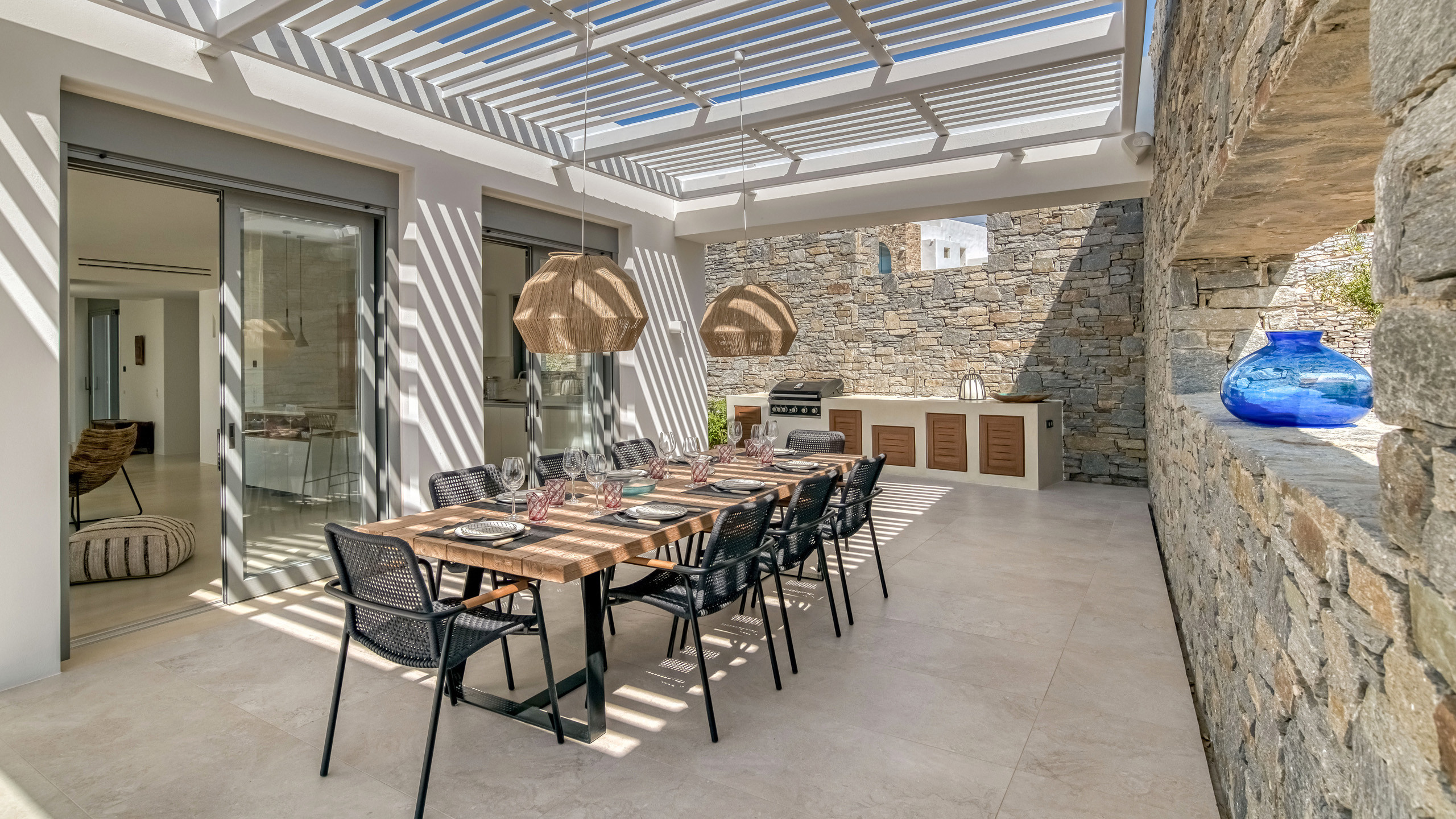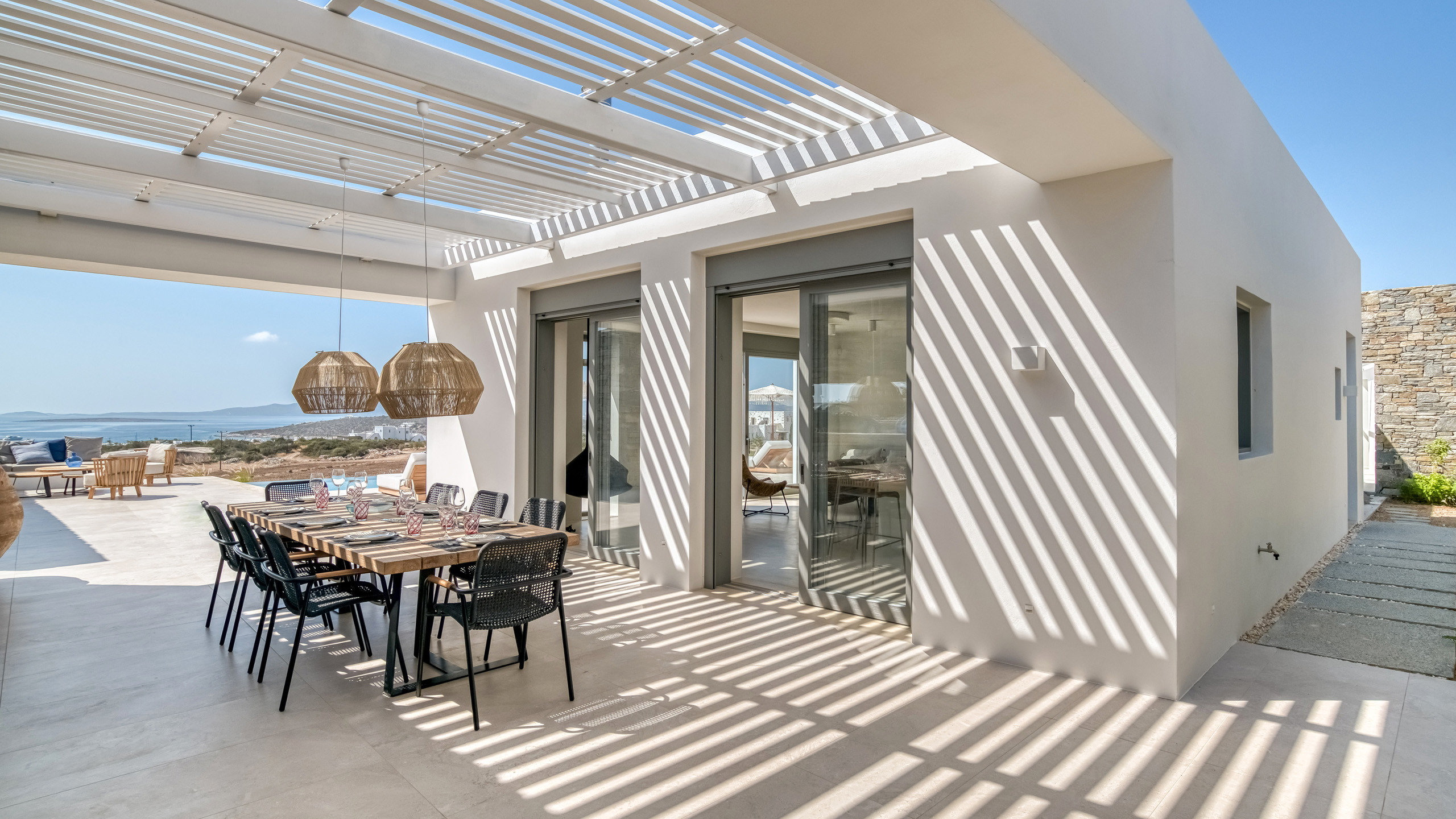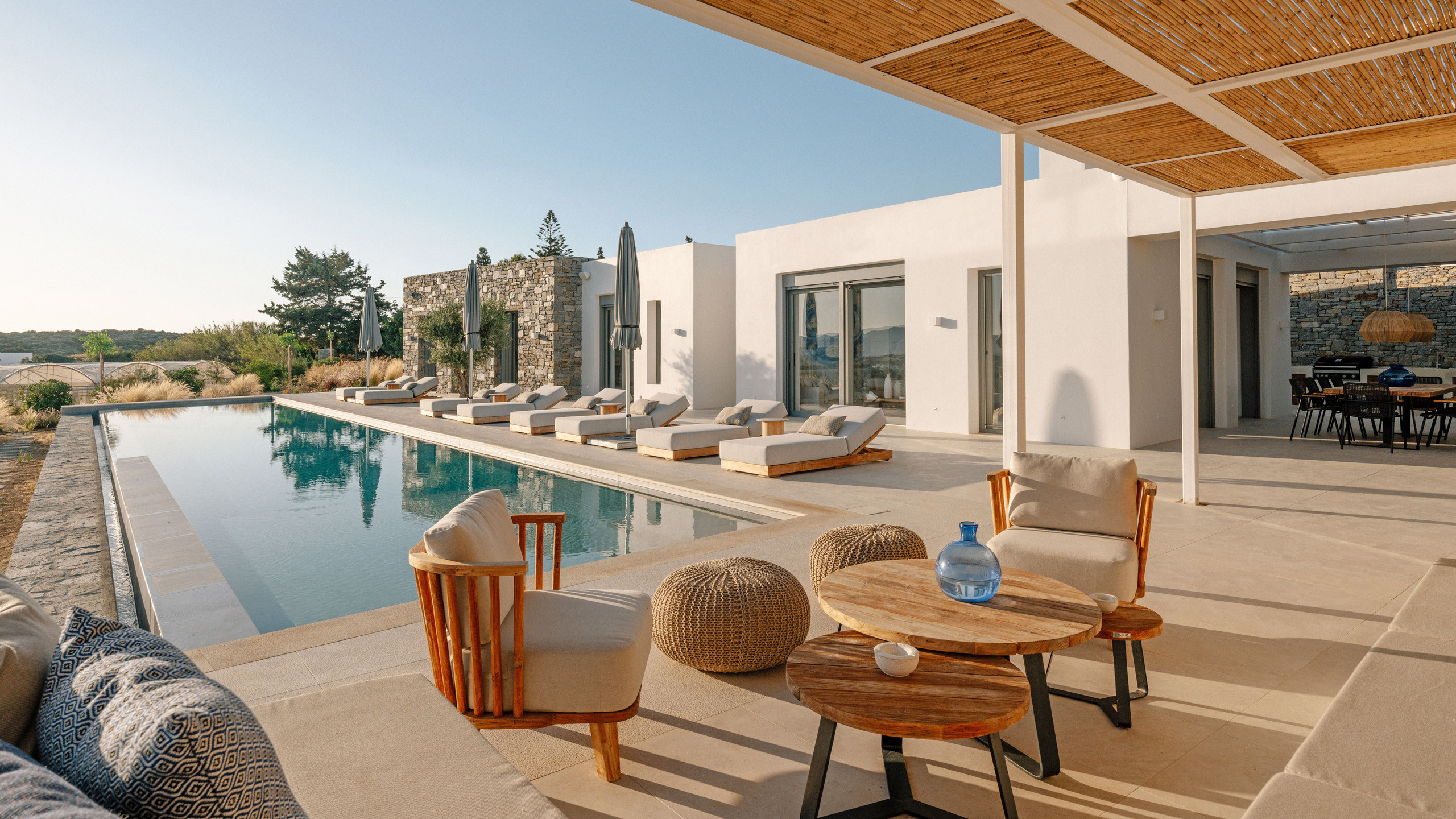 Gli esterni di Hestia sono ben realizzati, con la bella piscina in posizione frontale e una godibile zona pranzo perfettamente incastrata come ideale proseguimento del salotto e ben riparata dal sole. A disposizione dei nostri cuochi troviamo una cucina perfettamente attrezzata e una zona BBQ esterna, ideale per un pasto a qualsiasi ora con l'azzurro del mare sullo sfondo.