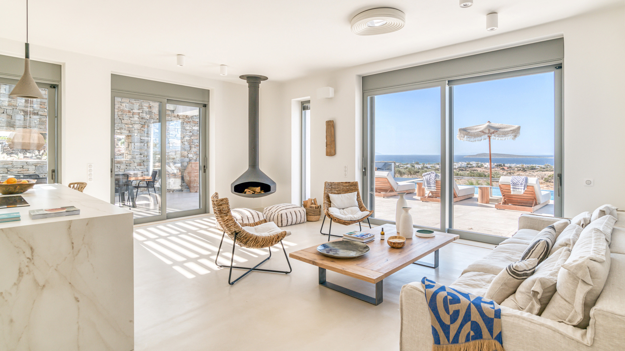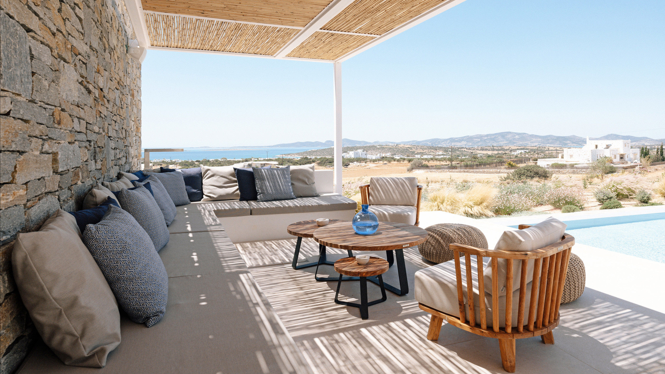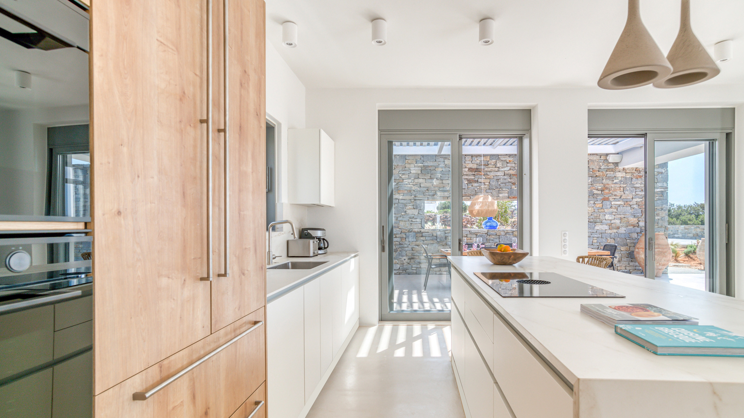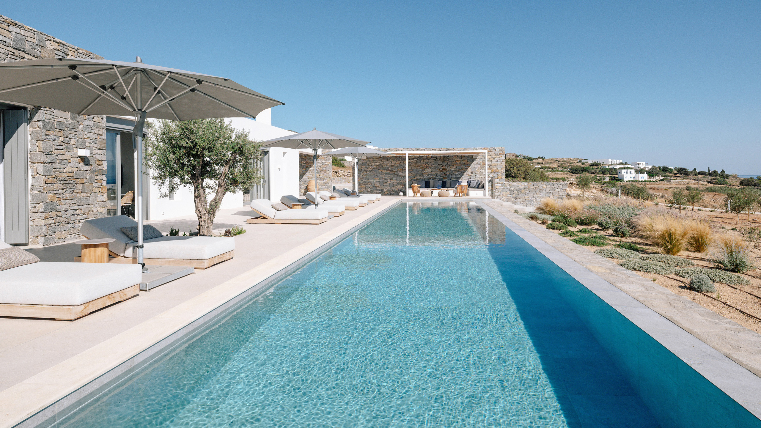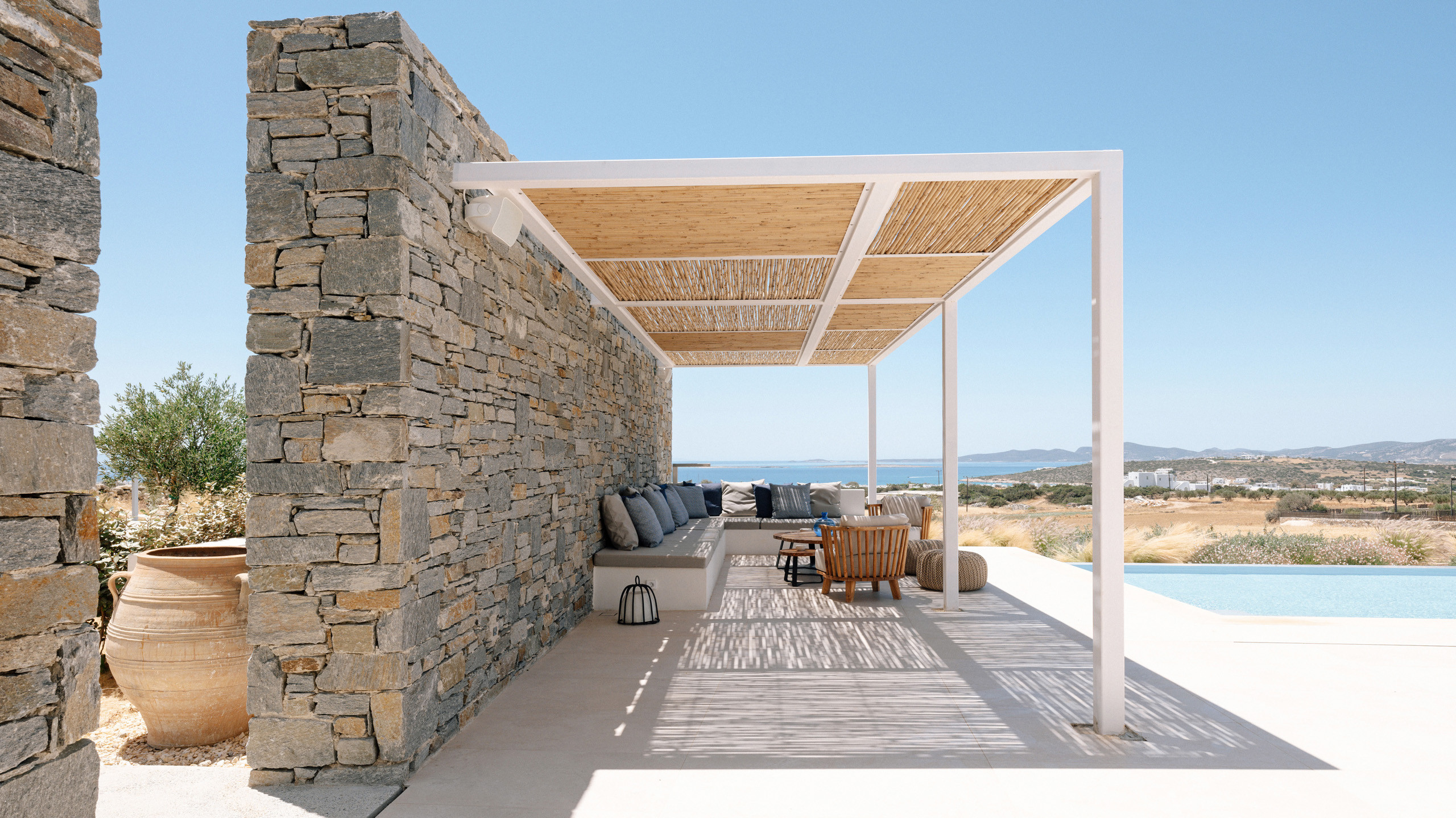 Gli esterni di Hestia sono ben realizzati, con la bella piscina in posizione frontale e una godibile zona pranzo perfettamente incastrata come ideale proseguimento del salotto e ben riparata dal sole. A disposizione dei nostri cuochi troviamo una cucina perfettamente attrezzata e una zona BBQ esterna, ideale per un pasto a qualsiasi ora con l'azzurro del mare sullo sfondo.