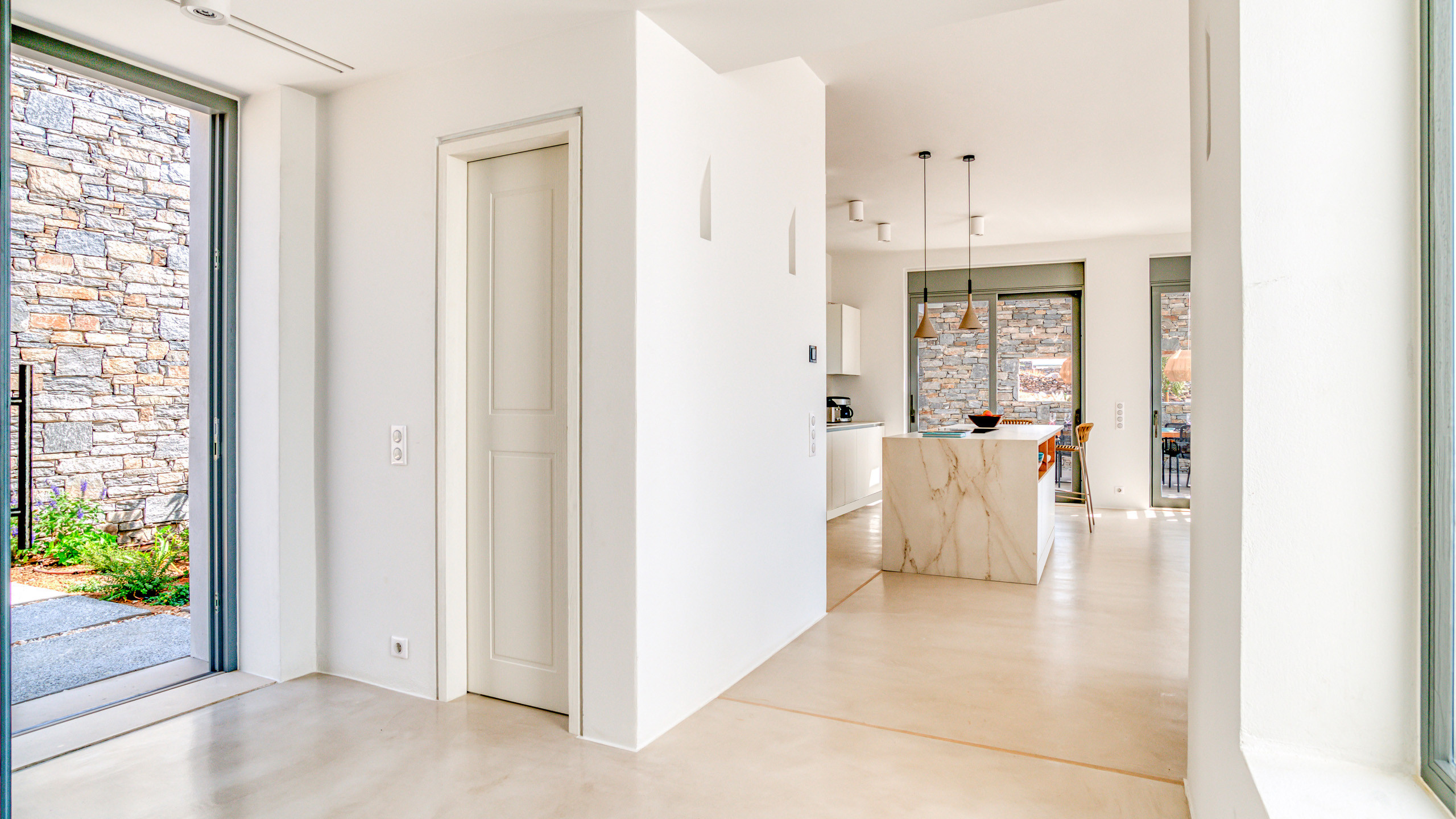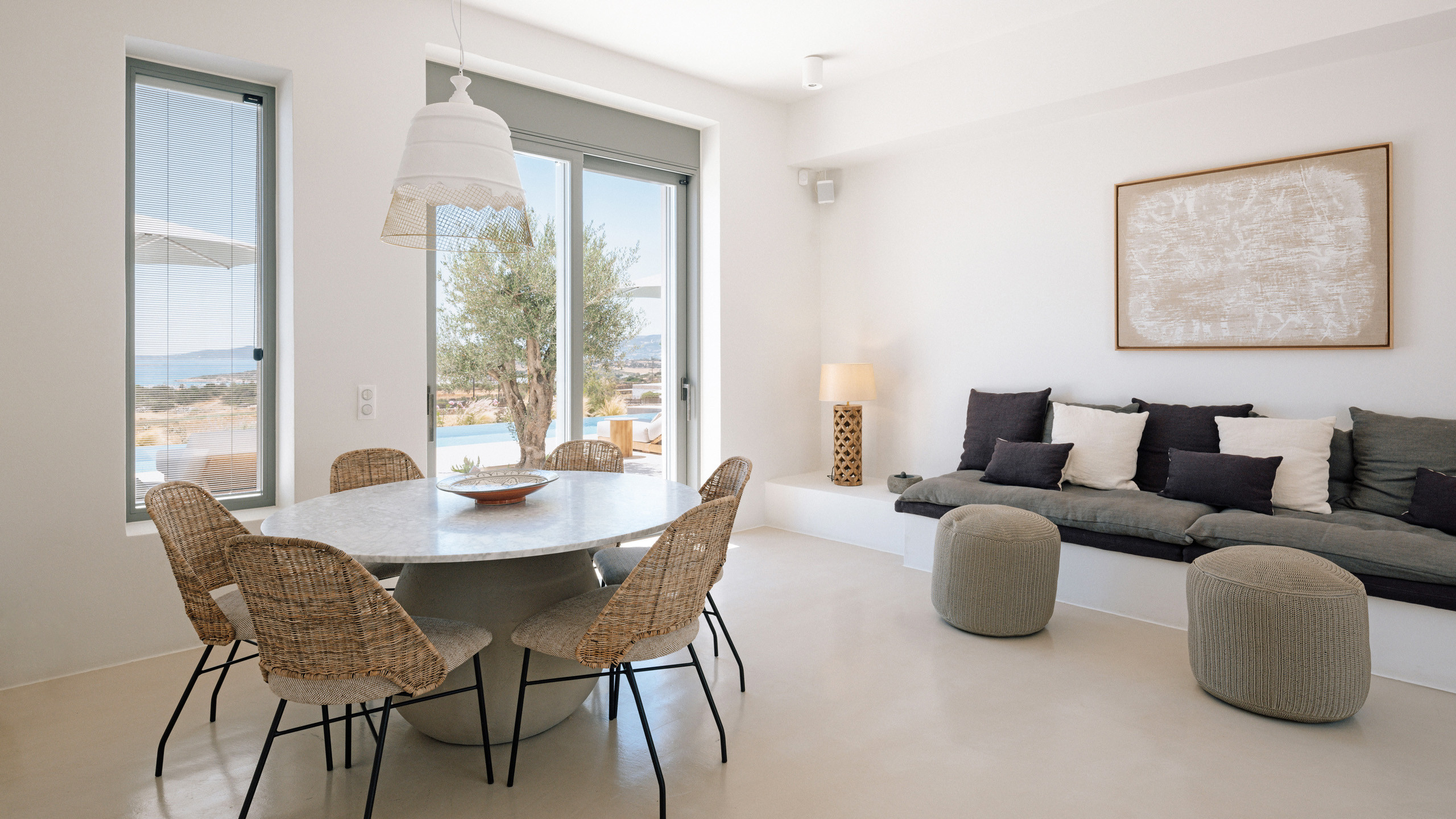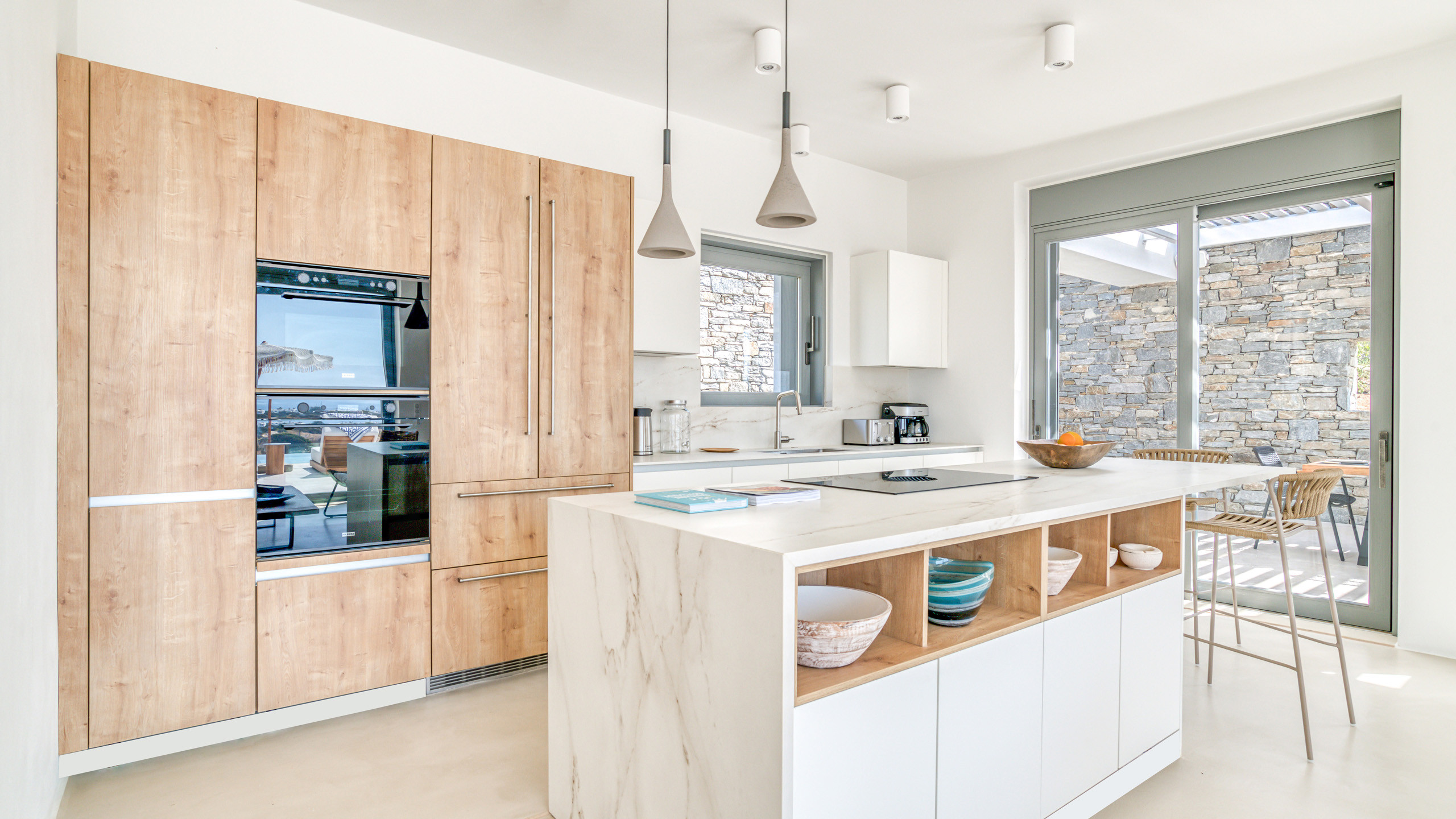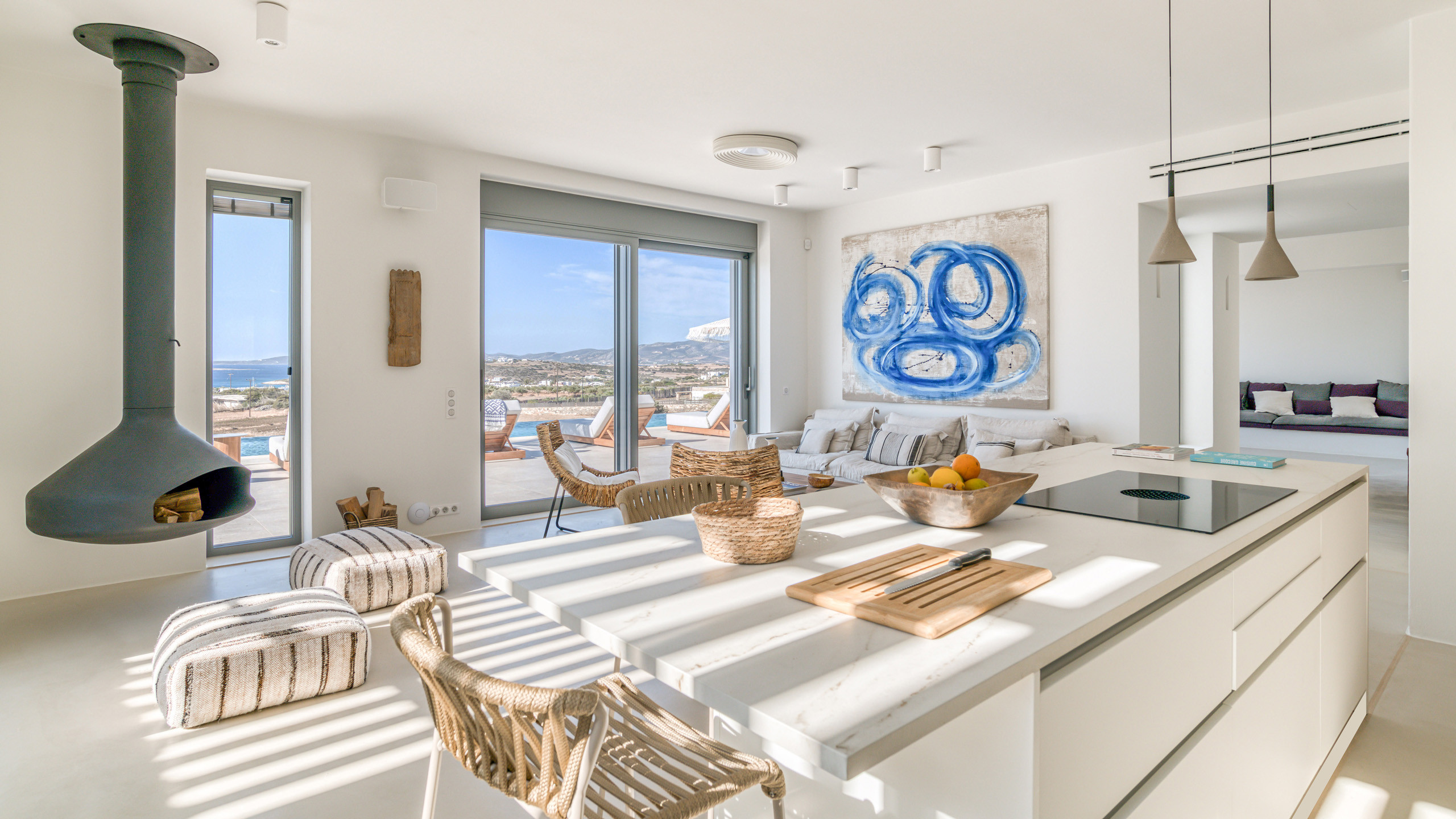 Gli esterni di Hestia sono ben realizzati, con la bella piscina in posizione frontale e una godibile zona pranzo perfettamente incastrata come ideale proseguimento del salotto e ben riparata dal sole. A disposizione dei nostri cuochi troviamo una cucina perfettamente attrezzata e una zona BBQ esterna, ideale per un pasto a qualsiasi ora con l'azzurro del mare sullo sfondo.