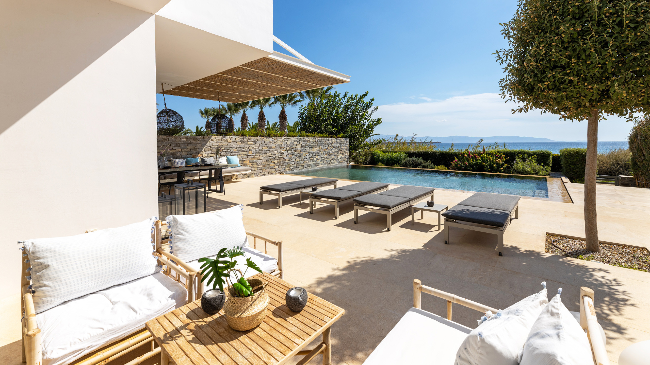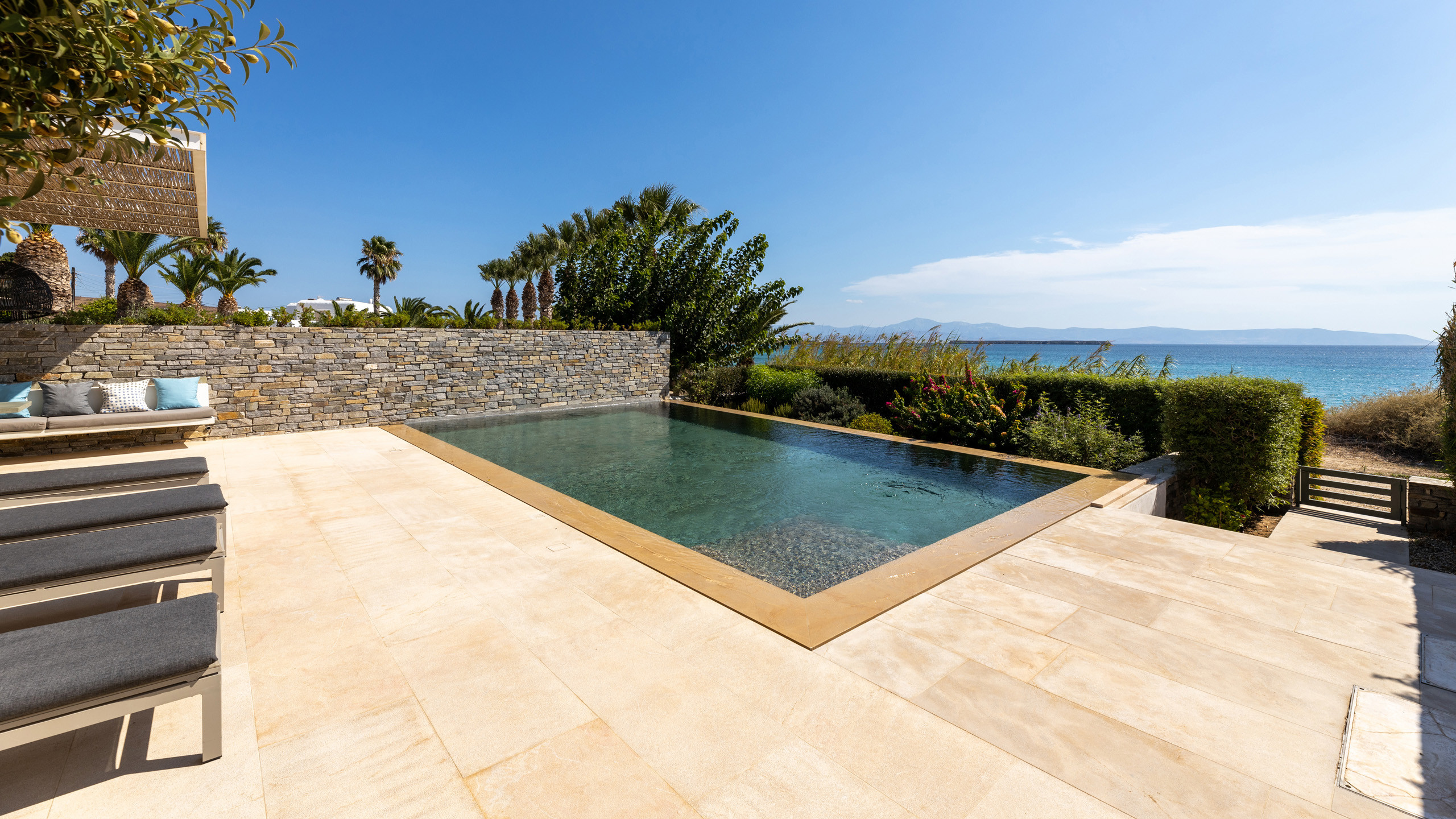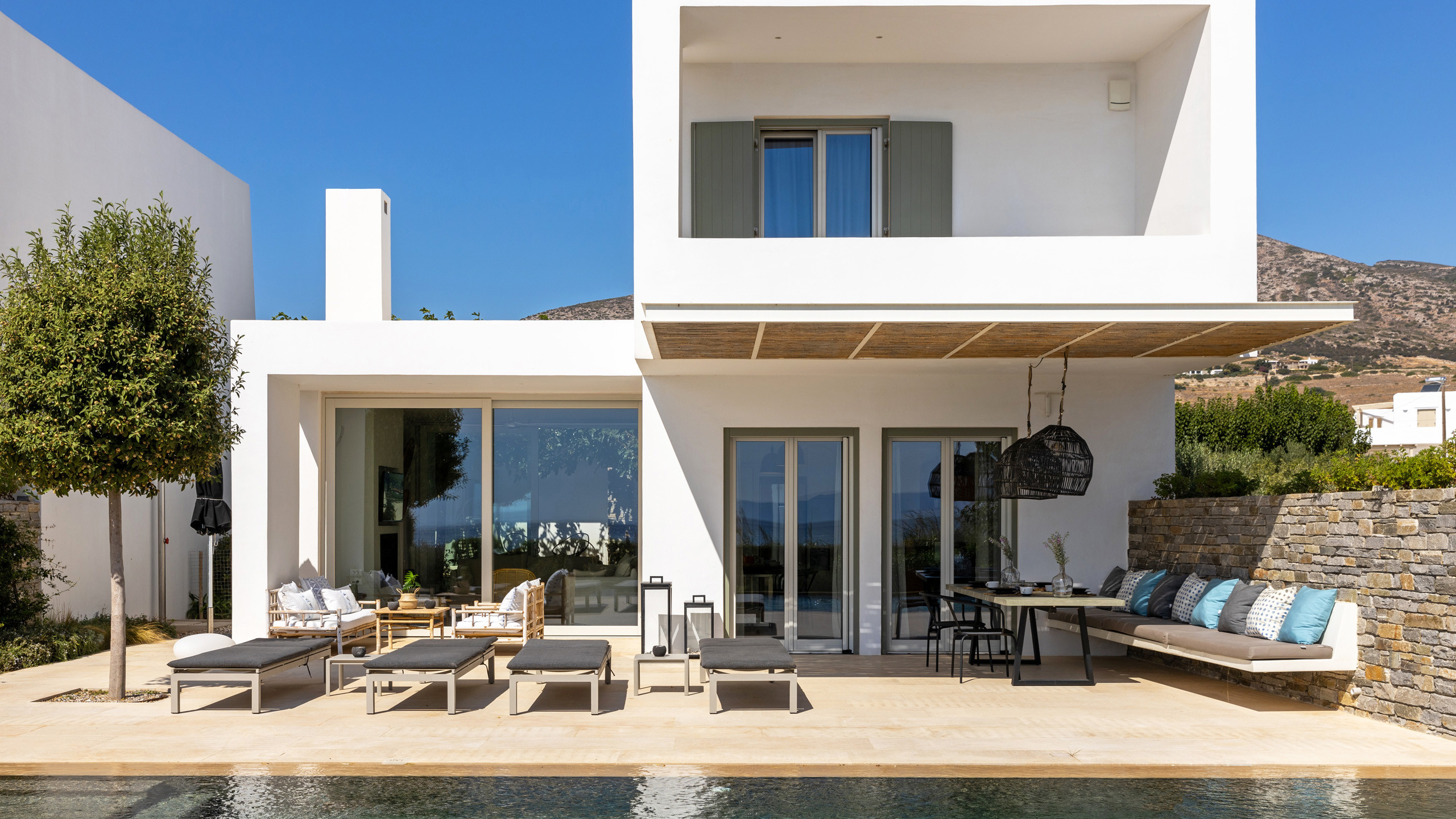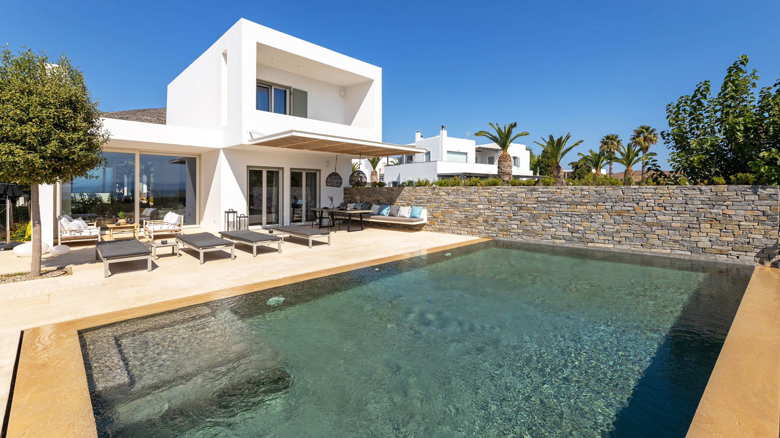 La villa è parte di un nuovo complesso composto da due abitazioni gemelle a metà strada tra Dryos e Golden Beach, con il grande vantaggio di essere direttamente fronte mare, gli ospiti possono infatti letteralmente scendere con pochi passi e raggiungere la spiaggetta vicina per una veloce nuotata.