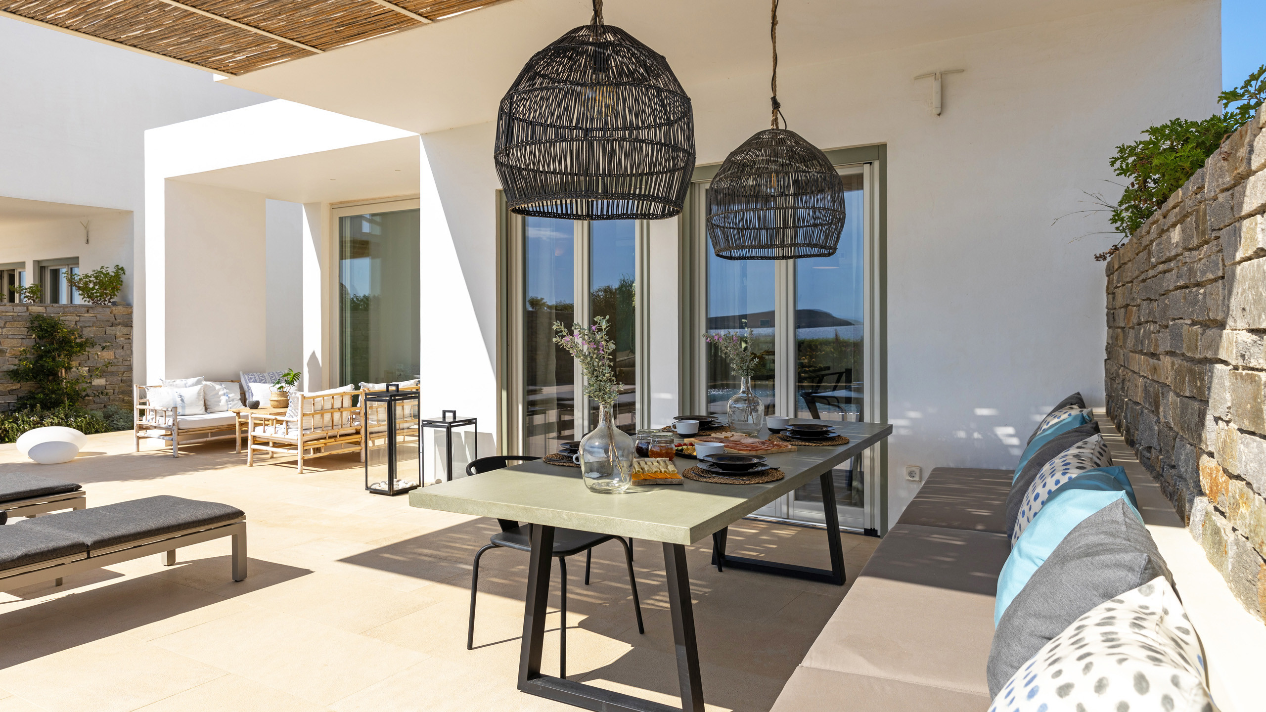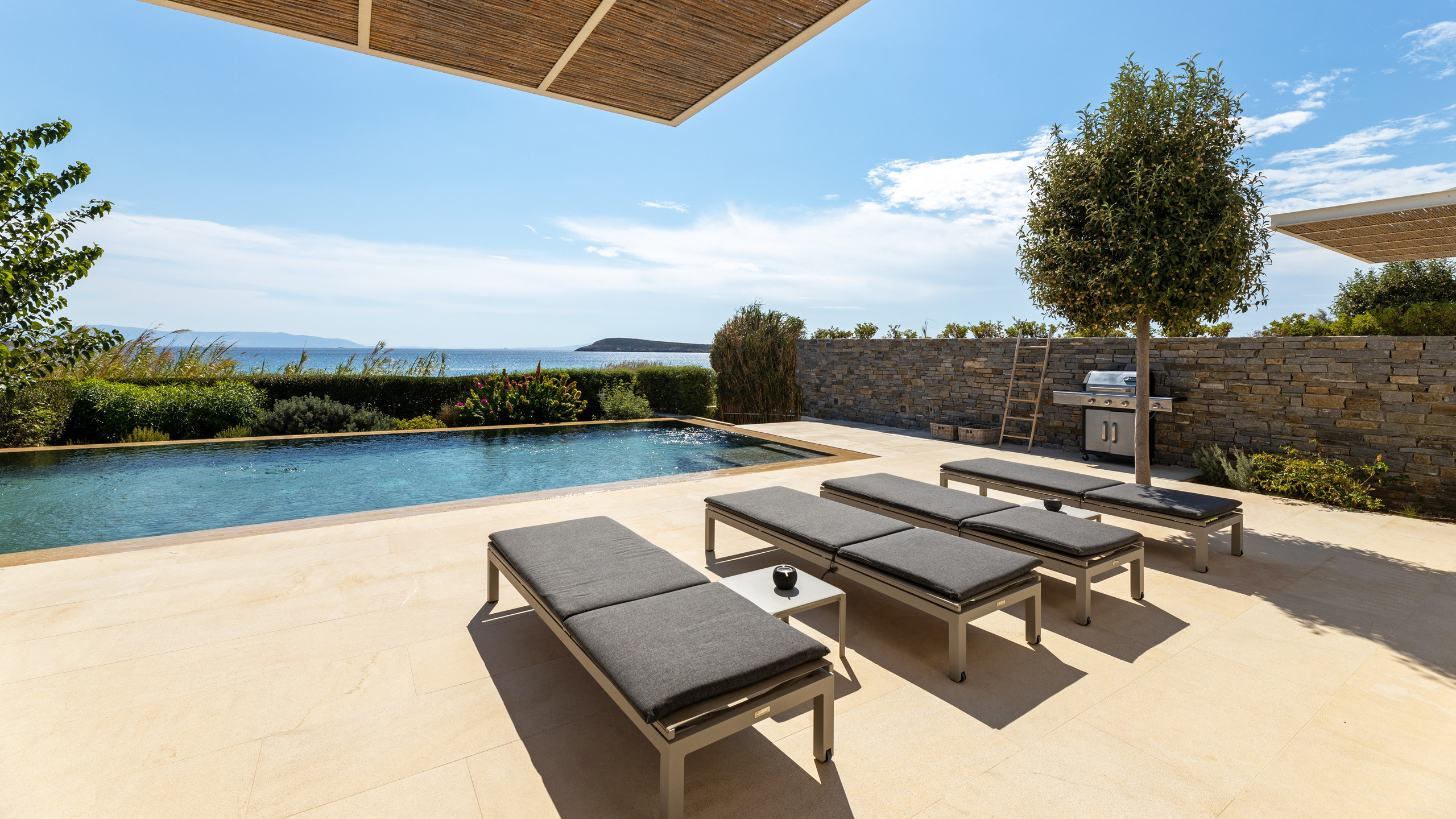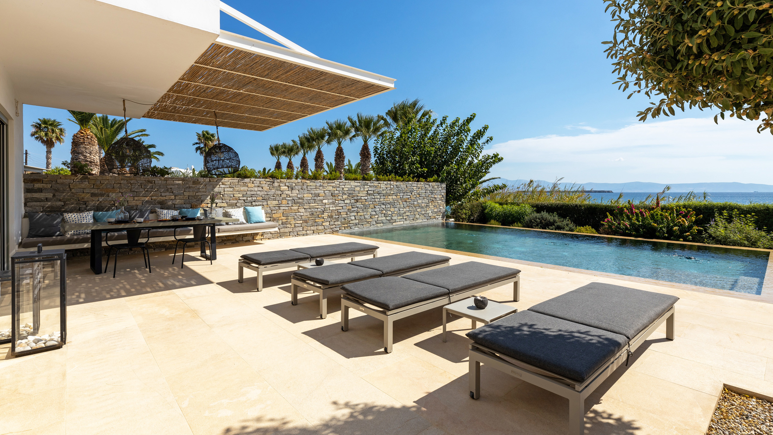 La villa è parte di un nuovo complesso composto da due abitazioni gemelle a metà strada tra Dryos e Golden Beach, con il grande vantaggio di essere direttamente fronte mare, gli ospiti possono infatti letteralmente scendere con pochi passi e raggiungere la spiaggetta vicina per una veloce nuotata.
