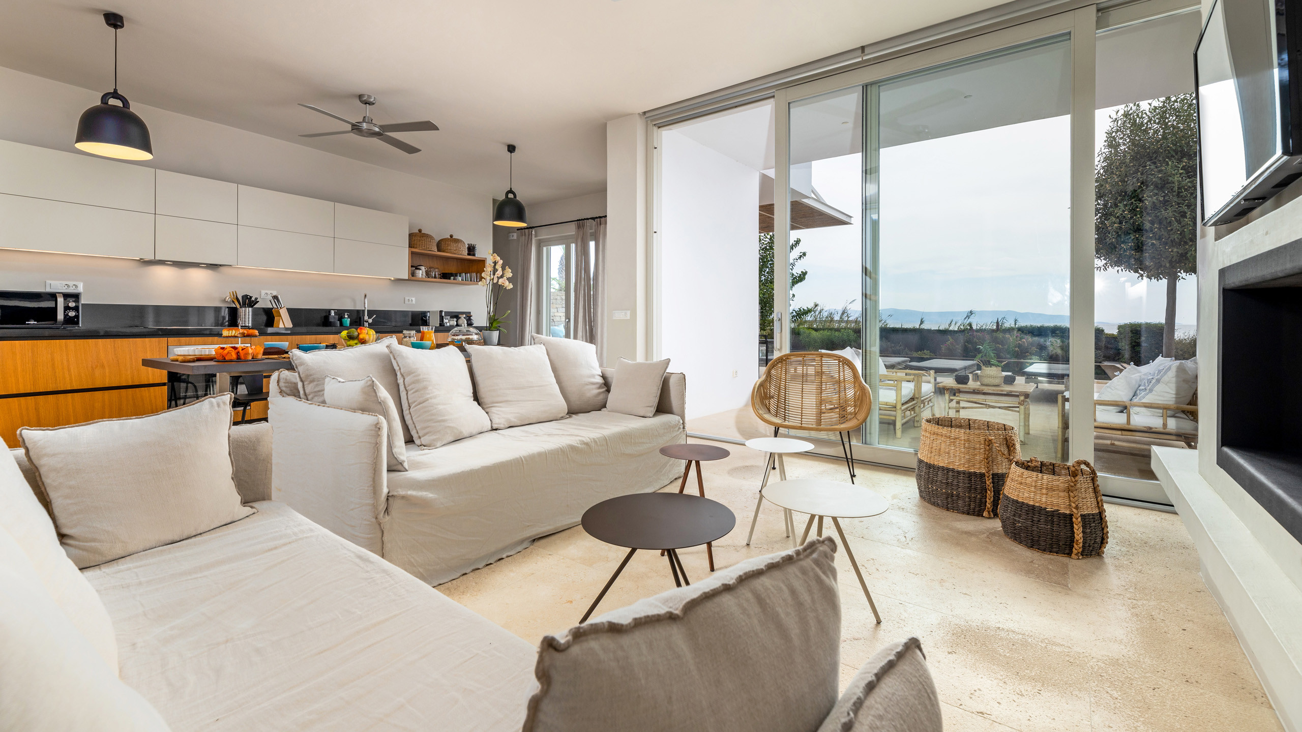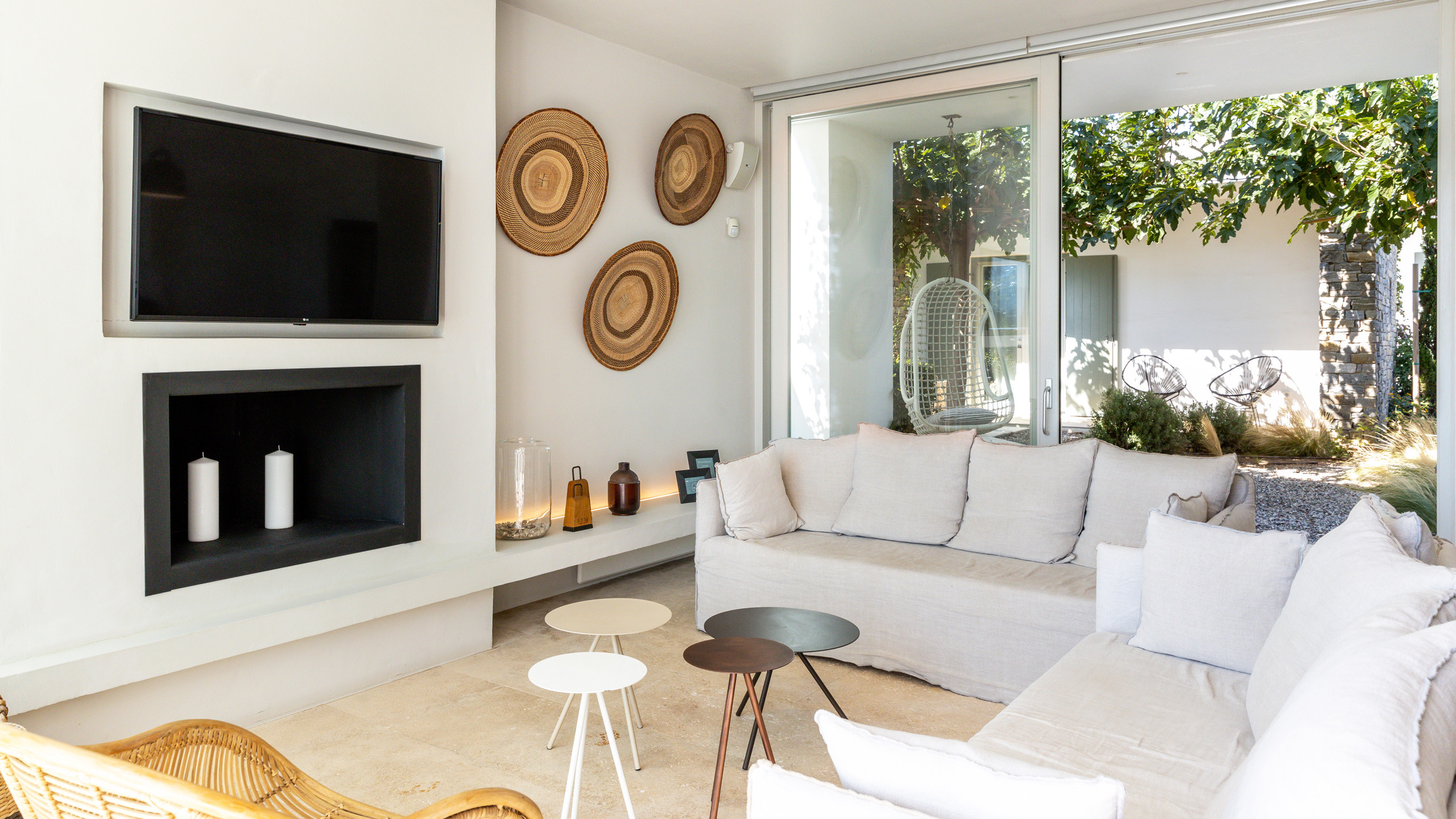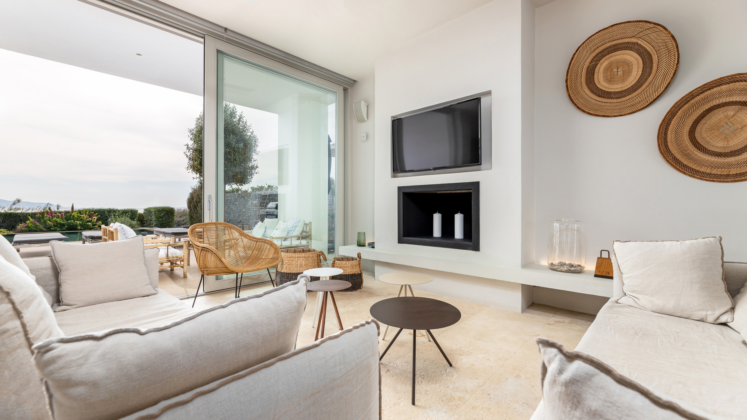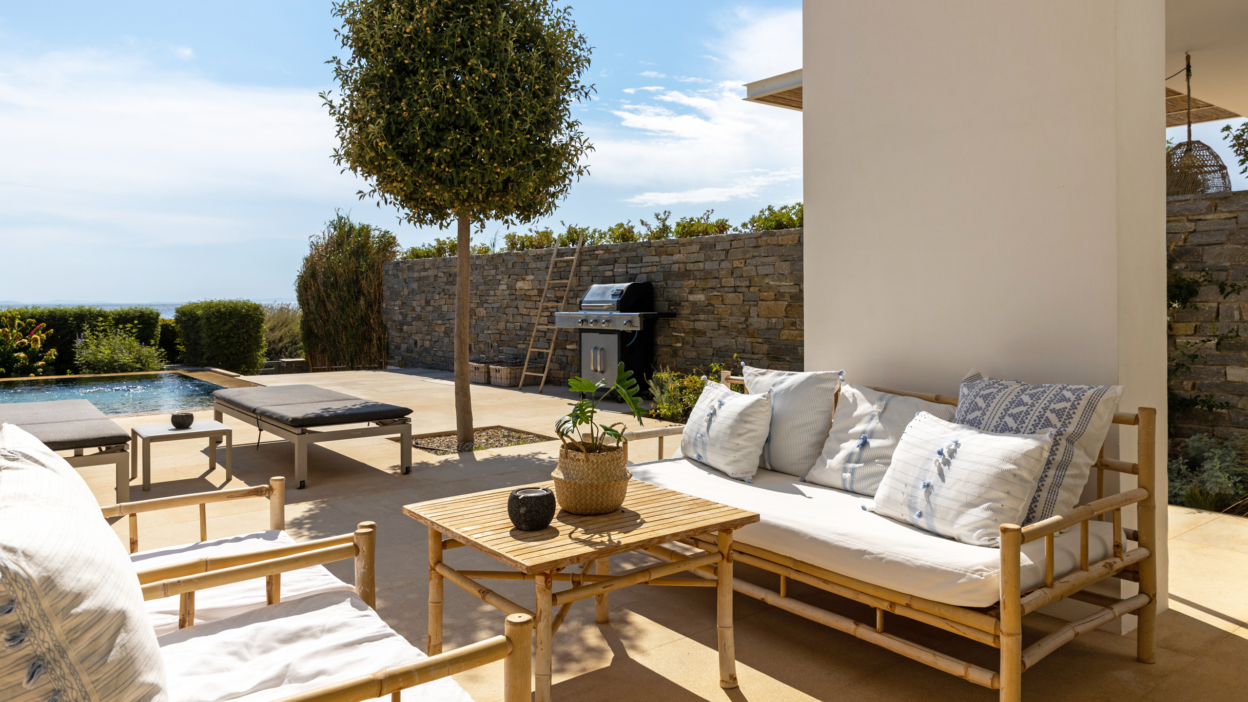 La villa è parte di un nuovo complesso composto da due abitazioni gemelle a metà strada tra Dryos e Golden Beach, con il grande vantaggio di essere direttamente fronte mare, gli ospiti possono infatti letteralmente scendere con pochi passi e raggiungere la spiaggetta vicina per una veloce nuotata.