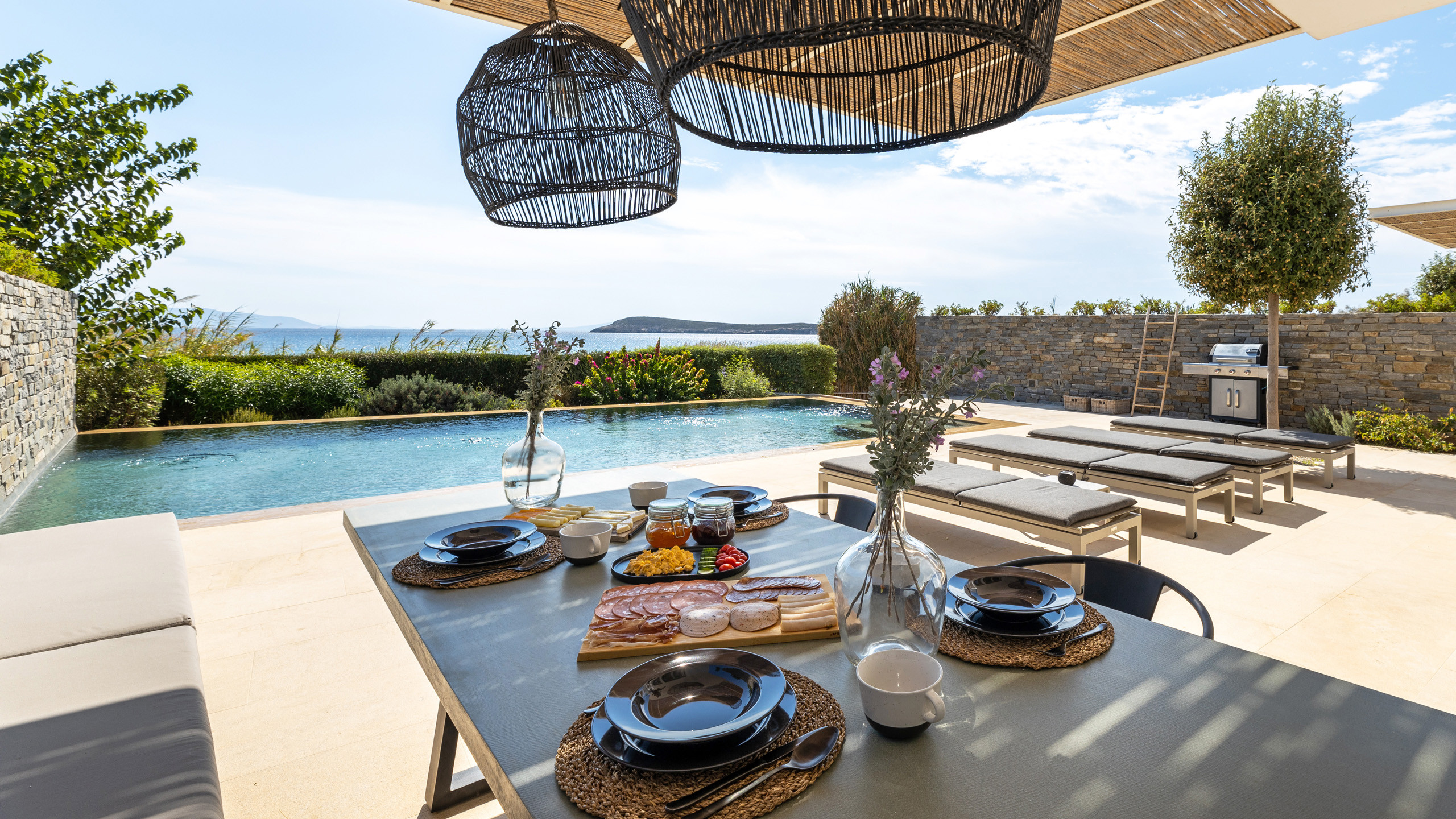 La terrazza principale beneficia della splendida vista, con la piscina infinity che sembra fondersi con il mare, circondata da un’elegante zona pranzo e relax esterna.