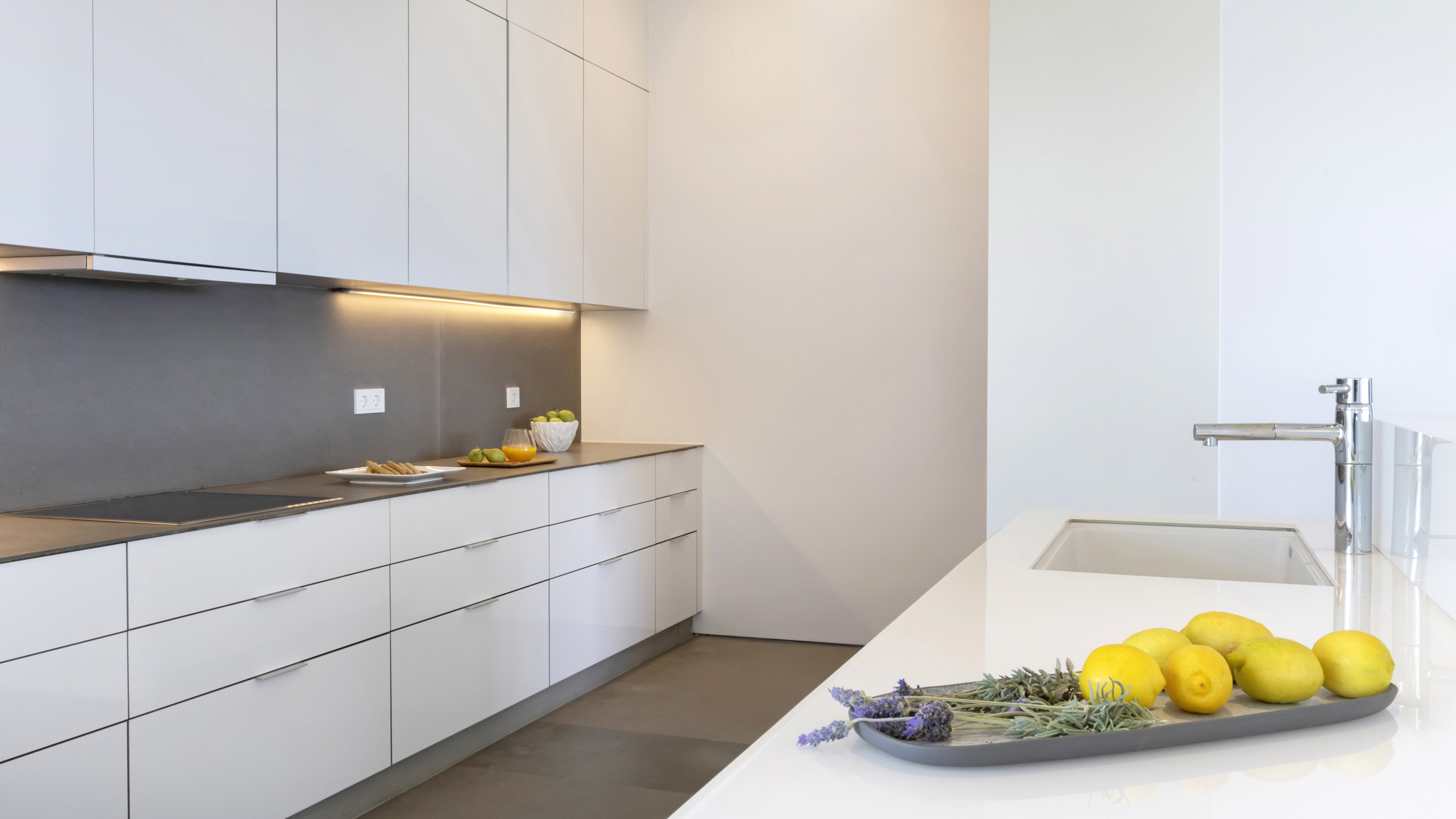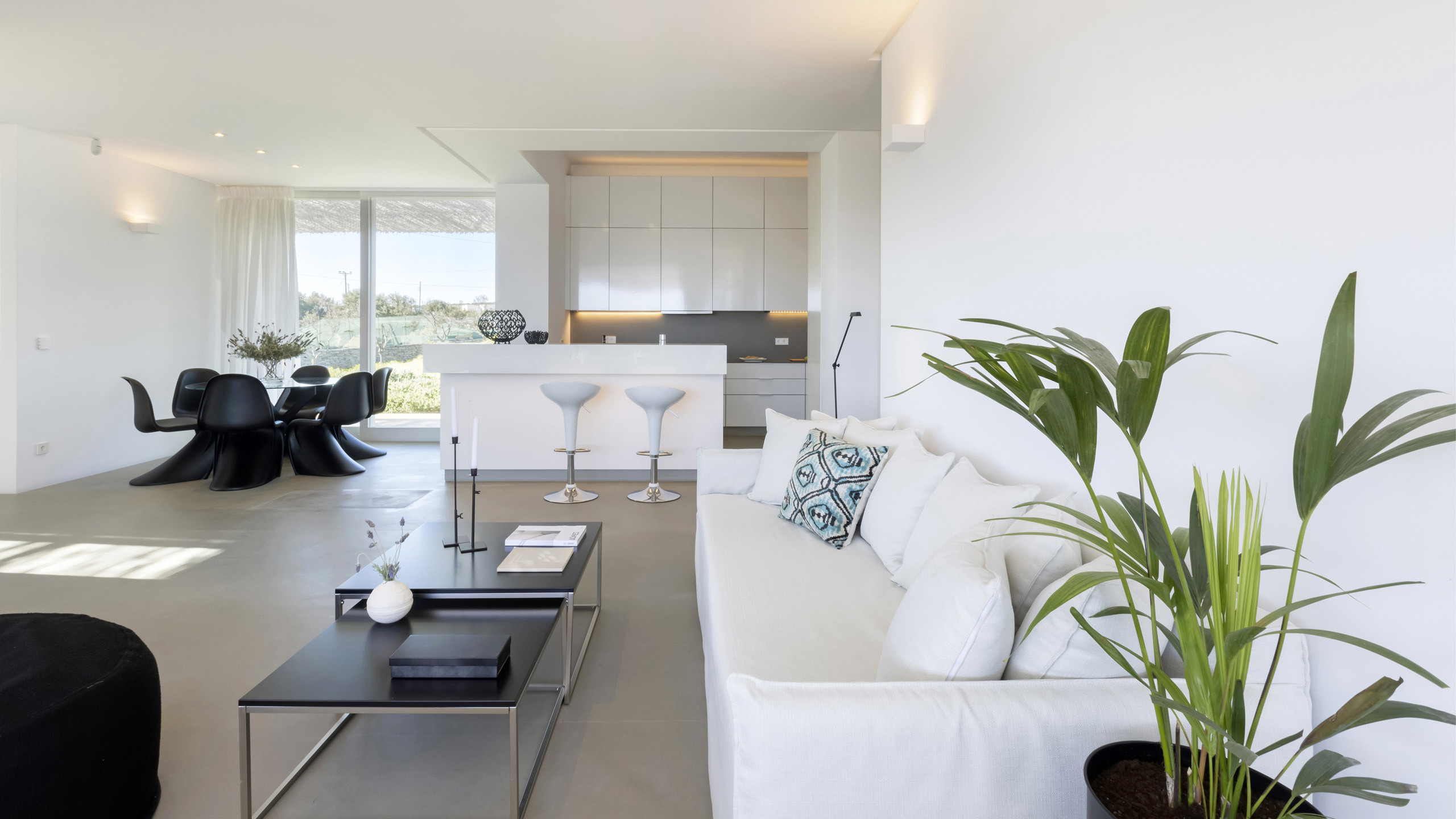 Gli interni di Paralia One sono freschi e moderni, con il bianco che la fa da padrone e pochi e selezionati elementi d'arredo a fare da complemento. L'atmosfera è sobria e rilassata, con tutte le dotazioni tecnologiche e comfort a disposizione sia nelle aree comuni che nelle 4 camere da letto suddivise sui due livelli della proprietà.