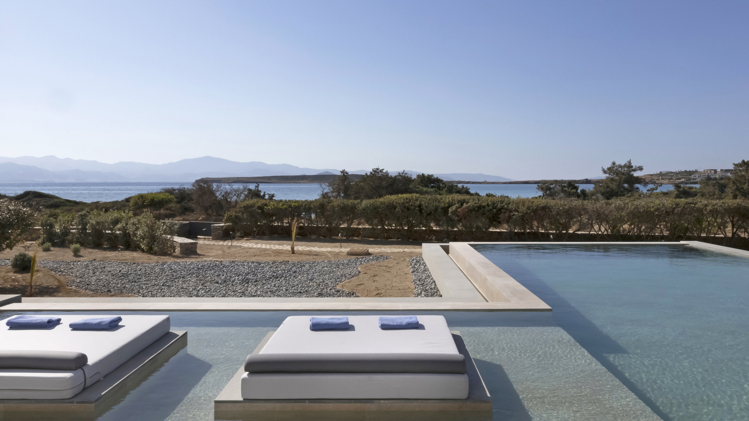 L'edificio è di chiara ispirazione contemporanea, con dettagli architettonici interessanti, pur senza stravolgere l'idea di una classica abitazione Cicladica. L'immancabile piscina privata è la protagonista della terrazza principale, posizionata in prima linea verso il mare. Alle sue spalle troviamo una piacevole zona pranzo e salottino esterno per il comfort degli ospiti, con la piacevole vista sempre godibile sullo sfondo.