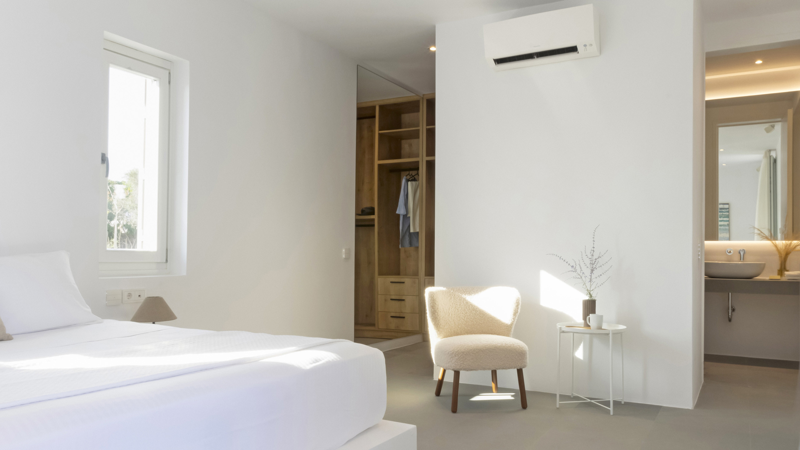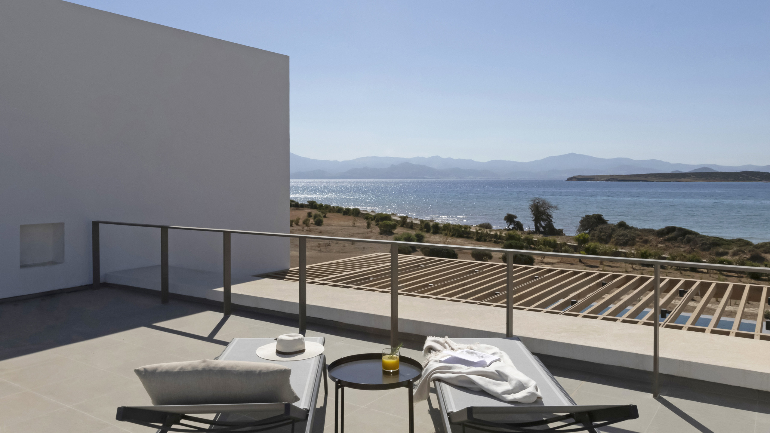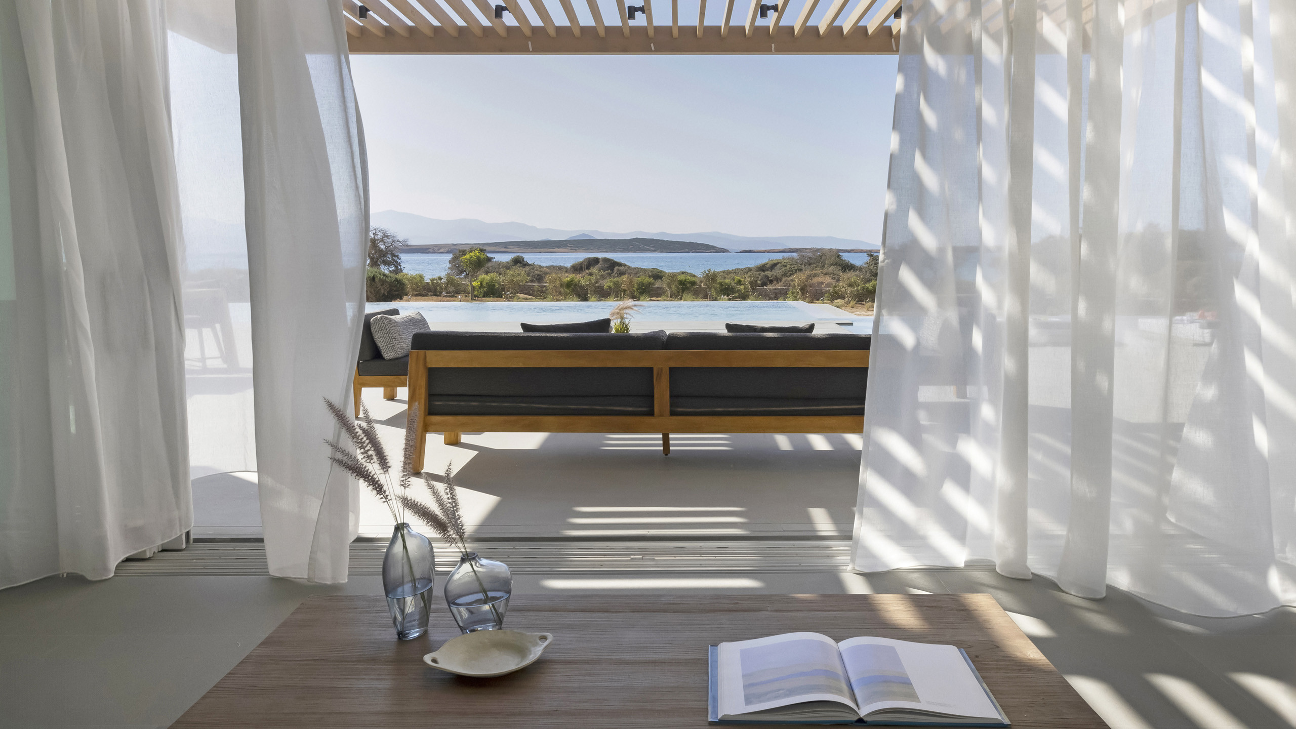 L'architettura ricorda la tradizione Cicladica, ma rivisitata decisamente in chiave moderna, con accorgimenti e soluzioni tipici del lavoro di un noto team di architetti locali. La piscina è la protagonista della terrazza esterna, con l'immancabile zona pranzo e salottino molto piacevoli per il comfort e relax degli ospiti, con l'onnipresente vista del mare poco lontano sullo sfondo.