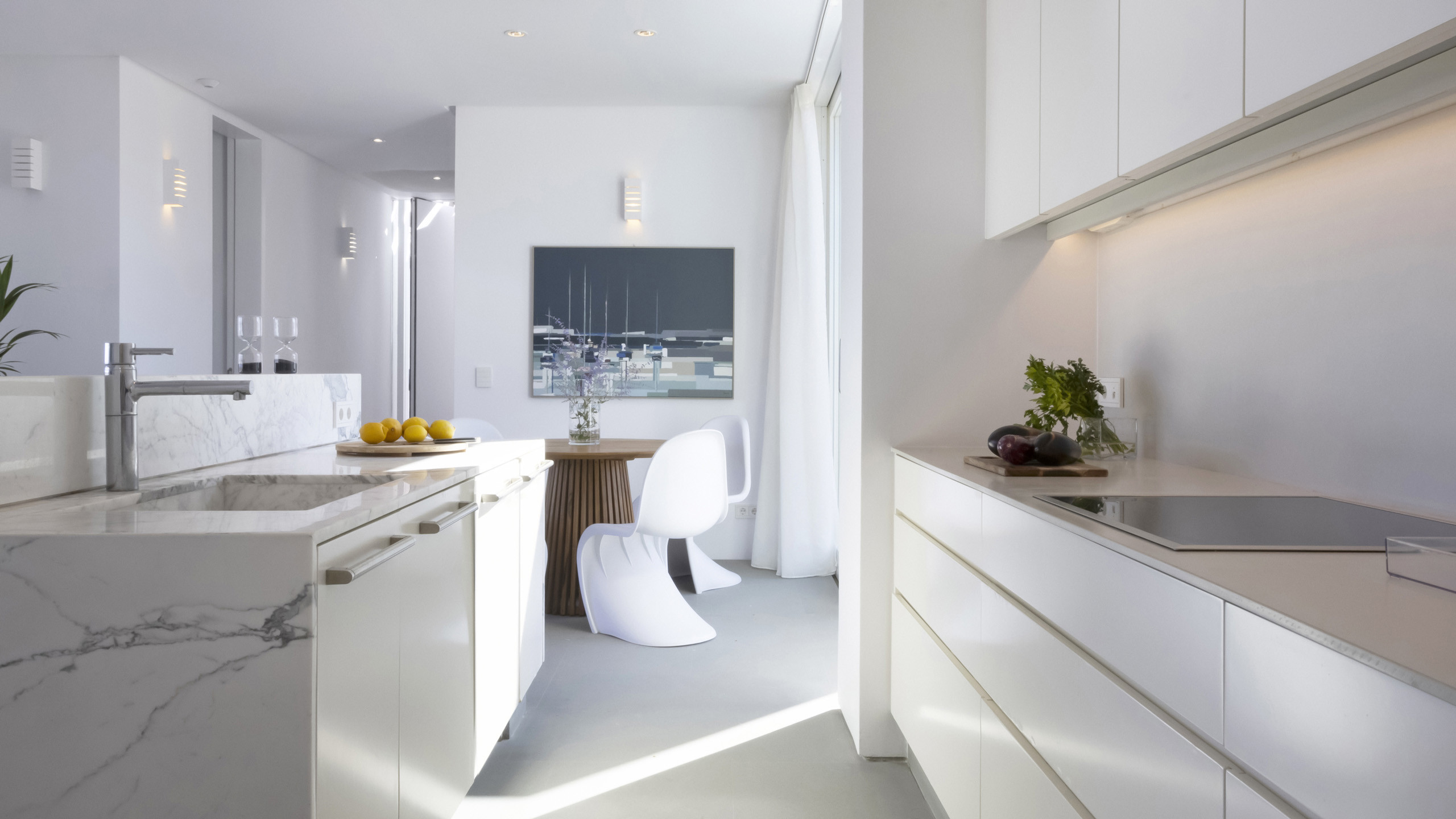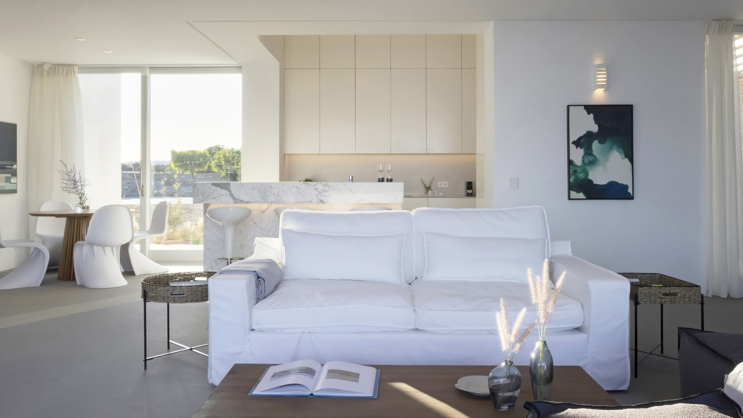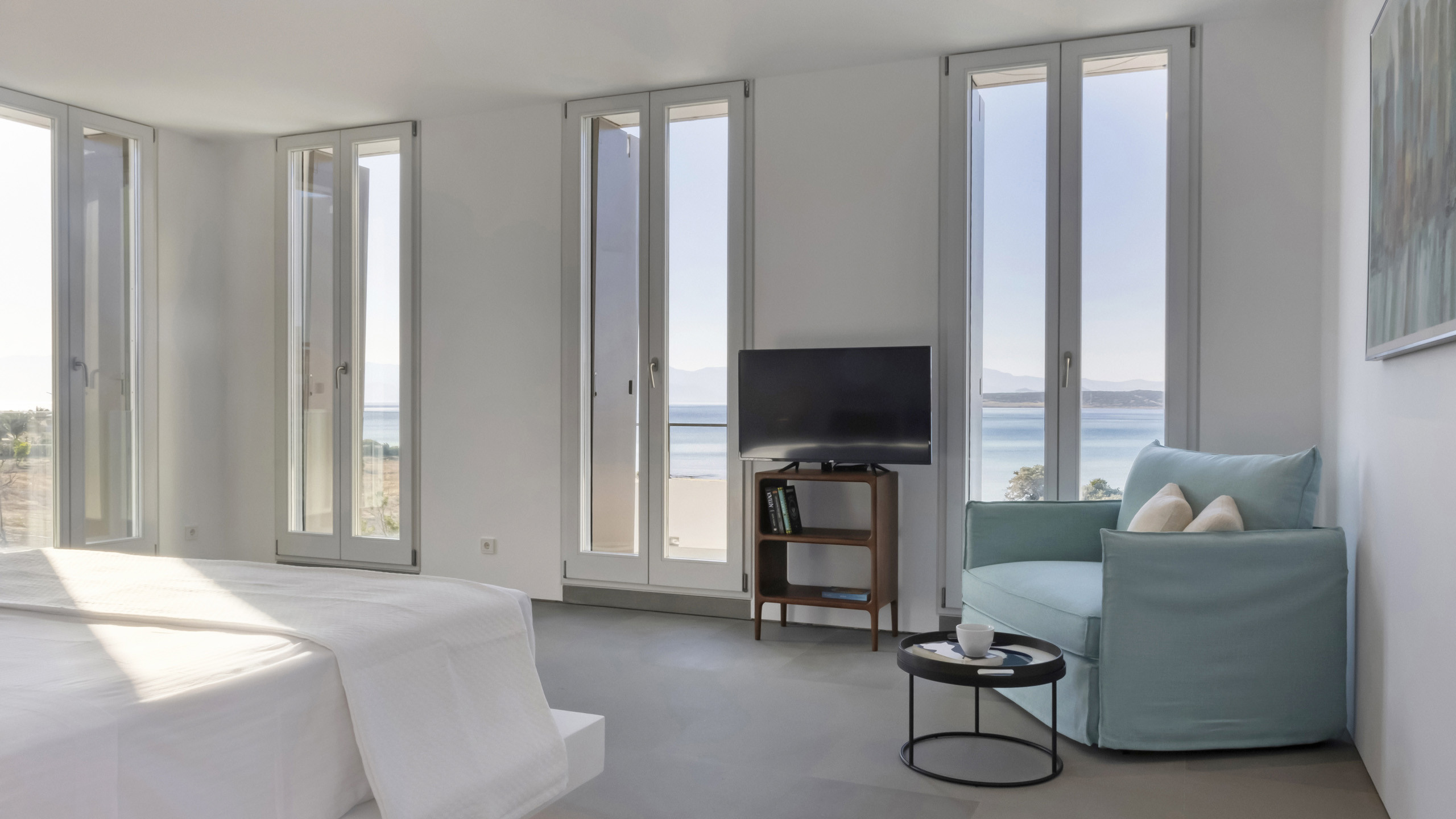 L'architettura ricorda la tradizione Cicladica, ma rivisitata decisamente in chiave moderna, con accorgimenti e soluzioni tipici del lavoro di un noto team di architetti locali. La piscina è la protagonista della terrazza esterna, con l'immancabile zona pranzo e salottino molto piacevoli per il comfort e relax degli ospiti, con l'onnipresente vista del mare poco lontano sullo sfondo.