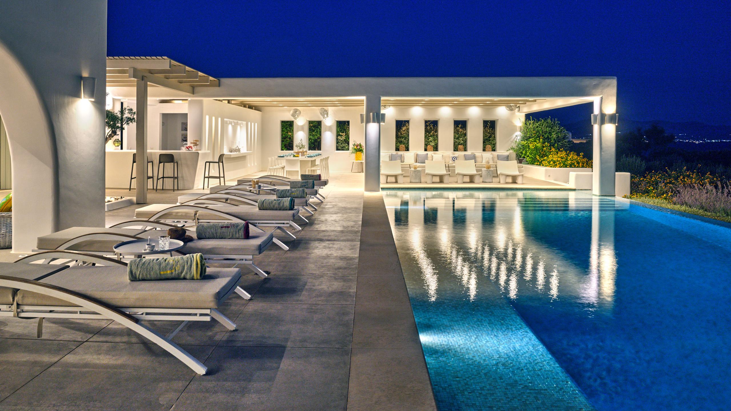 Gli esterni sono sostanzialmente speculari, con due terrazze che ospitano le rispettive piscine e zone pranzo di pertinenza, cambiano solo le dimensioni che riflettono quella delle abitazioni prese singolarmente. Tutti i comfort sono a disposizione degli ospiti che possono ritrovarsi all'aperto per rilassarsi al sole o gustare un aperitivo preparato al bar a bordo piscina.
