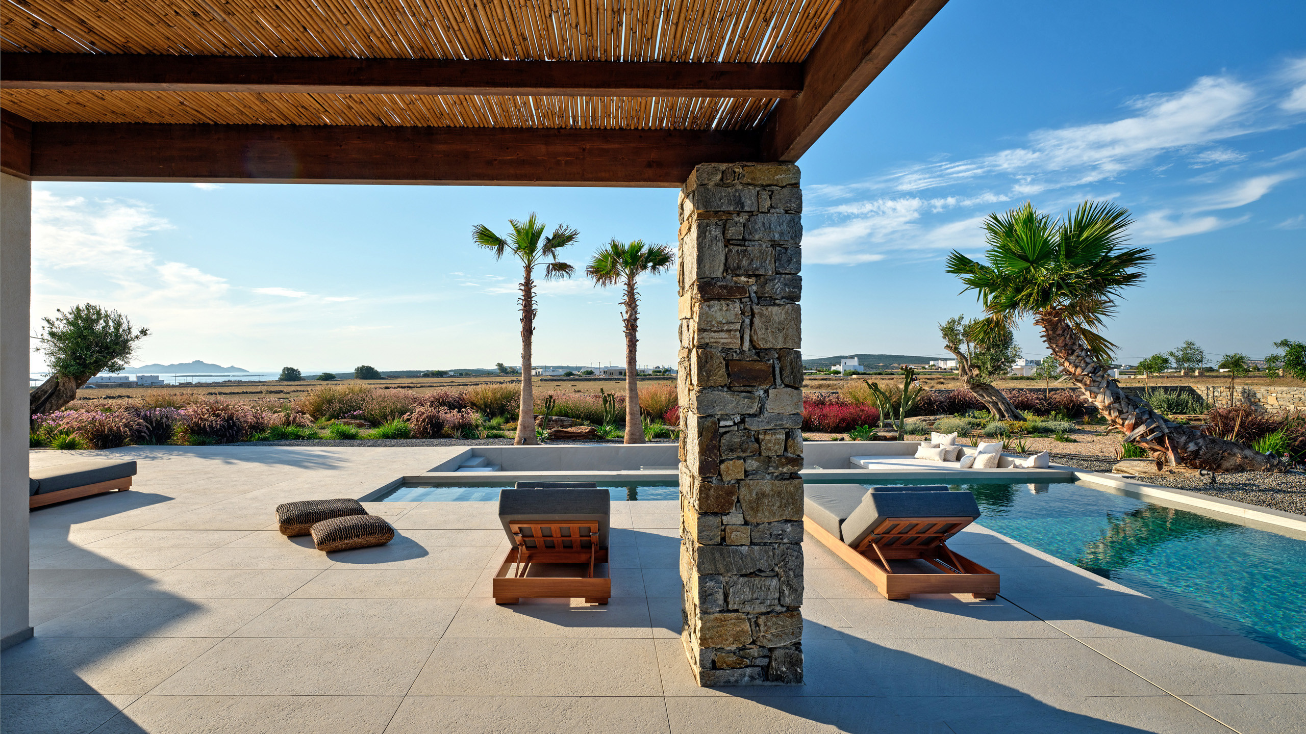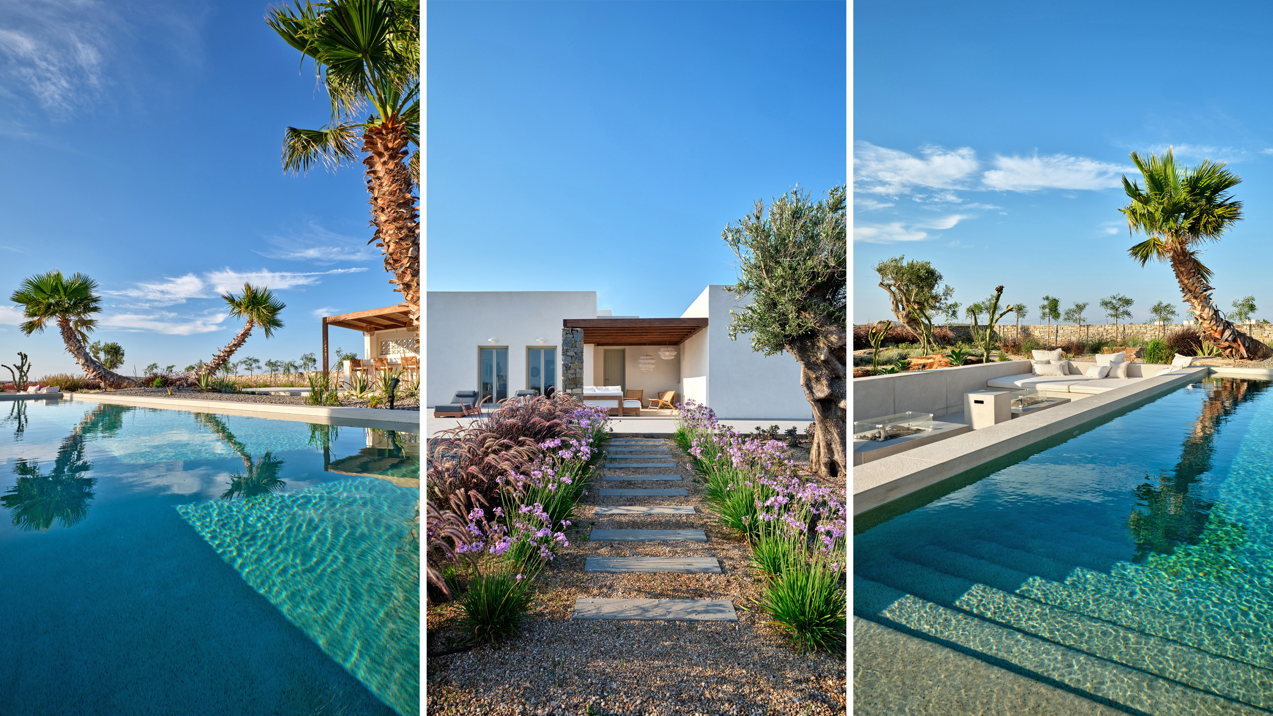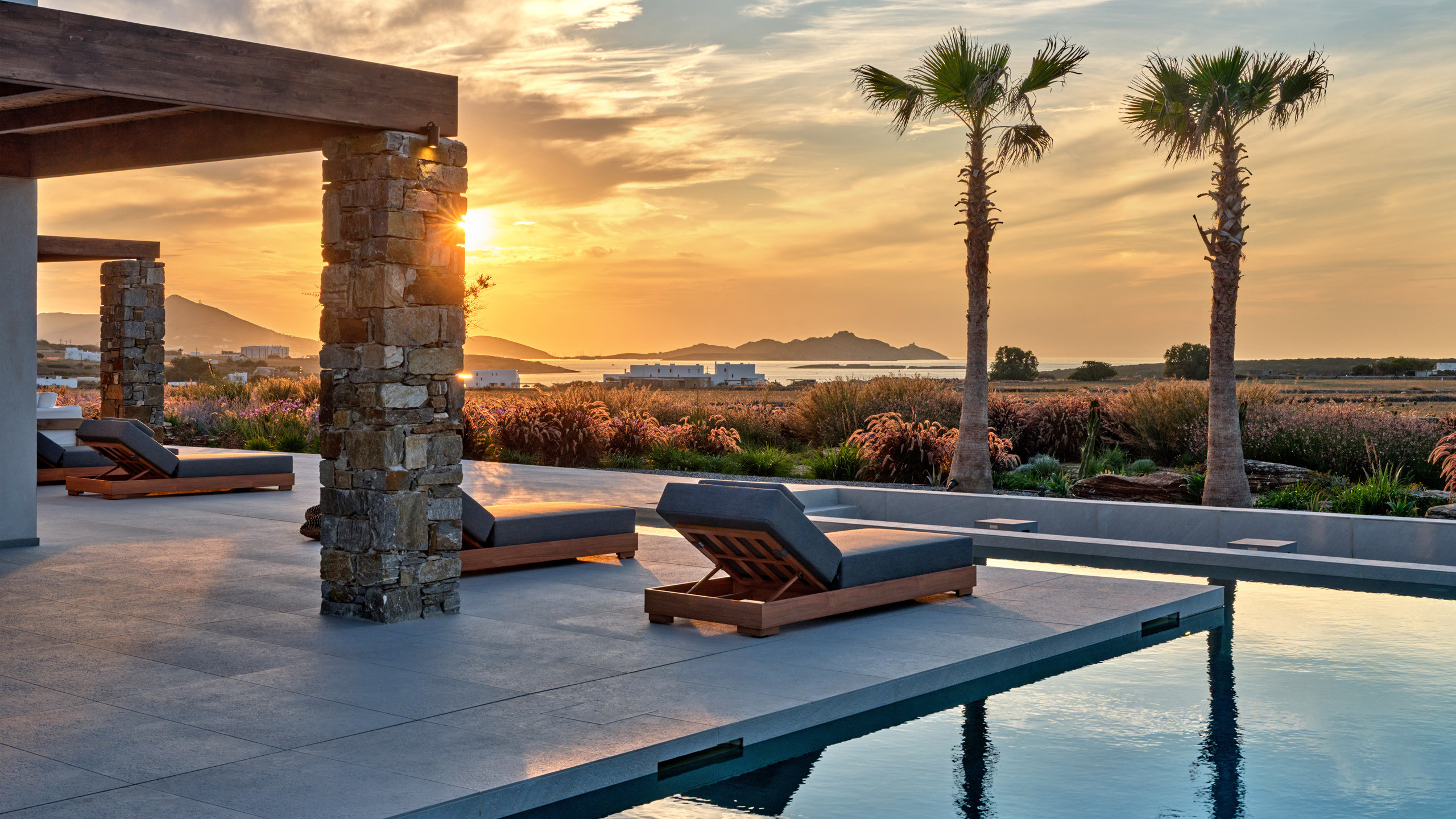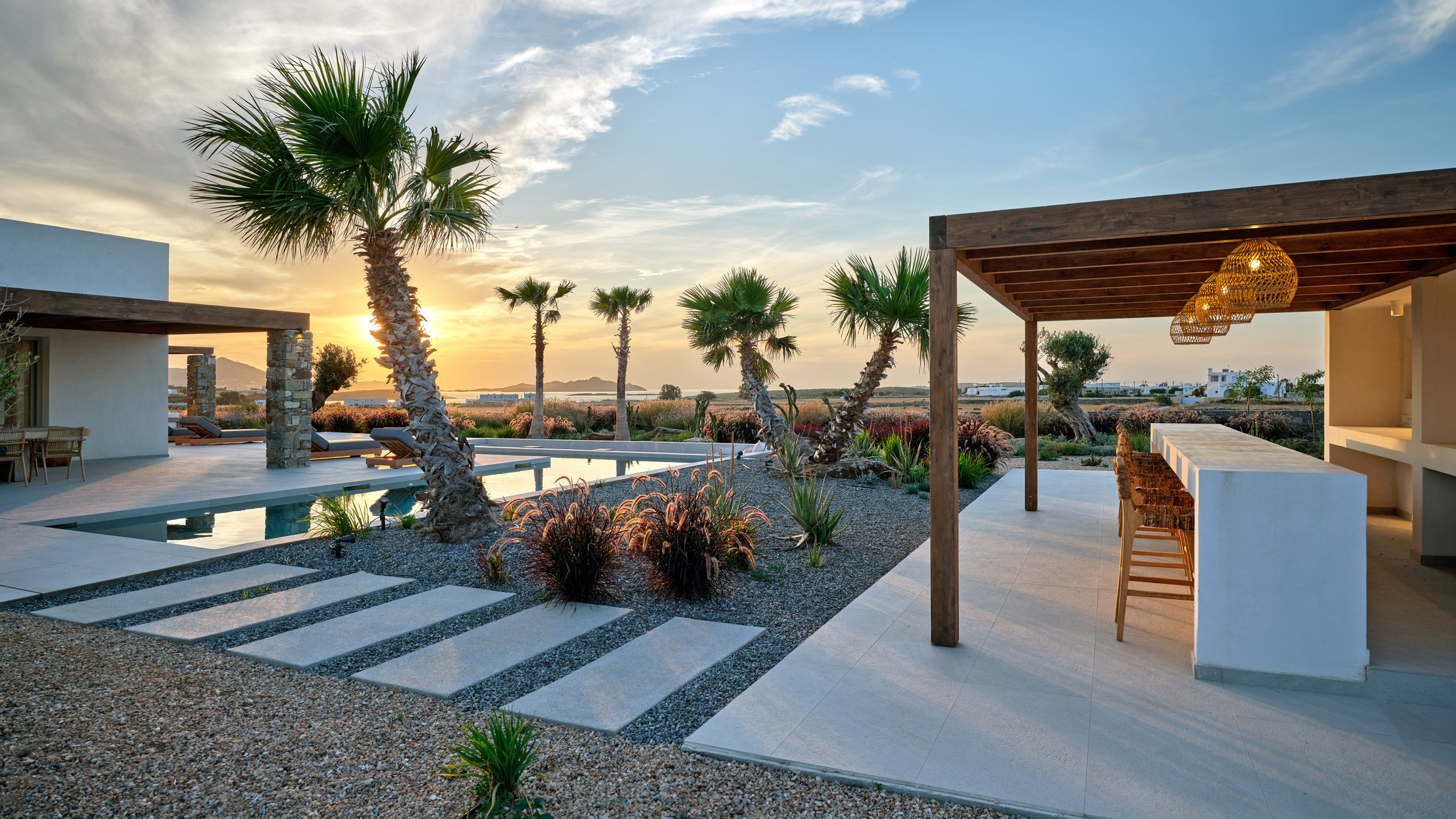 Nella campagna incontaminata, a metà strada tra la spiaggia di Santa Maria e la cittadina di Naoussa, sorge quella che si può definire a tutti gli effetti una vera e propria oasi. Twin Palms, circondata da un magnifico giardino ricco di moltissime varietà di piante, tra cui le famose palme da cui prende il nome, gode di un'ottima privacy restando a breve distanza da alcune delle principali attrazioni di Paros, in una posizione realmente favorevole.