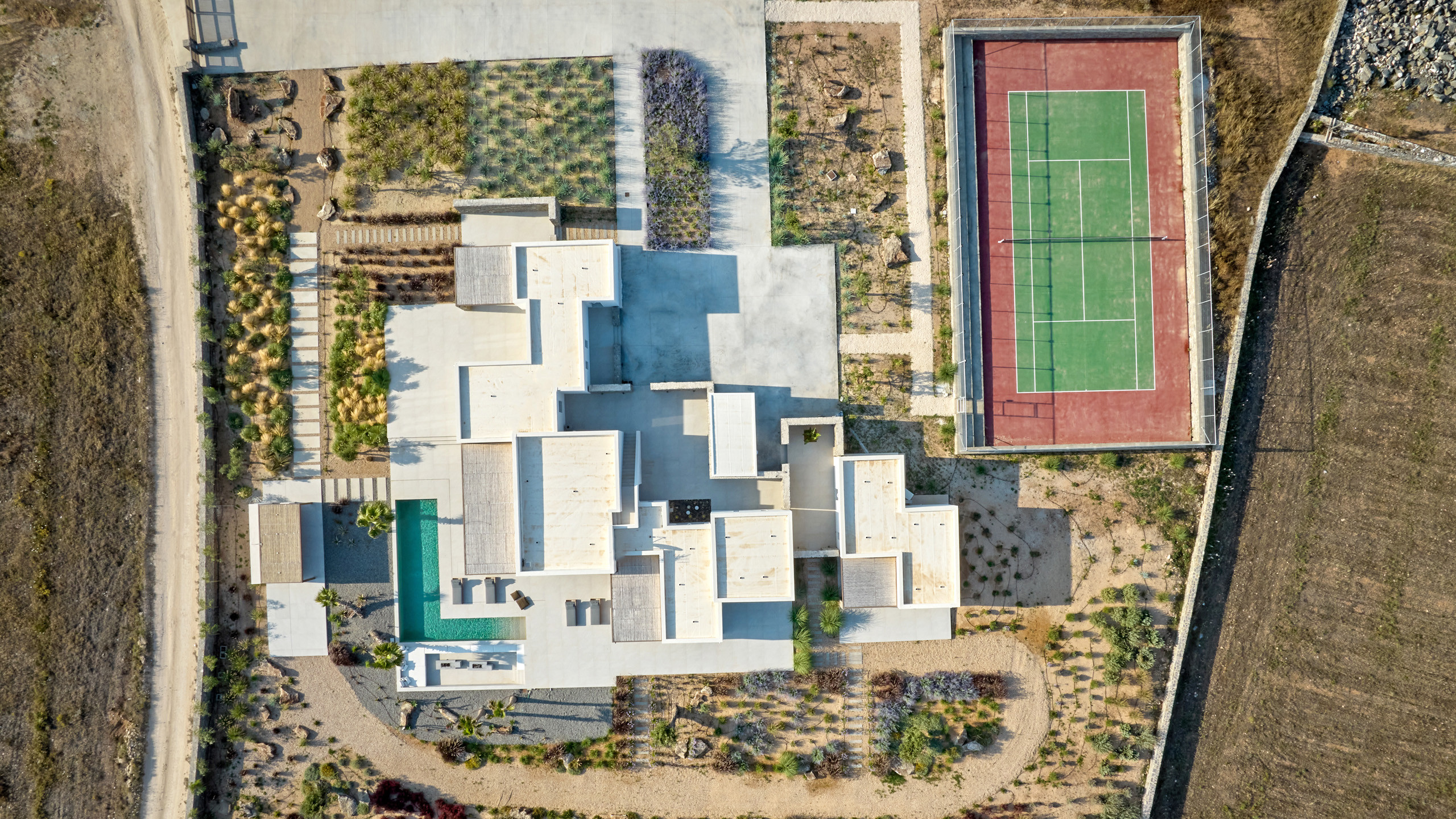 Gli esterni sono ben disegnati, con una bella piscina sagomata a "L" e un attraente bar ad una estremità a rubare la scena. All'estremità opposta trova spazio la zona pranzo esterna, all'ombra di un'ampia pergola e ben servita dalla cucina poco distante e collegata con ampie porte finestre. Ancora una volta vale la pena soffermarsi sul rigoglioso giardino perfettamente tenuto nel quale si inserisce, ciliegina sulla torta, un campo da tennis privato, perfetto per tenersi in allenamento anche durante le vacanze.