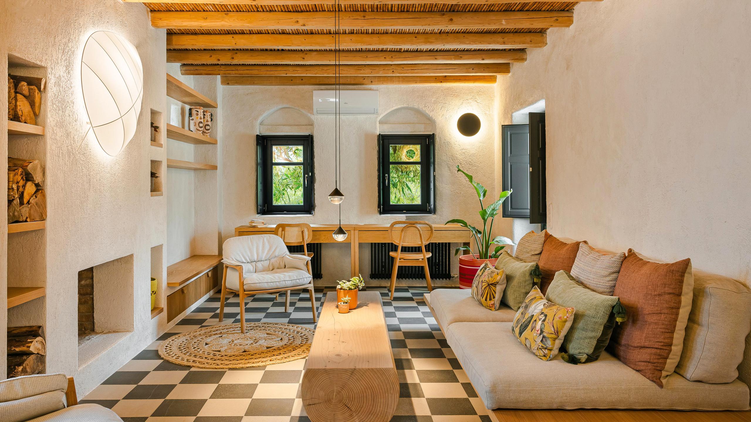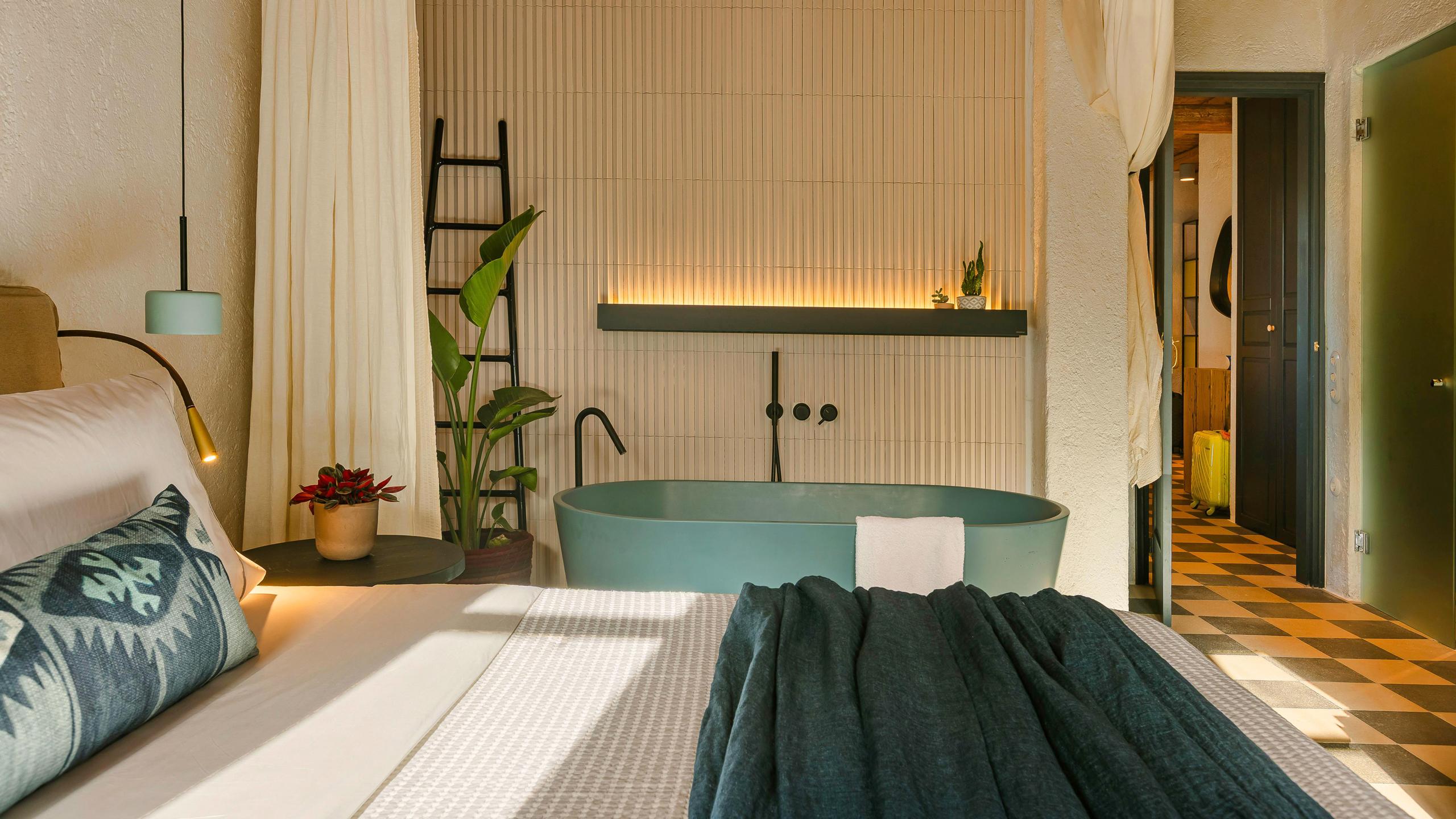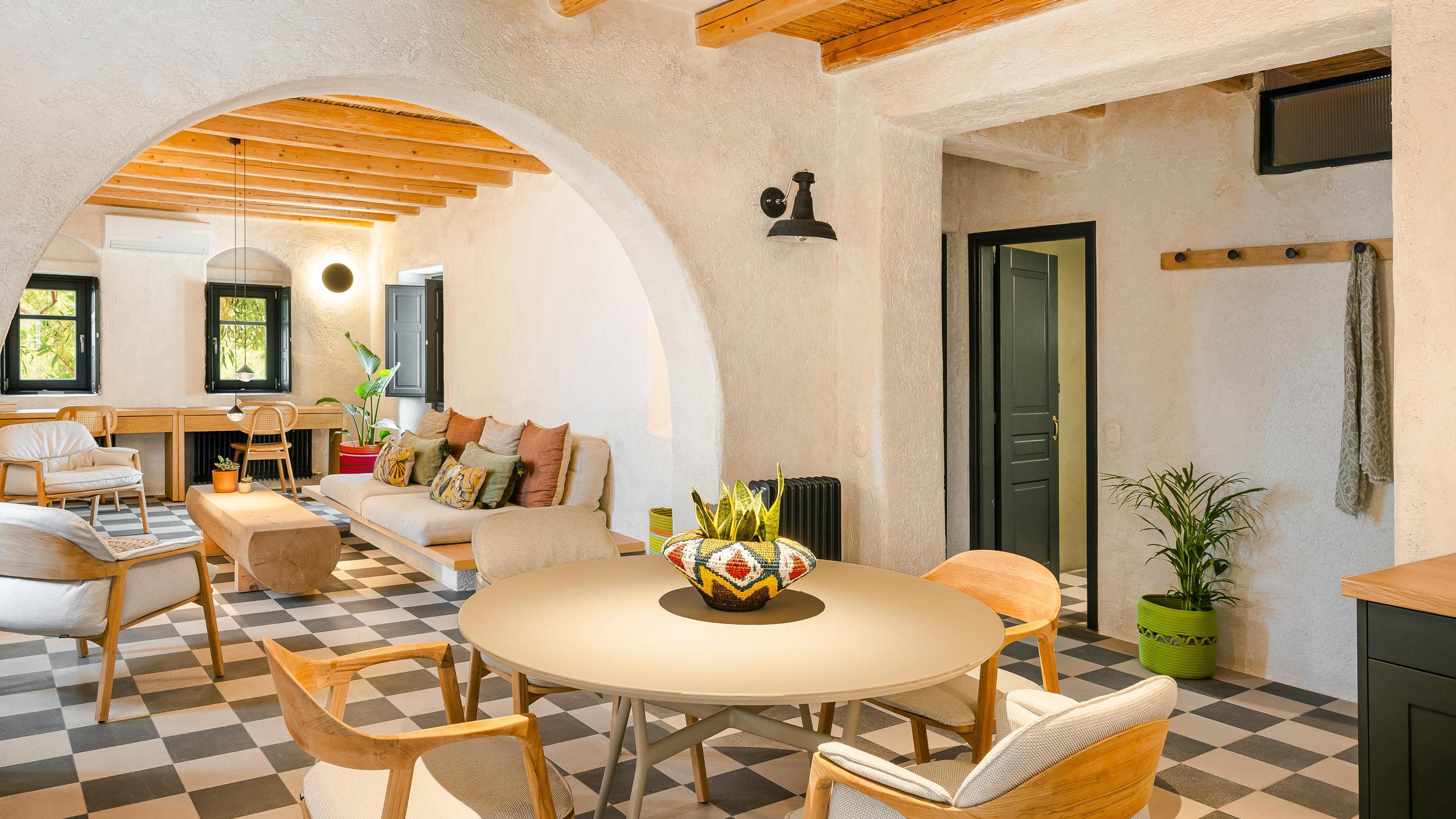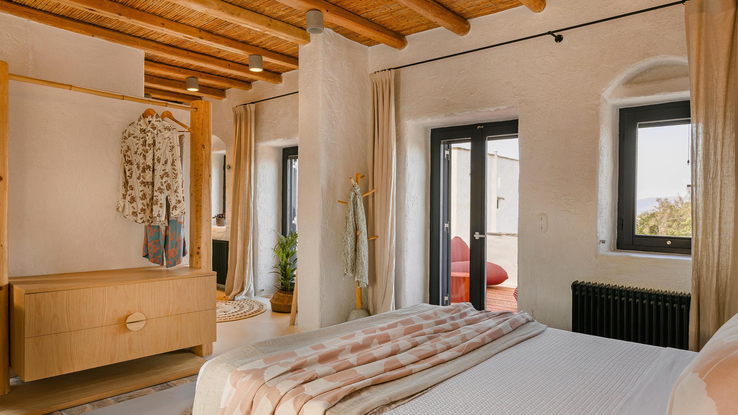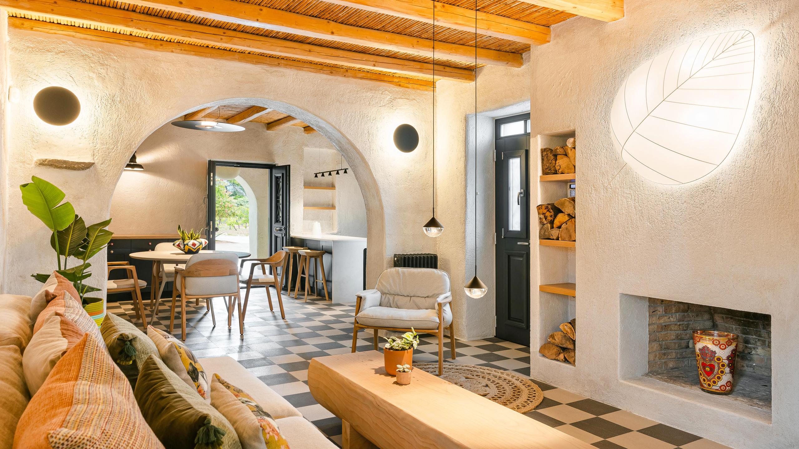 Gli interni riprendono perfettamente lo stesso filo conduttore, con un'atmosfera accogliente e fresca allo stesso tempo, e una scelta di arredi particolarmente singolare ed interessante, con pezzi che ricordano gli anni '60 e '70 perfettamente inseriti e bilanciati in tutti gli ambienti. I colori e materiali utilizzati sono decisamente azzeccati e personalizzano tutti gli ambienti, sia le zone comuni, che le sei camere da letto equamente suddivise tra il corpo centrale e la guest house vicina, con pezzi unici, pavimenti e piastrelle diverse e dettagli estremamente apprezzabili.